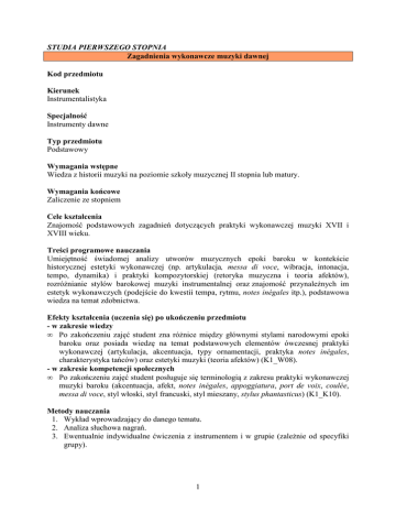 STUDIA PIERWSZEGO STOPNIA Zagadnienia wykonawcze muzyki dawnej Kod przedmiotu Kierunek Instrumentalistyka Specjalność Instrumenty dawne Typ przedmiotu Podstawowy Wymagania wstępne Wiedza z historii muzyki na poziomie szkoły muzycznej II stopnia lub matury. Wymagania końcowe Zaliczenie ze stopniem Cele kształcenia Znajomość podstawowych zagadnień dotyczących praktyki wykonawczej muzyki XVII i XVIII wieku. Treści programowe nauczania Umiejętność świadomej analizy utworów muzycznych epoki baroku w kontekście historycznej estetyki wykonawczej (np. artykulacja, messa di voce, wibracja, intonacja, tempo, dynamika) i praktyki kompozytorskiej (retoryka muzyczna i teoria afektów), rozróżnianie stylów barokowej muzyki instrumentalnej oraz znajomość przynależnych im estetyk wykonawczych (podejście do kwestii tempa, rytmu, notes inégales itp.), podstawowa wiedza na temat zdobnictwa. Efekty kształcenia (uczenia się) po ukończeniu przedmiotu - w zakresie wiedzy • Po zakończeniu zajęć student zna różnice między głównymi stylami narodowymi epoki baroku oraz posiada wiedzę na temat podstawowych elementów ówczesnej praktyki wykonawczej (artykulacja, akcentuacja, typy ornamentacji, praktyka notes inégales, charakterystyka tańców) oraz estetyki muzyki (teoria afektów) (K1_W08). - w zakresie kompetencji społecznych • Po zakończeniu zajęć student posługuje się terminologią z zakresu praktyki wykonawczej muzyki baroku (akcentuacja, afekt, notes inégales, appoggiatura, port de voix, coulée, messa di voce, styl włoski, styl francuski, styl mieszany, stylus phantasticus) (K1_K10). Metody nauczania 1. Wykład wprowadzający do danego tematu. 2. Analiza słuchowa nagrań. 3. Ewentualnie indywidualne ćwiczenia z instrumentem i w grupie (zależnie od specyfiki grupy). 1 Nakład pracy studenta potrzebny do osiągnięcia efektów uczenia się ROK SEMESTR I Punkty ECTS Ilość godzin w semestrze Rodzaj zaliczenia LEGENDA II 1 2 2 2 30 30 zs zs 3 III 4 5 6 zal – zaliczony; zs – zaliczenie ze stopniem; egz – egzamin; ed – egzamin dyplomowy Kryteria oceny Aktywny udział w warsztatach grupowych podczas zajęć, realizacja zadanych prac. Zaliczenie pisemnego testu sprawdzającego wiedzę wyniesioną z zajęć oraz zadanej lektury. Literatura (piśmiennictwo) 1. Bach, C. Ph. E., Versuch űber die wahre Art das Clavier zu spielen, (1753, 1762) New York, 1949. 2. Boyden, D., Dzieje gry skrzypcowej od początków do roku 1761, Kraków 1980. 3. Brossard, S. de, Dictionnaire de musique (1707), tłum. E. Wałasek, “Canor” nr 34, 35. 4. Bukofzer, M., Muzyka w epoce baroku, Kraków 1970. 5. Geminiani, F. S., The Art of Playing on the Violin (1751), London 1952. 6. Harnoncourt, N., Muzyka mową dźwięków, Kraków 1995. 7. Hogwood, Ch., Frescobaldi o sztuce wykonawczej, „Canor” nr 17. 8. Holloway, J., Opus 5 Corellego: tekst, akt... i reakcja, „Canor” nr 21. 9. Lasocki, D., Quantz i namiętności. Teoria i praktyka, „Canor” nr 13. 10. Mozart, L., Grűndliche Violinschule (1756), tłum. K. Jerzewska (Gruntowna szkoła skrzypcowa), Poznań 2007. 11. Paczkowski, S., Nauka o afektach w myśli muzycznej I połowy XVII wieku, Lublin 1998. 12. Quantz, J. J., Versuch einer Anweisung... (1752), tłum. M. Nahajowski (O zasadach gry na flecie poprzecznym), Łódź 2012. 13. Sachs, C., Historia instrumentów muzycznych, Kraków 1975. 14. Wentz, J., O barokowym tempie i metrum, „Canor” nr 26. 15. Wolff, Ch., Bach i dziedzictwo XVII wieku, „Canor” nr 19. Język wykładowy Polski, angielski. Imię i nazwisko wykładowcy mgr Judyta Tupczyńska 2