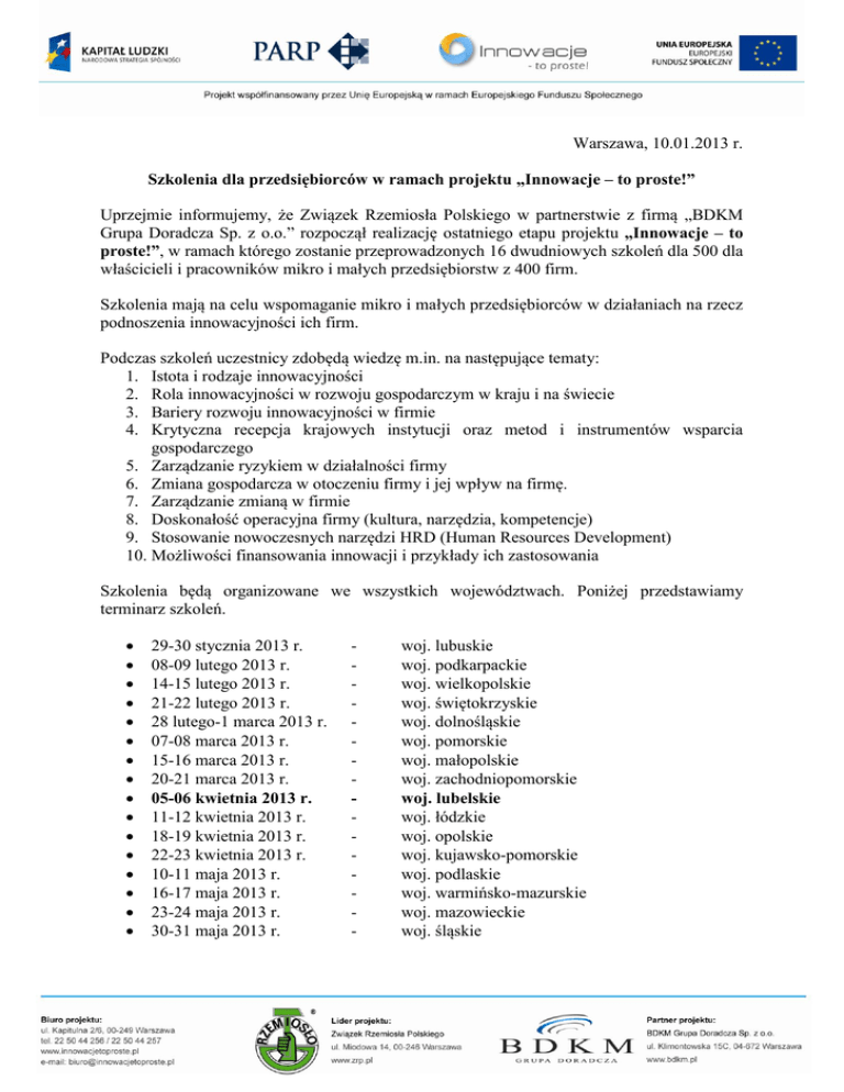 Warszawa, 10.01.2013 r. Szkolenia dla przedsiębiorców w ramach projektu „Innowacje – to proste!” Uprzejmie informujemy, że Związek Rzemiosła Polskiego w partnerstwie z firmą „BDKM Grupa Doradcza Sp. z o.o.” rozpoczął realizację ostatniego etapu projektu „Innowacje – to proste!”, w ramach którego zostanie przeprowadzonych 16 dwudniowych szkoleń dla 500 dla właścicieli i pracowników mikro i małych przedsiębiorstw z 400 firm. Szkolenia mają na celu wspomaganie mikro i małych przedsiębiorców w działaniach na rzecz podnoszenia innowacyjności ich firm. Podczas szkoleń uczestnicy zdobędą wiedzę m.in. na następujące tematy: 1. Istota i rodzaje innowacyjności 2. Rola innowacyjności w rozwoju gospodarczym w kraju i na świecie 3. Bariery rozwoju innowacyjności w firmie 4. Krytyczna recepcja krajowych instytucji oraz metod i instrumentów wsparcia gospodarczego 5. Zarządzanie ryzykiem w działalności firmy 6. Zmiana gospodarcza w otoczeniu firmy i jej wpływ na firmę. 7. Zarządzanie zmianą w firmie 8. Doskonałość operacyjna firmy (kultura, narzędzia, kompetencje) 9. Stosowanie nowoczesnych narzędzi HRD (Human Resources Development) 10. Możliwości finansowania innowacji i przykłady ich zastosowania Szkolenia będą organizowane we wszystkich województwach. Poniżej przedstawiamy terminarz szkoleń. 29-30 stycznia 2013 r. 08-09 lutego 2013 r. 14-15 lutego 2013 r. 21-22 lutego 2013 r. 28 lutego-1 marca 2013 r. 07-08 marca 2013 r. 15-16 marca 2013 r. 20-21 marca 2013 r. 05-06 kwietnia 2013 r. 11-12 kwietnia 2013 r. 18-19 kwietnia 2013 r. 22-23 kwietnia 2013 r. 10-11 maja 2013 r. 16-17 maja 2013 r. 23-24 maja 2013 r. 30-31 maja 2013 r. - woj. lubuskie woj. podkarpackie woj. wielkopolskie woj. świętokrzyskie woj. dolnośląskie woj. pomorskie woj. małopolskie woj. zachodniopomorskie woj. lubelskie woj. łódzkie woj. opolskie woj. kujawsko-pomorskie woj. podlaskie woj. warmińsko-mazurskie woj. mazowieckie woj. śląskie Dokładne miejsca szkoleń będą znane na ok. 3 tygodnie przed planowanym szkoleniem, o czym będziemy na bieżąco Państwa informowali. Wszystkie dokumenty rekrutacyjne są dostępne na naszej stronie internetowej projektu www.innowacjetoproste.pl oraz stronie Związku Rzemiosła Polskiego www.zrp.pl . Udział w szkoleniach jest bezpłatny. Uczestnikom zostanie zapewniony nocleg oraz wyżywienie. Istnieje również możliwość zwrotu kosztów dojazdu na szkolenie w kwocie do 80 zł/os. Zapraszamy serdecznie do udziału w szkoleniach mikro i małych przedsiębiorców w szczególności przedstawicieli zakładów rzemieślniczych. Wypełnione dokumenty rekrutacyjne należy przesłać wraz z załącznikami e-mailem na adres: [email protected] oraz pocztą na adres Biuro Projektu „Innowacje – to proste!”, ul. Kapitulna 2/6, 00-249 Warszawa najpóźniej na 7 dni roboczych przed terminem rozpoczęcia danego szkolenia. W przypadku pytań prosimy o kontakt telefoniczny z Biurem projektu: Pan Norbert Pruszanowski – kierownik projektu, tel. 22/50 44 256 Pani Renata Lewicka – asystent kierownika projektu, tel. 22/50 44 257, kom. 603 166 233 Pani Ewa Latoszek – koordynator ds. szkoleń, tel. 22 50 44 257 bądź mailowy na adres: [email protected]