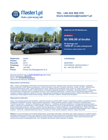 TEL. +48 222 905 570 [email protected] AUDI A4 2.0 TDI Multitronic PROMOCJA 96 099,00 zł 83 599,00 zł brutto W leasingu już: 1250.07 zł netto miesięcznie 36 miesięcy, opłata wstępna 10% Nadwozie: Paliwo: Rocznik: Przebieg: Moc: Firma: sedan ON 2013 71231 km 143 KM Prime Car Management S.A. Lokalizacja: MASTER1 KATOWICE, BOGUCICKA 7 tel. +48 222 905 570 Sprawdź bezpłatnie auto na historiapojazdu.gov.pl podając: Numer rejestracyjny: WD1576G Numer VIN: WAUZZZ8K9DA228177 Datę pierwszej rejestracji: 23.04.2013 Wyposażenie standardowe: ABS - system zapobiegający blokowaniu się kół podczas hamowania, Airbag 6 sztuk (czołowe poduszki kierowcy i pasażera, boczne poduszki- przód, kurtyny powietrzne), Czujnik ciśnienia w oponach, Dywaniki welurowe - przód i tył, EBV - elektroniczny rozdział sił hamowania, ESP - układ stabilizacji toru jazdy, Elektryczne podnoszenie szyb, przód i tył, Felgi aluminiowe 16 (10-ramienne) z ogumiem 225/55, Fotele przednie z manualną regulacją wysokości, Immobilizer, Instalacja radiowa + 8 głośników, Kierunkowskazy zintegrowane w lusterkach bocznych, Koło zapasowe dojazdowe, Lusterka boczne regulowane elektrycznie, Lusterka w kolorze nadwozia, Radio CD Chorus, Sygnalizacja niezapiętych pasów bezpieczeństwa, System Start/Stop z systemem rekuperacji, Wspomaganie układu kierowniczego, Zamek centralny z pilotem, Światła przeciwmgielne Wyposażenie dealerskie: Alarm, Audi parking system plus przód/tył+ wskaźnik wizualny na ekranie MMI, Czujnik zmierzchowy świateł z czujnikiem deszczu, Dodatkowe oświetlenie wnętrza, Fotele przednie ogrzewane, Fotele przednie sportowe, pakiet, Kierownica wielofunkcyjna 3-ramienna sportowa - skórzana, Klimatyzacja automatyczna - 3 strefowa, Komputer pokładowy z funkcją optymalizacji zużycia paliwa z kolorowym wyświetlaczem, Lakier metalik, Lampy ksenonowe PLUS ze spryskiwaczami i światłami do jazdy dziennej LED, Listwy wokół szyb bocznych, srebrne, Lusterka boczne ogrzewane, Lusterko wsteczne z ukł. p/oślepieniowym, Pakiet Schowek, Przedni podłokietnik, Rolety przeciwsłoneczne szyb tylnych bocznych, System nawigacji satelitarnej MMI Navigation plus z dyskiem twardym - obraz 3D, Tapicerka tkaninowa Atrium, Tempomat, Tylne oparcie składane, dzielone, Złącze Bluetooth Master1 to punkt sprzedaży samochodów Masterlease, pierwszego właściciela. Wszystkie auta zostały zakupione w polskim salonie, posiadają wycenę rzeczoznawcy, były regularnie serwisowane podczas użytkowania i posiadają udokumentowaną historię zdarzeń serwisowych. W Master1.pl znajdziecie Państwo szeroki wachlarz ubezpieczeń komunikacyjnych. Nasza oferta skierowana jest zarówno do klientów indywidualnych jak i firm. Wszelkich formalności można dokonać na miejscu. Opis wygenerowano 28.02.2017 o 12:01 Strona 1 z 1