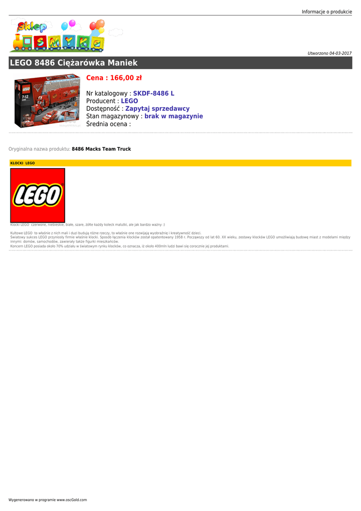 Informacje o produkcie Utworzono 04-03-2017 LEGO 8486 Ciężarówka Maniek Cena : 166,00 zł Nr katalogowy : SKDF-8486 L Producent : LEGO Dostępność : Zapytaj sprzedawcy Stan magazynowy : brak w magazynie Średnia ocena : Oryginalna nazwa produktu: 8486 Macks Team Truck KLOCKI LEGO Klocki LEGO czerwone, niebieskie, białe, szare, żółte każdy koleck malutki, ale jak bardzo ważny :) Kultowe LEGO to właśnie z nich mali i duzi budują różne rzeczy, to właśnie one rozwijają wyobraźnię i kreatywność dzieci. Światowy sukces LEGO przyniosły firmie właśnie klocki. Sposób łączenia klocków został opatentowany 1958 r. Począwszy od lat 60. XX wieku, zestawy klocków LEGO umożliwiają budowę miast z modelami między innymi: domów, samochodów, zawierały także figurki mieszkańców. Koncern LEGO posiada około 70% udziału w światowym rynku klocków, co oznacza, iż około 400mln ludzi bawi się corocznie jej produktami. Wygenerowano w programie www.oscGold.com