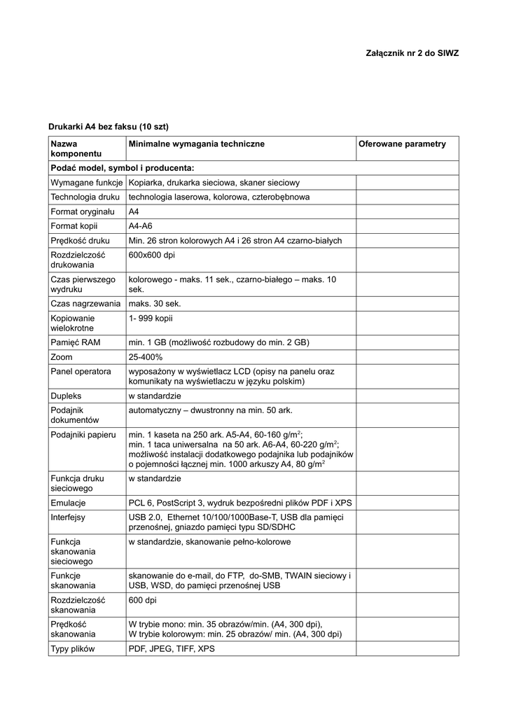 Załącznik nr 2 do SIWZ Drukarki A4 bez faksu (10 szt) Nazwa komponentu Minimalne wymagania techniczne Podać model, symbol i producenta: Wymagane funkcje Kopiarka, drukarka sieciowa, skaner sieciowy Technologia druku technologia laserowa, kolorowa, czterobębnowa Format oryginału A4 Format kopii A4-A6 Prędkość druku Min. 26 stron kolorowych A4 i 26 stron A4 czarno-białych Rozdzielczość drukowania 600x600 dpi Czas pierwszego wydruku kolorowego - maks. 11 sek., czarno-białego – maks. 10 sek. Czas nagrzewania maks. 30 sek. Kopiowanie wielokrotne 1- 999 kopii Pamięć RAM min. 1 GB (możliwość rozbudowy do min. 2 GB) Zoom 25-400% Panel operatora wyposażony w wyświetlacz LCD (opisy na panelu oraz komunikaty na wyświetlaczu w języku polskim) Dupleks w standardzie Podajnik dokumentów automatyczny – dwustronny na min. 50 ark. Podajniki papieru min. 1 kaseta na 250 ark. A5-A4, 60-160 g/m 2; min. 1 taca uniwersalna na 50 ark. A6-A4, 60-220 g/m 2; możliwość instalacji dodatkowego podajnika lub podajników o pojemności łącznej min. 1000 arkuszy A4, 80 g/m 2 Funkcja druku sieciowego w standardzie Emulacje PCL 6, PostScript 3, wydruk bezpośredni plików PDF i XPS Interfejsy USB 2.0, Ethernet 10/100/1000Base-T, USB dla pamięci przenośnej, gniazdo pamięci typu SD/SDHC Funkcja skanowania sieciowego w standardzie, skanowanie pełno-kolorowe Funkcje skanowania skanowanie do e-mail, do FTP, do-SMB, TWAIN sieciowy i USB, WSD, do pamięci przenośnej USB Rozdzielczość skanowania 600 dpi Prędkość skanowania W trybie mono: min. 35 obrazów/min. (A4, 300 dpi), W trybie kolorowym: min. 25 obrazów/ min. (A4, 300 dpi) Typy plików PDF, JPEG, TIFF, XPS Oferowane parametry Możliwość rozbudowy Podajniki papieru na min. 1000 ark. formatu A4, 80 g/m 2; Twardy dysk o pojemności min. 120 GB Materiały eksploatacyjne jako wyposażenie standardowe (dostarczone w komplecie w ramach oferowanej ceny jednostkowej). Toner - właściwa ilość, która zapewni wydrukowanie minimum 2 000 stron kolorowych A4 (zgodnie z ISO19798) Bęben - właściwa ilość, która zapewni wydrukowanie minimum 200 000 stron kolorowych A4 Gwarancja 24 miesięczna gwarancja producenta. Wymagania dodatkowe Oświadczenie producenta sprzętu lub jego autoryzowanego przedstawiciela w Polsce, że w przypadku nie wywiązywania się z obowiązków gwarancyjnych oferenta lub firmy serwisującej przejmie na siebie wszelkie zobowiązania związane z serwisem - dokumenty potwierdzające dołączyć do oferty, W przypadku gdy oferentem jest autoryzowany przedstawiciel producenta oświadczenia nie wymaga się Certyfikat ISO 14001:2004 producenta oferowanego sprzętu - dokument potwierdzający załączyć do oferty Certyfikat ISO 9001:2008 producenta oferowanego sprzętu - dokument potwierdzający załączyć do oferty Drukarki A4 z faksem (1 szt) Nazwa komponentu Minimalne wymagania techniczne Podać model, symbol i producenta: Wymagane funkcje kopiarka, drukarka sieciowa, kolorowy skaner sieciowy, faks Technologia druku technologia laserowa Format oryginału A4 Format kopii A4-A6 Prędkość druku 35 stron A4 / min. Rozdzielczość drukowania min. 1800x600 dpi Czas pierwszego wydruku maks. 7 sek Czas nagrzewania maks. 20 sek Pobór mocy w Max. 500W (+/-) 10% czasie drukowania Kopiowanie wielokrotne 1- 999 kopii Pamięć RAM min. 512 MB (możliwość rozbudowy do min. 1,5 GB) Zoom 25-400% Panel operatora wyposażony w wyświetlacz LCD (opisy na panelu oraz komunikaty na wyświetlaczu w języku polskim) Dupleks w standardzie Podajnik dokumentów automatyczny – dwustronny na min. 50 ark. Oferowane parametry Podajniki papieru min. 1 kaseta na 250 ark. A5-A4, 60-160 g/m 2; Podajnik ręczny min. 100 ark. A6-A3, 60-256 g/m2 Gramatura papieru Drukowanie na papierze o gramaturze 220g/m2 Bębny drukujące na min. 200.000 kolorowych wydruków A4 Funkcja druku sieciowego w standardzie, drukowanie pełnokolorowe Emulacje PCL 6, PostScript 3 Interfejsy USB 2.0, Ethernet 10/100/1000Base-T, USB dla pamięci przenośnej, gniazdo karty SD Funkcja skanowania sieciowego w standardzie, skanowanie pełno-kolorowe Funkcje skanowania skanowanie do e-mail, do FTP, do-SMB, TWAIN sieciowy i USB, WSD, do pamięci przenośnej USB Rozdzielczość skanowania 600 dpi Prędkość skanowania Mono: min. 30 str./min., kolor: min. 14 str. / min. (300 dpi/A4) Interfejs skanera 10/100/1000 Base-T Typy plików PDF, JPEG, TIFF, XPS Możliwość rozbudowy Dodatkowy podajnik/podajniki papieru, o pojemności łącznej min. 500 ark. formatu A4 – A5, 80 g/m2 Faks Standard Super G3 Prędkość modemu do 33,6 kpbs Książka adresowa min. 200 adresatów Odbiór do pamięci min. 256 stron Materiały eksploatacyjne jako wyposażenie standardowe (dostarczone w komplecie w ramach oferowanej ceny jednostkowej). Tonery - właściwa ilość tonerów, która zapewni wydrukowanie minimum 3 000 stron A4 przy pokryciu zgodnie z ISO19752. Bębny - właściwa ilość tonerów, która zapewni wydrukowanie minimum 100 000 stron A4. Dostarczone materiały muszą być nowe i nieużywane, pierwszej kategorii oraz wyprodukowane przez producenta oferowanych urządzeń. Gwarancja 24 miesięczna gwarancja producenta. Wymagania dodatkowe Oświadczenie producenta sprzętu lub jego autoryzowanego przedstawiciela w Polsce, że w przypadku nie wywiązywania się z obowiązków gwarancyjnych oferenta lub firmy serwisującej przejmie na siebie wszelkie zobowiązania związane z serwisem - dokumenty potwierdzające dołączyć do oferty, W przypadku gdy oferentem jest autoryzowany przedstawiciel producenta oświadczenia nie wymaga się Certyfikat ISO 14001:2004 producenta oferowanego sprzętu - dokument potwierdzający załączyć do oferty Certyfikat ISO 9001:2008 producenta oferowanego sprzętu - dokument potwierdzający załączyć do oferty Drukarki A3 bez faksu (2 szt) Nazwa komponentu Minimalne wymagania techniczne Podać model, symbol i producenta: Wymagane funkcje Kopiarka, drukarka siecio