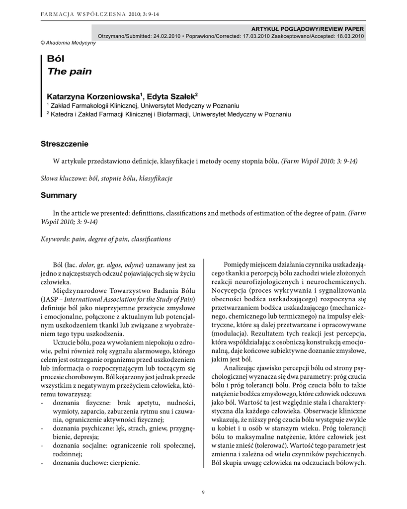 FA R M A C J A W S P Ó Ł C Z E S N A 2010; 3: 9-14 ARTYKUŁ POGLĄDOWY/REVIEW PAPER © Akademia Medycyny Otrzymano/Submitted: 24.02.2010 • Poprawiono/Corrected: 17.03.2010 Zaakceptowano/Accepted: 18.03.2010 Ból The pain Katarzyna Korzeniowska1, Edyta Szałek2 Zakład Farmakologii Klinicznej, Uniwersytet Medyczny w Poznaniu Katedra i Zakład Farmacji Klinicznej i Biofarmacji, Uniwersytet Medyczny w Poznaniu 1 2 Streszczenie W artykule przedstawiono definicje, klasyfikacje i metody oceny stopnia bólu. (Farm Współ 2010; 3: 9-14) Słowa kluczowe: ból, stopnie bólu, klasyfikacje Summary In the article we presented: definitions, classifications and methods of estimation of the degree of pain. (Farm Współ 2010; 3: 9-14) Keywords: pain, degree of pain, classifications Ból (łac. dolor, gr. algos, odyne) uznawany jest za jedno z najczęstszych odczuć pojawiających się w życiu człowieka. Międzynarodowe Towarzystwo Badania Bólu (IASP – International Association for the Study of Pain) definiuje ból jako nieprzyjemne przeżycie zmysłowe i emocjonalne, połączone z aktualnym lub potencjalnym uszkodzeniem tkanki lub związane z wyobrażeniem tego typu uszkodzenia. Uczucie bólu, poza wywołaniem niepokoju o zdrowie, pełni również rolę sygnału alarmowego, którego celem jest ostrzeganie organizmu przed uszkodzeniem lub informacja o rozpoczynającym lub toczącym się procesie chorobowym. Ból kojarzony jest jednak przede wszystkim z negatywnym przeżyciem człowieka, któremu towarzyszą: - doznania fizyczne: brak apetytu, nudności, wymioty, zaparcia, zaburzenia rytmu snu i czuwania, ograniczenie aktywności fizycznej; - doznania psychiczne: lęk, strach, gniew, przygnębienie, depresja; - doznania socjalne: ograniczenie roli społecznej, rodzinnej; - doznania duchowe: cierpienie. Pomiędy miejscem działania czynnika uszkadzającego tkanki a percepcją bólu zachodzi wiele złożonych reakcji neurofizjologicznych i neurochemicznych. Nocycepcja (proces wykrywania i sygnalizowania obecności bodźca uszkadzającego) rozpoczyna się przetwarzaniem bodźca uszkadzającego (mechanicznego, chemicznego lub termicznego) na impulsy elektryczne, które są dalej przetwarzane i opracowywane (modulacja). Rezultatem tych reakcji jest percepcja, która współdziałając z osobniczą konstrukcją emocjonalną, daje końcowe subiektywne doznanie zmysłowe, jakim jest ból. Analizując zjawisko percepcji bólu od strony psychologicznej wyznacza się dwa parametry: próg czucia bólu i próg tolerancji bólu. Próg czucia bólu to takie natężenie bodźca zmysłowego, które człowiek odczuwa jako ból. Wartość ta jest względnie stała i charakterystyczna dla każdego człowieka. Obserwacje kliniczne wskazują, że niższy próg czucia bólu występuje zwykle u kobiet i u osób w starszym wieku. Próg tolerancji bólu to maksymalne natężenie, które człowiek jest w stanie znieść (tolerować). Wartość tego parametr jest zmienna i zależna od wielu czynników psychicznych. Ból skupia uwagę człowieka na odczuciach bólowych. 9 FA R M A C J A W S P Ó Ł C Z E S N A 2010; 3: 9-14 Koncentracja uwagi pacjenta na bólu wpływa na odczucie bólu subiektywnie go zwiększając [1,2]. Podstawą diagnostyki i klasyfikacji bólu jest zebranie szczegółowego wywiadu bólowego z pacjentem, który pozwala na określenie: 1) lokalizacji bólu (miejsce odczuwania maksymalnego bólu, jego promieniowanie i rozprzestrzenianie); 2) czasu trwania bólu (ból przerywany czy ciągły, występowanie okresów bezbólowych lub o niewielkim natężeniu bólu); 3) przebiegu bólu (ból pojawiający się nagle czy stopniowo); 4) jakości bólu (określenie charakterystyki bólu, np. ból przeszywający, pulsujący); 5) natężenia bólu (wskazanie na numerycznej lub wizualnej skali bólu natężenia bólu odczuwanego w danym momencie); 6) objawów towarzyszących (np. nudności, wymioty, obrzęk, osłabienie); 7) zachowania podczas bólu (ograniczenie aktywności ruchowej, zmiany w diecie); 8) dotychczasowego leczenia (metody farmakologiczne i niefarmakologiczne, brak skuteczności danej terapii, działania niepożądane warunkujące przerwanie terapii) [3]. Ocena natężenia bólu u dorosłych Istnieje wiele narzędzi pomagających określić natężenie odczuwanego bólu. Prawidłowa ocena natężenia bólu jest podstawą racjonalnej farmakoterapii. Problem z oceną wynika z faktu, że jest ona oparta na słownej relacji chorego, która ma charakter subiektywny i podlega wpływom jego emocji i odczuć. Do najczęściej stosowanych metod pomiaru bólu należy kwestionariusz Melzacka (Rycina 1), którego zaletą jest możliwość jakościowej i ilościowej oceny doznań badanego, z uwzględnieniem społeczno- A. PROSZĘ OPISAĆ BÓL ODCZUWANY PRZEZ PANA/PANIĄ PODCZAS OSTATNIEGO TYGODNIA (proszę postawić X w jeden kwadrat w każdej linijce.) Brak Łagodny Umiarkowany Silny 1. Rwący 2. Przeszywający 3. Kłujący 4. Ostry 5. Skurczowy 6. Gryzący 7. Gorący/Palący 8. Uciążliwy 9. Ciężki 10.Pojawiający się przy dotknięciu chorego miejsca 11. Rozsadzający 12.Wyczerpujący/Męczący 13.Powodujący mdłości 14.Straszliwy 15.Bezlitosny/Okrutny B. PROSZĘ OCENIĆ BÓL ODCZUWANY PRZEZ PANA/PANIĄ PODCZAS OSTATNIEGO TYGODNIA Poniższa linia przedstawia ból o wzrastającym nasileniu: od „brak bólu” do „najgorszy ból z możliwych”. Proszę umieścić kreskę (I) w poprzek tej linii w miejscu, które najlepiej określa ból odczuwany przez Pana/Panią podczas ostatniego tygodnia. Najgorszy ból z możliwych Brak bólu C. NASILENIE OBECNIE ODCZUWANEGO BÓLU Brak bólu Łagodny Umiarkowany Silny Bardzo silny Nie do wytrzymania Rycina 1. Kwestionariusz McGill dotyczący bólu – skrócona wersja 10 □□□ wynik w mm (wypełnia badacz) FA R M A C J A W S P Ó Ł C Z E S N A 2010; 3: 9-14 psychologicznych czynników wpływających na percepcję bólu. Inną metodą używaną do oceny stopnia n
