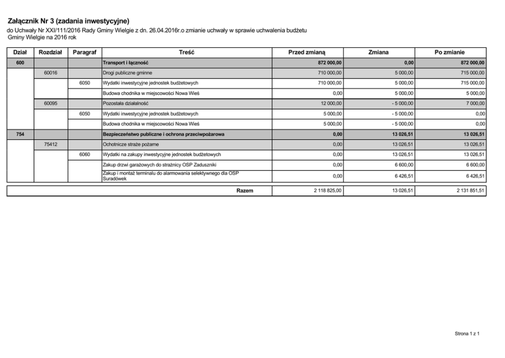 Załącznik Nr 3 (zadania inwestycyjne) do Uchwały Nr XXI/111/2016 Rady Gminy Wielgie z dn. 26.04.2016r.o zmianie uchwały w sprawie uchwalenia budżetu Gminy Wielgie na 2016 rok Dział 600 Rozdział 60016 60095 754 75412 Paragraf 6050 6050 Transport i łączność Treść Przed zmianą 872 000,00 Drogi publiczne gminne Wydatki inwestycyjne jednostek budżetowych Pozostała działalność Wydatki inwestycyjne jednostek budżetowych Bezpieczeństwo publiczne i ochrona przeciwpożarowa 6060 5 000,00 0,00 5 000,00 - 5 000,00 5 000,00 - 5 000,00 0,00 Ochotnicze straże pożarne 0,00 Wydatki na zakupy inwestycyjne jednostek budżetowych 0,00 Zakup drzwi garażowych do strażnicy OSP Zaduszniki Zakup i montaż terminalu do alarmowania selektywnego dla OSP Suradówek Razem 5 000,00 12 000,00 5 000,00 Budowa chodnika w miejscowości Nowa Wieś 0,00 710 000,00 710 000,00 Budowa chodnika w miejscowości Nowa Wieś Zmiana 0,00 0,00 2 118 825,00 - 5 000,00 Po zmianie 872 000,00 715 000,00 715 000,00 5 000,00 7 000,00 0,00 0,00 13 026,51 13 026,51 13 026,51 13 026,51 13 026,51 6 600,00 6 426,51 13 026,51 13 026,51 6 600,00 6 426,51 2 131 851,51 Strona 1 z 1