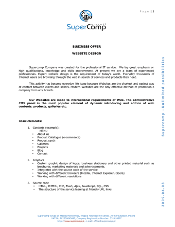 P a g e | 1 BUSINESS OFFER Supercomp Company was created for the professional IT service. We lay great emphasis on high qualifications, knowledge and skills improvement. At present we are a team of experienced professionals. Expert website design is the requirement of today's world. Everyday thousands of Internet users are browsing through the web in search of services and products they need. This activity has become everyday life issue because Websites are the shortest and easiest way of contact between clients and sellers. Modern Websites are the only effective method of promotion a company from any branch. Our Websites are made to international requirements of W3C. The administrative CMS panel is the most popular element of dynamic introducing and edition of web contents, products, galleries etc. Basic elements: 1. Contents (example): MENU: • About us • Product Catalogue (e-commerce) • Product serch • Galleries • Projects • Blog • Contact Supercomp –Unlimited possibilities WEBSITE DESIGN Supercomp Grupa IT Maciej Monkiewicz, Wojska Polskiego 64 Street, 70-479 Szczecin, Poland VAT No PL2530043685, Company Registration Number: 331410807 http://www.supercomp.pl, e-mail: [email protected] 3. Source code • HTML, XHTML, PHP, Flash, Ajax, JavaScript, SQL, CSS • The structure of the service leaning at friendly URL links 2009.04.08 2. Graphics • Custom graphic design of logos, business stationery and other printed material such as brochures, marketing materials and advertisements. • Integrated with the source code of the service • Working with different browsers (Mozilla, Internet Explorer, Opera) • Working with different resolutions P a g e | 2 Web Page and modules: No Service Netto price 1. Web made with method: HTML, XHTML, PHP, Ajax, JavaScript, SQL, CSS from £ 550 2. Web made with method: XHTML, Flash, SQL, JavaScript from £ 750 3. Additional module: e-commerce from £ 800 4. Flash intro from £ 150 Additional moduls: No Service Netto price 1. Locating of the service on server free 2. Service connecting to the indicated domain free 3. Data input / per unit 4. Content management / month £ 0,50 Supercomp –Unlimited possibilities PRICES from £ 150 Supercomp Grupa IT Maciej Monkiewicz, Wojska Polskiego 64 Street, 70-479 Szczecin, Poland VAT No PL2530043685, Company Registration Number: 331410807 http://www.supercomp.pl, e-mail: [email protected] Kind ragards Maciej Monkiewicz 2009.04.08 Realization time: from 14 days, depending on the accessibility of materials and their quantity.