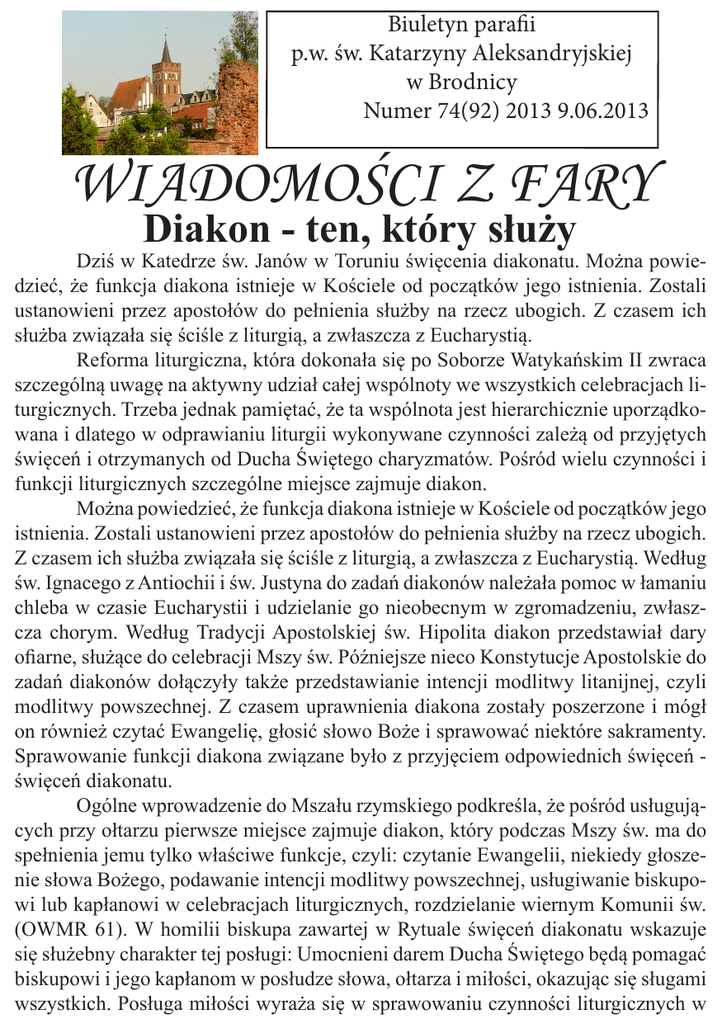 Biuletyn parafii p.w. św. Katarzyny Aleksandryjskiej w Brodnicy Numer 74(92) 2013 9.06.2013 WIADOMOŚCI Z FARY Diakon - ten, który służy Dziś w Katedrze św. Janów w Toruniu święcenia diakonatu. Można powiedzieć, że funkcja diakona istnieje w Kościele od początków jego istnienia. Zostali ustanowieni przez apostołów do pełnienia służby na rzecz ubogich. Z czasem ich służba związała się ściśle z liturgią, a zwłaszcza z Eucharystią. Reforma liturgiczna, która dokonała się po Soborze Watykańskim II zwraca szczególną uwagę na aktywny udział całej wspólnoty we wszystkich celebracjach liturgicznych. Trzeba jednak pamiętać, że ta wspólnota jest hierarchicznie uporządkowana i dlatego w odprawianiu liturgii wykonywane czynności zależą od przyjętych święceń i otrzymanych od Ducha Świętego charyzmatów. Pośród wielu czynności i funkcji liturgicznych szczególne miejsce zajmuje diakon. Można powiedzieć, że funkcja diakona istnieje w Kościele od początków jego istnienia. Zostali ustanowieni przez apostołów do pełnienia służby na rzecz ubogich. Z czasem ich służba związała się ściśle z liturgią, a zwłaszcza z Eucharystią. Według św. Ignacego z Antiochii i św. Justyna do zadań diakonów należała pomoc w łamaniu chleba w czasie Eucharystii i udzielanie go nieobecnym w zgromadzeniu, zwłaszcza chorym. Według Tradycji Apostolskiej św. Hipolita diakon przedstawiał dary ofiarne, służące do celebracji Mszy św. Późniejsze nieco Konstytucje Apostolskie do zadań diakonów dołączyły także przedstawianie intencji modlitwy litanijnej, czyli modlitwy powszechnej. Z czasem uprawnienia diakona zostały poszerzone i mógł on również czytać Ewangelię, głosić słowo Boże i sprawować niektóre sakramenty. Sprawowanie funkcji diakona związane było z przyjęciem odpowiednich święceń święceń diakonatu. Ogólne wprowadzenie do Mszału rzymskiego podkreśla, że pośród usługujących przy ołtarzu pierwsze miejsce zajmuje diakon, który podczas Mszy św. ma do spełnienia jemu tylko właściwe funkcje, czyli: czytanie Ewangelii, niekiedy głoszenie słowa Bożego, podawanie intencji modlitwy powszechnej, usługiwanie biskupowi lub kapłanowi w celebracjach liturgicznych, rozdzielanie wiernym Komunii św. (OWMR 61). W homilii biskupa zawartej w Rytuale święceń diakonatu wskazuje się służebny charakter tej posługi: Umocnieni darem Ducha Świętego będą pomagać biskupowi i jego kapłanom w posłudze słowa, ołtarza i miłości, okazując się sługami wszystkich. Posługa miłości wyraża się w sprawowaniu czynności liturgicznych w czasie Mszy św., w udzielaniu chrztu, asystowaniu przy zawieraniu małżeństw, noszeniu wiatyku do chorych, przewodniczeniu obrzędom pogrzebu. Przede wszystkim jednak diakoni tak ściśle związani z ołtarzem Chrystusa w imieniu biskupa mają spełniać dzieła miłosierdzia, czyli służyć i pomagać chorym i ubogim. Wzorem dla nich staje się sam Chrystus, który przyszedł służyć, a nie po to, aby Jemu służono. W czasie święceń diakonatu wybrani i odpowiednio przygotowani kandydaci przez włożenie rąk biskupa otrzymują dar Ducha Świętego, który uzdalnia ich do służby. W modlitwie konsekracyjnej biskup prosi dla nich o szczególne łaski, aby oznaczali się wszystkimi cnotami, miłością bez obłudy, troskliwością o chorych i biednych, powagą pełną pokory, czystością bez skazy i duchową karnością. Poza tym diakoni wezwani są do nieustannego dawania świadectwa swoim życiem, przestrzegania przykazań i w końcu specjalnym przyrzeczeniem zobowiązują się także do życia w celibacie. MODLITWA OJCA ŚWIĘTEGO BENDYKTA XVI W INTENCJI POWOŁAŃ Ojcze, spraw, by wśród chrześcijan rozkwitały liczne i święte powołania kapłańskie, które będą podtrzymywały żywą wiarę i strzegły wdzięczną pamięć o Twoim Synu Jezusie poprzez głoszenie Jego słowa i sprawowani Sakramentów, za pomocą których nieustannie odnawiasz Twoich wiernych. Daj nam świętych szafarzy Twojego ołtarza, którzy będą mądrymi i żarliwymi stróżami Eucharystii, Sakramentu najwyższego daru Chrystusa dla zbawienia świata. Powołuj sługi Twego miłosierdzia, którzy poprzez sakrament Pojednania będą rozszerzać radość Twojego przebaczenia. Spraw, Panie, by Kościół przyjmował z radością liczne natchnienia Ducha Twojego Syna i posłuszny Jego wskazaniom troszczył się o powołanie kapłańskie i do życia konsekrowanego. Wspieraj Biskupów, kapłanów i diakonów, osoby konsekrowane i wszystkich ochrzczonych w Chrystusie, aby wiernie wypełniali swoje posłannictwo w służbie Ewangelii. Prosimy o to przez Chrystusa naszego Pana. Amen. Intencje Mszalne 10.06 – 16.06.2013 r. 6.30 6.30 Poniedziałek 10.06.2013 + Romuald i Pelagia Stefańscy. Dziękczynna w 35 rocz. ślubu z prośbą o dalsze Boże błog. i opiekę Matki Bożej dla całej rodziny. 7.00 + Joanna i Franciszek Wysoccy. 7.00 + Jan Klafta; synowie: Wincenty, Tadeusz, Andrzej. 8.00 + Leokadia i Franciszek Domżalscy; zm. z rodziny. 18.30 + Mirosław Bajor – 17 r. śm; zm. z rodziny. 18.30 + Teresa Jagielska w rocz. śm. 18.30 + Jan i Tekla Kawiak. Wtorek 11.06.2013 Środa 12.06.2013 6.30 7.00 7.00 8.00 18.30 18.30 6.30 7.00 7.00 8.00 18.30 18.30 18.30 6.30 Czwartek 13.06.2013 Piątek 14.06.2013 Sobota 15.06.2013 XI Niedziela Zwykła 16.06.2013 Kościół szkolny 6.30 7.00 8.00 18.30 18.30 6.30 6.30 7.00 8.00 18.30 18.30 18.30 6.30 7.00 7.00 8.00 18.30 18.30 18.30 6.30 8.00 9.30 11.00 12.15 12.15 18.30 8.30 10.00 11.30 REZERWACJA. + Salomea i Antoni Sokołowscy. + Tomasz Zielaskiewicz – 4 r. śm; Roman Zielaskiewicz ; Zygmunt Kopiczyński. + mąż Henryk Płoszyński – 8 r. śm; syn Henryk Płoszyński. REZERWACJA. + Stanisława Ostrowska. O Boże błog. z racji urodzin dla Emilii Knedler. + Jadwiga Mąkosa – 1 r. śm. + Ks. Franciszek Malinowski. + Janina Trzuskowska i rodze