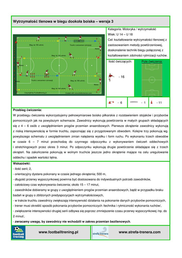 Wytrzymałość tlenowa w biegu dookoła boiska – wersja 3 Kategoria: Motoryka / wytrzymałość Wiek: U 14 – U 18 Cel: kształtowanie wytrzymałości tlenowej z zastosowaniem metody powtórzeniowej, doskonalenie techniki biegu połączonej z kształtowaniem zdolności rytmizacji ruchów. Ilość ćwiczących: Pole ćwiczenia: - 16 - 6 - 1 - 11 Przebieg ćwiczenia: W przebiegu ćwiczenia wykorzystujemy pełnowymiarowe boisko piłkarskie z rozstawieniem stojaków i przyborów pomocniczych jak na powyższym schemacie. Zawodnicy wykonują powtórzenia w małych grupach składających się z 4 – 6 osób z uwzględnieniem progów przemian anaerobowych. Pierwsze okrążenie zawodnicy wykonują z niską intensywnością w formie truchtu, zapoznając się z przygotowanym obwodem. Kolejne trzy pokonują wg. powyższego schematu z uwzględnieniem zmian natężenia wysiłku i form ruchu. Po wykonaniu trzech obwodów w czasie 6 – 7 minut przechodzą do czynnego odpoczynku z wykonywaniem ćwiczeń oddechowych i stretchingowych przez okres 3 minut. Po odpoczynku wykonują drugie powtórzenie składające się z trzech okrążeń. Na zakończenie pokonują w wolnym truchcie jeszcze jedno okrążenie mające na celu uregulowanie oddechu i spadek wartości tętna. Wskazówki: - ilość serii; 2, - orientacyjny dystans pokonany w czasie jednego okrążenia; 500 m, - długość przerwy wypoczynkowej powinna być dostosowana do indywidualnych potrzeb zawodników, - całościowy czas wykonywania ćwiczenia; około 15 – 17 minut, - zawodników dobieramy w grupy z uwzględnieniem progów przemian anaerobowych, bądź w przypadku braku badań w grupy o zbliżonych predyspozycjach wytrzymałościowych, - w trakcie truchtu zawodnicy zwiększają intensywność działania na pokonanie danych przyborów pomocniczych, - trener musi określić sposób pokonania przyborów pomocniczych /technika i rytmiczność wykonania ruchów/, - zwiększenie intensywności drugiej serii odbywa się poprzez zmniejszenie czasu przerwy wypoczynkowej /np. do 2 minut/, - zwracamy uwagę, by zawodnicy nie wchodzili w zakres przemian beztlenowych. www.footballtrening.pl www.strefa-trenera.com