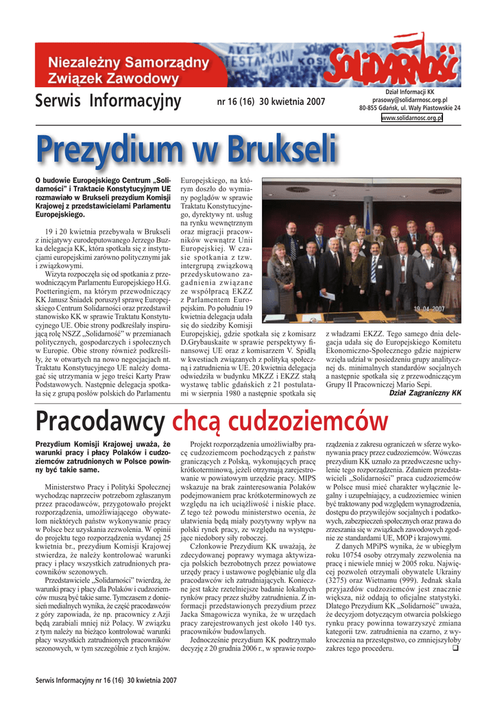 Serwis Informacyjny Dział Informacji KK [email protected] 80-855 Gdańsk, ul. Wały Piastowskie 24 www.solidarnosc.org.pl nr 16 (16) 30 kwietnia 2007 Prezydium w Brukseli O budowie Europejskiego Centrum „Solidarności” i Traktacie Konstytucyjnym UE rozmawiało w Brukseli prezydium Komisji Krajowej z przedstawicielami Parlamentu Europejskiego. 19 i 20 kwietnia przebywała w Brukseli z inicjatywy eurodeputowanego Jerzego Buzka delegacja KK, która spotkała się z instytucjami europejskimi zarówno politycznymi jak i związkowymi. Wizyta rozpoczęła się od spotkania z przewodniczącym Parlamentu Europejskiego H.G. Poetteringiem, na którym przewodniczący KK Janusz Śniadek poruszył sprawę Europejskiego Centrum Solidarności oraz przedstawił stanowisko KK w sprawie Traktatu Konstytucyjnego UE. Obie strony podkreślały inspirującą rolę NSZZ „Solidarność” w przemianach politycznych, gospodarczych i społecznych w Europie. Obie strony również podkreśliły, że w otwartych na nowo negocjacjach nt. Traktatu Konstytucyjnego UE należy domagać się utrzymania w jego treści Karty Praw Podstawowych. Następnie delegacja spotkała się z grupą posłów polskich do Parlamentu Europejskiego, na którym doszło do wymiany poglądów w sprawie Traktatu Konstytucyjnego, dyrektywy nt. usług na rynku wewnętrznym oraz migracji pracowników wewnątrz Unii Europejskiej. W czasie spotkania z tzw. intergrupą związkową przedyskutowano zagadnienia związane ze współpracą EKZZ z Parlamentem Europejskim. Po południu 19 kwietnia delegacja udała się do siedziby Komisji Europejskiej, gdzie spotkała się z komisarz D.Grybauskaite w sprawie perspektywy finansowej UE oraz z komisarzem V. Spidlą w kwestiach związanych z polityką społeczną i zatrudnienia w UE. 20 kwietnia delegacja odwiedziła w budynku MKZZ i EKZZ stałą wystawę tablic gdańskich z 21 postulatami w sierpnia 1980 a następnie spotkała się z władzami EKZZ. Tego samego dnia delegacja udała się do Europejskiego Komitetu Ekonomiczno-Społecznego gdzie najpierw wzięła udział w posiedzeniu grupy analitycznej ds. minimalnych standardów socjalnych a następnie spotkała się z przewodniczącym Grupy II Pracowniczej Mario Sepi. Dział Zagraniczny KK Pracodawcy chcą cudzoziemców Prezydium Komisji Krajowej uważa, że warunki pracy i płacy Polaków i cudzoziemców zatrudnionych w Polsce powinny być takie same. Ministerstwo Pracy i Polityki Społecznej wychodząc naprzeciw potrzebom zgłaszanym przez pracodawców, przygotowało projekt rozporządzenia, umożliwiającego obywatelom niektórych państw wykonywanie pracy w Polsce bez uzyskania zezwolenia. W opinii do projektu tego rozporządzenia wydanej 25 kwietnia br., prezydium Komisji Krajowej stwierdza, że należy kontrolować warunki pracy i płacy wszystkich zatrudnionych pracowników sezonowych. Przedstawiciele „Solidarności” twierdzą, że warunki pracy i płacy dla Polaków i cudzoziemców muszą być takie same. Tymczasem z doniesień medialnych wynika, że część pracodawców z góry zapowiada, że np. pracownicy z Azji będą zarabiali mniej niż Polacy. W związku z tym należy na bieżąco kontrolować warunki płacy wszystkich zatrudnionych pracowników sezonowych, w tym szczególnie z tych krajów. Serwis Informacyjny nr 16 (16) 30 kwietnia 2007 Projekt rozporządzenia umożliwiałby pracę cudzoziemcom pochodzących z państw graniczących z Polską, wykonujących pracę krótkoterminową, jeżeli otrzymają zarejestrowanie w powiatowym urzędzie pracy. MIPS wskazuje na brak zainteresowania Polaków podejmowaniem prac krótkoterminowych ze względu na ich uciążliwość i niskie płace. Z tego też powodu ministerstwo ocenia, że ułatwienia będą miały pozytywny wpływ na polski rynek pracy, ze względu na występujące niedobory siły roboczej. Członkowie Prezydium KK uważają, że zdecydowanej poprawy wymaga aktywizacja polskich bezrobotnych przez powiatowe urzędy pracy i ustawowe pogłębianie ulg dla pracodawców ich zatrudniających. Konieczne jest także rzetelniejsze badanie lokalnych rynków pracy przez służby zatrudnienia. Z informacji przedstawionych prezydium przez Jacka Smagowicza wynika, że w urzędach pracy zarejestrowanych jest około 140 tys. pracowników budowlanych. Jednocześnie prezydium KK podtrzymało decyzję z 20 grudnia 2006 r., w sprawie rozpo- rządzenia z zakresu ograniczeń w sferze wykonywania pracy przez cudzoziemców. Wówczas prezydium KK uznało za przedwczesne uchylenie tego rozporządzenia. Zdaniem przedstawicieli „Solidarności” praca cudzoziemców w Polsce musi mieć charakter wyłącznie legalny i uzupełniający, a cudzoziemiec winien być traktowany pod względem wynagrodzenia, dostępu do przywilejów socjalnych i podatkowych, zabezpieczeń społecznych oraz prawa do zrzeszania się w związkach zawodowych zgodnie ze standardami UE, MOP i krajowymi. Z danych MPiPS wynika, że w ubiegłym roku 10754 osoby otrzymały zezwolenia na pracę i niewiele mniej w 2005 roku. Najwięcej pozwoleń otrzymali obywatele Ukrainy (3275) oraz Wietnamu (999). Jednak skala przyjazdów cudzoziemców jest znacznie większa, niż oddają to oficjalne statystyki. Dlatego Prezydium KK „Solidarność” uważa, że decyzjom dotyczącym otwarcia polskiego rynku pracy powinna towarzyszyć zmiana kategorii tzw. zatrudnienia na czarno, z wykroczenia na przestępstwo, co zmniejszyłoby zakres tego procederu. Młoda „Solidarność” Młodzi związkowcy zrzeszeni w NSZZ „Solidarność” przekonują, że jedyną sprawdzoną formą walki z niskimi płacami, wyzyskiem i manipulacjami nieuczciwych pracodawców jest solidarne działanie. 26 kwietnia w Warszawie, w ramach Ogólnopolskiej Kampanii Społecznej „Niskie płace barierą rozwoju Polski”, spotkali się młodzi związkowcy z NSZZ „Solidarność”. Internetowe Badanie Wynagrodzeń, opublikowane na stronie www.wynagrodzenia.pl pokazuje, że realne pi