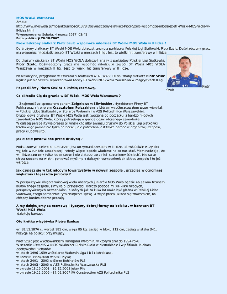 MOS WOLA Warszawa Źródło: http://www.moswola.pl/mos/aktualnosci/1378,Doswiadczony-siatkarz-Piotr-Szulc-wspomoze-mlodziez-BT-Wozki-MOS-Wola-wII-lidze.html Wygenerowano: Sobota, 4 marca 2017, 03:41 Data publikacji 26.10.2007 Doświadczony siatkarz Piotr Szulc wspomoże młodzież BT Wózki MOS Wola w II lidze ! Do drużyny siatkarzy BT Wózki MOS Wola dołączył, znany z parkietów Polskiej Ligi Siatkówki, Piotr Szulc. Doświadczony gracz ma wspomóc młodziutki zespół BT Wózki w meczach II ligi. Jest to wielki hit transferowy w II lidze. Do drużyny siatkarzy BT Wózki MOS WOLA dołączył, znany z parkietów Polskiej Ligi Siatkówki, Piotr Szulc. Doświadczony gracz ma wspomóc młodziutki zespół BT Wózki MOS WOLA Warszawa w meczach II ligi. Jest to wielki hit transferowy w II lidze. Po wakacyjnej przygodzie w Emiratach Arabskich w AL WASL Dubai znany siatkarz Piotr Szulc będzie już niebawem reprezentował barwy BT Wózki MOS Wola Warszawa w rozgrywkach II ligi. Poprosiliśmy Piotra Szulca o krótką rozmowę. Co skłoniło Cię do grania w BT Wózki MOS Wola Warszawa ? - Znajomość ze sponsorem panem Zbigniewem Śliwińskim , dyrektorem Firmy BT Polska oraz z trenerem Krzysztofem Felczakiem, z którym współpracowałem przez wiele lat w Polskiej Lidze Siatkówki , w Stolarce Wołomin i w AZS Politechnice Warszawskiej. Drugoligowa drużyna BT Wózki MOS Wola jest tworzona od początku, z bardzo młodych zawodników MOS Wola, którzy potrzebują wsparcia doświadczonego zawodnika. W dalszej perspektywie prezes Śliwiński chciałby awansu drużyny do Polskiej Ligi Siatkówki, trzeba więc pomóc nie tylko na boisku, ale potrzebna jest także pomoc w organizacji zespołu, pracy klubowej itp. Jakie cele postawiono przed drużyną ? Podstawowym celem na ten sezon jest utrzymanie zespołu w II lidze, ale właściwie wszystko wyjdzie w rundzie zasadniczej i wtedy więcej będzie wiadomo na co nas stać. Mam nadzieję , że w II lidze zagramy tylko jeden sezon i nie dlatego, że z niej spadniemy (śmiech). Nie są to słowa rzucane na wiatr , ponieważ myślimy o dalszych wzmocnieniach składu zespołu i to już wkrótce. Jak czujesz się w tak młodym towarzystwie w nowym zespole , przecież w ogromnej większości to jeszcze juniorzy ? W perspektywie długoterminowej wielu obecnych juniorów MOS Wola będzie na pewno trzonem budowanego zespołu, z myślą o przyszłości. Bardzo podoba mi się kilku młodych, perspektywicznych zawodników, o których już za kilka lat może być głośno w Polskiej Lidze Siatkówki, czego serdecznie tym chłopcom życzę. A współpraca układa się znakomicie, bo chłopcy bardzo dobrze pracują. A my dziękujemy za rozmowę i życzymy dobrej formy na boisku , w barwach BT Wózki MOS Wola. -dziękuję bardzo. Oto krótka wizytówka Piotra Szulca: ur. 19.11.1976 r., wzrost 191 cm, waga 95 kg, zasięg w bloku 313 cm, zasięg w ataku 341. Pozycja na boisku: przyjmujący. Piotr Szulc jest wychowankiem Huraganu Wołomin, w którym grał do 1994 roku. W sezonie 1994/95 w BBTS Włokniarz Bielsko Biała w ekstraklasie i w półfinale Pucharu Zdobywców Pucharów; w latach 1996-1999 w Stolarce Wołomin Liga I B i ekstraklasa, w sezonie 1999/2000 w Stali Nysa; w latach 2001 - 2003 w Skrze Bełchatów PLS w latach 2003 - 2005 w AZS Politechnika Warszawska PLS w okresie 15.10.2005 - 19.12.2005 Joker Piła w okresie 19.12.2005 - 27.08.2007 JW Construction AZS Politechnika PLS Szulc Piotr Komentarz (0) dodaj komentarz Brak komentarzy dodaj komentarz