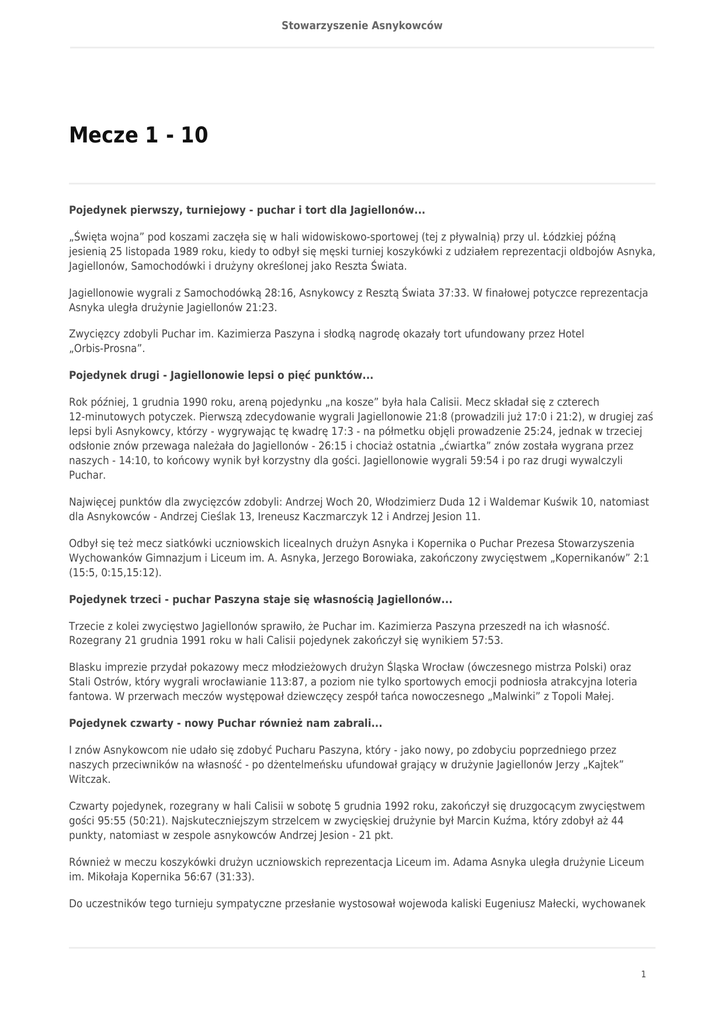 Stowarzyszenie Asnykowców Mecze 1 - 10 Pojedynek pierwszy, turniejowy - puchar i tort dla Jagiellonów... „Święta wojna” pod koszami zaczęła się w hali widowiskowo-sportowej (tej z pływalnią) przy ul. Łódzkiej późną jesienią 25 listopada 1989 roku, kiedy to odbył się męski turniej koszykówki z udziałem reprezentacji oldbojów Asnyka, Jagiellonów, Samochodówki i drużyny określonej jako Reszta Świata. Jagiellonowie wygrali z Samochodówką 28:16, Asnykowcy z Resztą Świata 37:33. W finałowej potyczce reprezentacja Asnyka uległa drużynie Jagiellonów 21:23. Zwycięzcy zdobyli Puchar im. Kazimierza Paszyna i słodką nagrodę okazały tort ufundowany przez Hotel „Orbis-Prosna”. Pojedynek drugi - Jagiellonowie lepsi o pięć punktów... Rok później, 1 grudnia 1990 roku, areną pojedynku „na kosze” była hala Calisii. Mecz składał się z czterech 12-minutowych potyczek. Pierwszą zdecydowanie wygrali Jagiellonowie 21:8 (prowadzili już 17:0 i 21:2), w drugiej zaś lepsi byli Asnykowcy, którzy - wygrywając tę kwadrę 17:3 - na półmetku objęli prowadzenie 25:24, jednak w trzeciej odsłonie znów przewaga należała do Jagiellonów - 26:15 i chociaż ostatnia „ćwiartka” znów została wygrana przez naszych - 14:10, to końcowy wynik był korzystny dla gości. Jagiellonowie wygrali 59:54 i po raz drugi wywalczyli Puchar. Najwięcej punktów dla zwycięzców zdobyli: Andrzej Woch 20, Włodzimierz Duda 12 i Waldemar Kuświk 10, natomiast dla Asnykowców - Andrzej Cieślak 13, Ireneusz Kaczmarczyk 12 i Andrzej Jesion 11. Odbył się też mecz siatkówki uczniowskich licealnych drużyn Asnyka i Kopernika o Puchar Prezesa Stowarzyszenia Wychowanków Gimnazjum i Liceum im. A. Asnyka, Jerzego Borowiaka, zakończony zwycięstwem „Kopernikanów” 2:1 (15:5, 0:15,15:12). Pojedynek trzeci - puchar Paszyna staje się własnością Jagiellonów... Trzecie z kolei zwycięstwo Jagiellonów sprawiło, że Puchar im. Kazimierza Paszyna przeszedł na ich własność. Rozegrany 21 grudnia 1991 roku w hali Calisii pojedynek zakończył się wynikiem 57:53. Blasku imprezie przydał pokazowy mecz młodzieżowych drużyn Śląska Wrocław (ówczesnego mistrza Polski) oraz Stali Ostrów, który wygrali wrocławianie 113:87, a poziom nie tylko sportowych emocji podniosła atrakcyjna loteria fantowa. W przerwach meczów występował dziewczęcy zespół tańca nowoczesnego „Malwinki” z Topoli Małej. Pojedynek czwarty - nowy Puchar również nam zabrali... I znów Asnykowcom nie udało się zdobyć Pucharu Paszyna, który - jako nowy, po zdobyciu poprzedniego przez naszych przeciwników na własność - po dżentelmeńsku ufundował grający w drużynie Jagiellonów Jerzy „Kajtek” Witczak. Czwarty pojedynek, rozegrany w hali Calisii w sobotę 5 grudnia 1992 roku, zakończył się druzgocącym zwycięstwem gości 95:55 (50:21). Najskuteczniejszym strzelcem w zwycięskiej drużynie był Marcin Kuźma, który zdobył aż 44 punkty, natomiast w zespole asnykowców Andrzej Jesion - 21 pkt. Również w meczu koszykówki drużyn uczniowskich reprezentacja Liceum im. Adama Asnyka uległa drużynie Liceum im. Mikołaja Kopernika 56:67 (31:33). Do uczestników tego turnieju sympatyczne przesłanie wystosował wojewoda kaliski Eugeniusz Małecki, wychowanek 1 Stowarzyszenie Asnykowców „Kopernika”. Pojedynek piąty - „zjazdowi” Asnykowcy i zwycięzcy Jagiellonowie... Ten piąty mecz odbył się 10 września 1993 roku w ramach XIII Zjazdu Wychowanków Gimnazjum i Liceum im. Adama Asnyka. W wypełnionej publicznością, która gorąco dopingowała obie drużyny, hali Calisii stoczono zacięty, emocjonujący pojedynek, zakończony kolejnym zwycięstwem Jagiellonów 59:57. Asnykowcy zapowiedzieli rewanż jeszcze tej jesieni - podczas Zjazdu Wychowanków Jagiellonek i Kopernika. Pojedynek szósty - remis to już pół zwycięstwa... Do kolejnej potyczki doszło 8 października 1993 roku podczas IV Zjazdu Wychowanków Gimnazjum im. Anny Jagiellonki i Liceum im. Mikołaja Kopernika. Mecz, który w licznym gronie publiczności obserwowali m.in. wojewoda kaliski Eugeniusz Małecki i prezydent miasta Kalisza Wojciech Bachor, w regulaminowym czasie zakończył się wynikiem remisowym 52:52. Po konsultacjach z zawodnikami obu drużyn sędziowie zrezygnowali z zarządzenia dogrywki i uznali ten rezultat za ostateczny. Pojedynek siódmy - pierwszy z Fundacją im. Kazimierza Paszyna... Po raz pierwszy głównym organizatorem (siódmego już) meczu, który rozegrano 3 grudnia 1994 roku, była nowo powstała Kaliska Fundacja im. Kazimierza Paszyna, współorganizatorem Stowarzyszenie Wychowanków Gimnazjum i Liceum im. Adama Asnyka, a prasowy patronat nad meczem Asnykowcy - Jagiellonowie objęła redakcja „Głosu Wielkopolskiego”, fundując dla zwycięzców nagrodę - kolorowy monitor do komputera. - Asnykowcy, którym nie udało się dotychczas pokonać swych kolegów, zmobilizowali tym razem wszystkie siły, by przerwać niekorzystną, dla siebie passę i dać wreszcie Jagiellonom kosza - napisał sprawozdawca „Gazety Poznańskiej”. Rzeczywiście rozegrali wspaniały mecz i byli bliżsi sukcesu, niż kiedykolwiek wcześniej, ale jednak nie udało im się odnieść upragnionego zwycięstwa. Po pasjonującej, zaciętej walce Asnykowcy ulegli Jagiellonom 47:49 (21:26). Losy meczu rozstrzygnęły się w ostatnich sekundach, kiedy to Andrzej Woch efektownym „hakiem" zdobył decydujące o wygranej Jagiellonów punkty. Najskuteczniejszymi strzelcami w zwycięskiej drużynie byli: Włodzimierz Duda -16 pkt., Jacek Czajczyński 10 i Waldemar Kuświk 9, a wśród Asnykowców - Ireneusz Kaczmarczyk 19, Krzysztof Matusiak 8 i Andrzej Cieślak. Pojedynek ósmy - wreszcie wiktoria, i to podwójna! 16 grudnia 1995 roku hala Calisii była podwójnie dla Asnykowców szczęśliwa, bowiem zarówno mecz uczniowskiej reprezentacji Liceum im. A. Asnyka z drużyną Liceum im. M Kopernika,