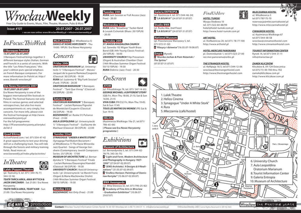 WrocławWeekly Tuesday 24th Galeria ENTROPIA RURA Jam Session w/ Full Access (Jazz: Free) - 20:30 (ul. Rzeźnicza 4, tel. 071/344-46-34) > “LA BOUM III” (24.07.07-31.07.07) FindUsHere Hotel Tumski Wyspa Słodowa 10 tel. 071/322-60-88/99 [email protected] http://www.hotel-tumski.com.pl Free City Guide to Events, Music, Film, Theatre, Museum, Pubs & More Wednesday 25th Studio BWA Issue #101 RURA John “Broadway” Tucker Band & Leszek Cichoński (Blues: 20/15PLN) - 20:30 (ul. Ruska 46a, 2nd Floor) > “LA BOUM III” (24.07.07-31.07.07) MLECZARNIA (ul. Włodkowica 5) Thursday 26th Dance at Nowe Horyzonty - Thu 19:00 / 9PLN / Era Nowe Horyzonty ST. MARIA MAGDALENA CHURCH (ul. Szewska 10) Wigan Youth Brass Band (GB) (4th Young Classic Festival: 20/10PLN) - 18:00 UNIVERSITY CHURCH Filip Presseisen (Organ) & Australian Chamber Choir (14th Wrocław Summer Organ Festival: 50/15/10PLN) - 19:30 RURA Elektrio (Jazz: Free) - 20:30 (pl. Powstancow Warszawy 5, tel. 071/372-51-50) > “Klasycy i dziewice”(16.05.07-19.08.07) 20.07.2007 - 26.07.2007 > we are now online: www.WroclawWeekly.pl > [email protected] InFocus:ThisWeek 3 Baroques Festival 13.07.2007-22.07.2007 3 Baroques Festival brings together 3 different baroque styles (Italian, German and French) in a series of concerts. With the title “Les Fêtes Françaises,” this year’s edition puts special emphasis on French Baroque composers. For more information (in Polish) at: http:// www.3baroki-wroclaw.pl/ Era Nowe Horyzonty 2007 19.07.2007-29.07.2007 Era Nowe Horyzonty is one of the biggest international film festivals in Poland. The festival features not only films in various genres and selected retrospectives, but also live music accompaniments or, very simply, live concerts. For more info, please visit the festival homepage at http://www. eranowehoryzonty.pl For the full programme: http://7ff.eranowehoryzonty.pl/artykul. do?id=3 Quad Biking ActivePoland.com / tel. 071/354-47-42 A great opportunity to test your driving skill on a challenging track. You will ride through the forests and military training fields. Read more at: wroclawweekly.pl/index.php/activities/ InTheatre Lalek (Puppet) Theatre (pl. Teatralny 4, tel. 071/ 344-76-77, 344-12-16) Teatr Tańca Arka, Ania Wytych & Jacek Owczarek - Sat 21:00 / Era Nowe Horyzonty Teatr Tańca Arka, TeArt Kam - Sun 21:00 / Era Nowe Horyzonty Concerts Friday 20th ORATORIUM MARIANUM (pl. Uniwersytecki 1) “3 Baroques Festival” - Marais/ Jacquet de la guerre/Rameau/Couperin (Classical: 30/25PLN) - 19:30 RURA (ul. Łazienna 4) “Big Funk Session” (Funk: 7/5PLN) - 20:30 ORATORIUM MARIANUM “3 Baroques Festival” - “Tant Que Vivray” (Classical: 30/25PLN) - 22:00 Saturday 21st ORATORIUM MARIANUM “3 Baroques Festival” - Leclair/Rameau/Pignolet de Montéclair/Couperin (Classical: 30/25PLN) - 19:30 BEZSENNOŚĆ (ul. Ruska 51) Pulsarus (Free) - 21:00 AULA LEOPOLDINA (pl. Uniwersytecki 1) “3 Baroques Festival” - Guillaume de Machaut (Classical: 30/25PLN) - 22:00 Sunday 22nd SYNAGOGUE “UNDER A WHITE STORK” (Synagoga Pod Białym Bocianem / ul.Włodkowica 7) The Kasia Mirowska Jazz Quartet - Songs of George Gershwin (Contemporary Jewish Composers Series: 25/12PLN) - 17:00 MUSEUM OF ARCHITECTURE (ul. Bernardynska 5) “3 Baroques Festival” Finale - Leclair/Rameau/Dauvergne/Haendel (Classical: 30/25PLN) - 19:30 UNIVERSITY CHURCH ( Kościół Uniwersytecki / pl. Uniwersytecki 1a) Marek Fronc (Organ) & Maria Machowska (Violin) (14th Wrocław Summer Organ Festival: 50/15/10PLN) - 19:30 Monday 23rd BEZSENNOŚĆ Not Only (Free) - 21:00 MLECZARNIA Hostel ul. Włodkowica 5 tel.071/787-75-70 [email protected] http://www.mleczarniahostel.pl National Museum Empik (Rynek) > “Monika Jochan & Piotr Różański / The Spities” (07.07.07-31.07.07) OnScreen ART HOTEL ul. Kiełbaśnicza 20, tel.071/ 78-77-100 http://www.arthotel.pl Cinnamon Hostel ul. Kazimierza Wielkiego 67 tel.071/344-58-58 [email protected] http://www.cinnamonhostel.com Hotel Mercure Panorama pl. Dominikański 1, tel.071/323-27-00 [email protected] Tourist Information Center Rynek 14, tel.071/344-31-11 [email protected] The Stranger Hostel ul. Kołłątaja 16/3, tel.071/344-12-06 [email protected] http://www.thestrangerhostel.com Zamek Kliczków Kliczków 8, 59-724 Osiecznica tel.075/73-40-700 thru 702 [email protected] http://www.kliczkow.com.pl ATOM (ul. Piłsudskiego 74, tel. 071/ 347-14-65) George Michael: A Different Story (GB) Fri, Mon-Thu 18:00, 21:15; Sat & Sun 16:00, 21:15 Viva Cuba (FR/CU) Fri, Mon-Thu 19:45; Sat & Sun 17:45 Tous les matins du monde (FR) Sat & Sun 19:15 1. Lalek Theatre 2. Helios Cinema 3. Synagogue "Under A White Stork" 4. Rura 5. Mleczarnia (café/hostel) HELIOS (Kazimierza Wielkiego 19a-21, tel.071/ 786-65-66) [ Please see Era Nowe Horyzonty programme ] 7 6 4 pl. Jana Pawła II Exhibitions 9 2 Museum of Architecture (ul. Bernardynska 5, tel. 071/344-8278/79, 343-36-75) > “Light and Form. Modern Architecture and Photography in Hungary 19271950” (27.04.07-02.09.07) > “JEMS Architekci. 9 Designs & 9 Realizations” (31.05.07-02.09.07) > “Endless Horizon: Paintings of Stanislaw Kortyka” (15.06.07-02.09.07) BWA Awangarda (ul. Wita Stwosza 32, tel. 071/790-25-82) > “Academy of Fine Arts in Wroclaw - Graduation Exhibition” (10.06.0729.07.07) Contact: Wrocław Tourist Information Center, Rynek 14, 50-101 Wrocław, tel. (+48 71) 344 31 11, [email protected] 10 8 3 5 6. University Church 7. Aula Leopoldina Oratorium Marianum 8. Tourist Information Center 9. Galeria Entropia 10. Museum of Architecture 1 ©WrocławWeekly 2007, Some Rights Reserved CC [BY-NC-ND] 13 11 12