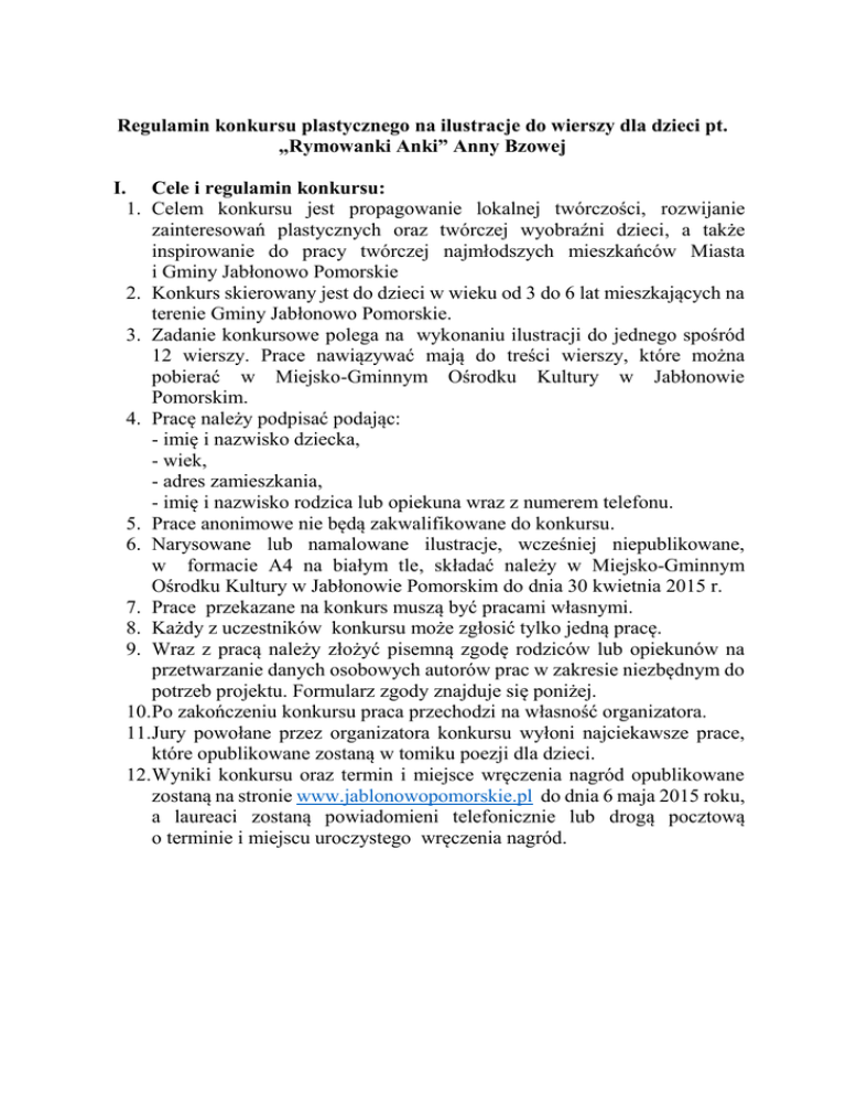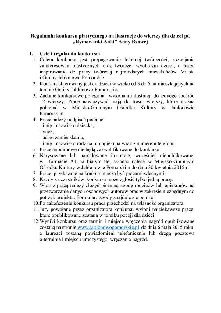 Regulamin konkursu plastycznego na ilustracje do wierszy dla dzieci pt. „Rymowanki Anki” Anny Bzowej I. Cele i regulamin konkursu: 1. Celem konkursu jest propagowanie lokalnej twórczości, rozwijanie zainteresowań plastycznych oraz twórczej wyobraźni dzieci, a także inspirowanie do pracy twórczej najmłodszych mieszkańców Miasta i Gminy Jabłonowo Pomorskie 2. Konkurs skierowany jest do dzieci w wieku od 3 do 6 lat mieszkających na terenie Gminy Jabłonowo Pomorskie. 3. Zadanie konkursowe polega na wykonaniu ilustracji do jednego spośród 12 wierszy. Prace nawiązywać mają do treści wierszy, które można pobierać w Miejsko-Gminnym Ośrodku Kultury w Jabłonowie Pomorskim. 4. Pracę należy podpisać podając: - imię i nazwisko dziecka, - wiek, - adres zamieszkania, - imię i nazwisko rodzica lub opiekuna wraz z numerem telefonu. 5. Prace anonimowe nie będą zakwalifikowane do konkursu. 6. Narysowane lub namalowane ilustracje, wcześniej niepublikowane, w formacie A4 na białym tle, składać należy w Miejsko-Gminnym Ośrodku Kultury w Jabłonowie Pomorskim do dnia 30 kwietnia 2015 r. 7. Prace przekazane na konkurs muszą być pracami własnymi. 8. Każdy z uczestników konkursu może zgłosić tylko jedną pracę. 9. Wraz z pracą należy złożyć pisemną zgodę rodziców lub opiekunów na przetwarzanie danych osobowych autorów prac w zakresie niezbędnym do potrzeb projektu. Formularz zgody znajduje się poniżej. 10.Po zakończeniu konkursu praca przechodzi na własność organizatora. 11.Jury powołane przez organizatora konkursu wyłoni najciekawsze prace, które opublikowane zostaną w tomiku poezji dla dzieci. 12.Wyniki konkursu oraz termin i miejsce wręczenia nagród opublikowane zostaną na stronie www.jablonowopomorskie.pl do dnia 6 maja 2015 roku, a laureaci zostaną powiadomieni telefonicznie lub drogą pocztową o terminie i miejscu uroczystego wręczenia nagród. II. Oświadczenie rodzica lub prawnego opiekuna: a. Wyrażam zgodę na przetwarzanie w/w danych osobowych na potrzeby konkursu plastycznego na ilustracje do wierszy dla dzieci pt. „Rymowanki Anki” Anny Bzowej zgodnie z Ustawą z dn. 29 sierpnia 1997 r. o ochronie danych osobowych (Dz. U. z 2002 r. Nr 101, poz. 926 z późniejszymi zmianami). b. Wyrażam zgodę na wykorzystanie przez organizatorów konkursu wizerunku mojego dziecka, na rozpowszechnianie oraz publikowanie, także wraz z wizerunkami innych osób utrwalonymi w ramach konkursu, w szczególności w mediach elektronicznych w tym na stronach internetowych, prasie, telewizji, broszurach, ulotkach, gazetkach itp. c. Oświadczam, że wykorzystanie wizerunku zgodnie z niniejszą zgodą nie narusza niczyich dóbr osobistych ani innych praw. Oświadczam, że niniejszą zgodę udzielam nieodpłatnie. ........................................ Miejscowość, data *niepotrzebne skreślić ……………………………………………… podpis czytelny rodzica / opiekuna prawnego*
