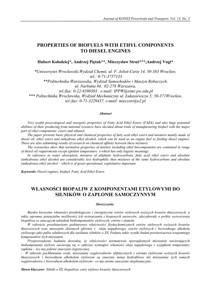 Journal of KONES Powertrain and Transport, Vol. 13, No. 3 PROPERTIES OF BIOFUELS WITH ETHYL COMPONENTS TO DIESEL ENGINES Hubert Koáodziej*, Andrzej PiĊtak**, Mieczysáaw StruĞ***,Andrzej Vogt* *Uniwersytet Wrocáawski,Wydziaá Chemii, ul. F. Joliot-Curie 14, 50-383 Wrocáaw, tel.: 0-71-3757333 **Politechnika Warszawska, Wydziaá Samochodów i Maszyn Roboczych, ul. Narbutta 84, 02-278 Warszawa, tel./fax: 0-22-8390303 , e-mail: [email protected] *** Politechnika Wrocáawska, Wydziaá Mechaniczny ul. àukasiewicza 5; 50-371Wrocáaw, tel./fax: 0-71-3229437, e-mail: [email protected] Abstract Very useful proecological and energetic properties of Fatty Acid Ethyl Esters (FAEE) and also huge potential abilities of their producing from national resource have decided about trials of manufacturing biofuel with the major part of ethyl components: esters and ethanol. The paper presents basic physical and chemical properties of fatty acid ethyl esters and mixtures mainly made of diesel oil, ethyl esters and anhydrous ethyl alcohol, which can be used as an engine fuel to feeding diesel engines. There are also submitting results of research on chemical affinity between these mixtures. The researches show that normative properties of mixture including ethyl biocomponents are contained in range of diesel oil requirements except ignition temperature (-which has only logistic meaning). In reference to water absorption, mixtures of aliphatic hydrocarbons, fatty acid ethyl esters and absolute (anhydrous) ethyl alcohol are considerably less hydrophilic then mixtures of the same hydrocarbons and absolute (anhydrous) ethyl alcohol – which is of great operational, exploitative important. Keywords: Diesel engines, biofuel, Fatty Acid Ethyl Esters WàASNOĝCI BIOPALIW Z KOMPONENTAMI ETYLOWYMI DO SILNIKÓW O ZAPàONIE SAMOCZYNNYM Streszczenie Bardzo korzystne wáasnoĞci proekologiczne i energetyczne estrów etylowych wyĪszych kwasów táuszczowych, a takĪe ogromne potencjalne moĪliwoĞci ich wytwarzania z krajowych surowców, zdecydowaáy o próbie wytworzenia biopaliwa ze znaczącym udziaáem biokomponentów etylowych: estrów i etanolu. W referacie przedstawiono podstawowe wáaĞciwoĞci fizykochemicznych estrów etylowych wyĪszych kwasów táuszczowych oraz mieszanin záoĪonych gáównie z oleju napĊdowego, estrów etylowych i bezwodnego alkoholu etylowego jako paliw silnikowych dla zasilania silników o ZS. Podano takĪe wyniki badaĔ powinowactwa wzajemnego komponentów tych mieszanin. Przeprowadzone badania dowodzą, Īe wáaĞciwoĞci normatywne sporządzonych mieszanin zawierających biokomponenty etylowe zawierają siĊ w zakresie wymogów wáasnoĞci oleju napĊdowego z wyjątkiem temperatury zapáonu – (co ma jedynie znaczenie logistyczne). - W zakresie pocháaniania wody, mieszaniny wĊglowodorów alifatycznych z estrami etylowymi wyĪszych kwasów táuszczowych i bezwodnym alkoholem etylowym są znacznie mniej hydrofilowe niĪ mieszaniny tych samych wĊglowodorów z bezwodnym alkoholem etylowym - co ma istotne znaczenie eksploatacyjne. Sáowa kluczowe: Silniki o ZS, biopaliwa, estry etylowe kwasów táuszczowych H. Koáodziej, A. PiĊtak, M. StruĞ, A. Vogt 1. Wprowadzenie Zastosowanie do silników o zapáonie samoczynnym mieszanek oleju napĊdowego z estra-mi metylowymi i etanolem nie jest nowoĞcią - prace nad takimi mieszankami prowadzone są od co najmniej od kilkunastu lat i zaowocowaáy wprowadzeniem ich do kontrolowanej eksploatacji w kilku krajach. W Europie najbardziej znany jest przypadek Sztokholmu, gdzie stosuje siĊ w komunikacji miejskiej w silnikach o ZS paliwo o handlowej nazwie Etamax D produkcji firmy SEKAB, zawierające wagowo 92 % etanolu. W kilkunastu stanach USA stosuje siĊ paliwa z dodatkiem bioetanolu o handlowej nazwie E-Diesel, O2 Diesel, Oxy-Diesel, P-fuel o zawartoĞci 10÷20% etanolu, ale równieĪ czysty etanol (silnik Pure Energy firmy Scania). Tego rodzaju paliw uĪywa gáównie komunikacja miejska, sáuĪby miejskie, poczta, jakkolwiek znane są przypadki ich stosowania w innych flotach i przez prywatnych uĪytkowników w specjalnych strefach chronionych, parkach narodowych, przy zasilaniu agregatów prądotwórczych itp., zarówno w bardzo dbającej o czystoĞü swego powietrza Kalifornii jak i innych stanach czy duĪych miastach jak Chicago czy Nowy York. Po kontrolowanej eksploatacji przewiduje siĊ w USA, Īe w agresywnym scenariuszu rozwoju rynku na paliwa tego typu zapotrzebowanie wzroĞnie z 66 milionów galonów w roku 2010 do 730 milionów w roku 2020! Scenariusz ten uwzglĊdnia zbliĪające siĊ wyczerpywanie záóĪ ropy naftowej, wzrost cen paliw, efekt cieplarniany oraz nowe, tanie metody otrzymywania syntetycznego etanolu. Istotnym czynnikiem wpáywającym na rozwój paliw alternatywnych jest fakt braku obserwowanego jeszcze niedawno sceptycyzmu wielkich producentów silników co do ich stosowania. WpáynĊáy na to przede wszystkim pozytywne wyniki badaĔ eksploatacyjnych, zarówno silników o zapáonie iskrowym jak i samoczynnym. Literatura dotycząca paliwa zawierającego etanol jest bardzo bogata - w Internecie moĪna znaleĨü pod sáowami kluczowymi „etanol” i „Diesel” ponad 2150000 pozycji z licznymi raportami z badaĔ W Polsce badania paliw do silników o ZS zawierających m.in. estry metylowe i alkohol metylowy prowadzono juĪ w roku 1994 w Instytucie Lotnictwa w Warszawie, a paliwa zawierające estry metylowe i etanol w tym samym czasie w WyĪszej Szkole Oficerskiej Wojsk Zmechanizowanych we Wrocáawiu. Bardzo korzystne wáasnoĞci proekologiczne i energetyczne estrów etylowych, a takĪe ogromne potencjalne moĪliwoĞci ich wytwarzania z krajowych surowców zdecydowaáy o próbie wytworzenia przez naukowe Ğrodowisko wrocáawskie biopaliwa ze znaczącym udziaáem biokomponentów etylowych: estrów i etanolu. 2. OkreĞlenie podstawowych wáaĞciwoĞci fizykochemicznych estrów etylowych wyĪszych kwasów táuszczowych oraz