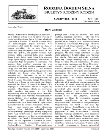 RODZINA BOGIEM SILNA BIULETYN RODZINY RODZIN CZERWIEC 2011 Nr 5 (110) Dobrowolna ofiara Jezu, ufam Tobie! Dar i Zadanie Radość i wdzięczność towarzyszyła Kościołowi , ale i ludziom dobrej woli na całym świecie w czasie beatyfikacji Jana Pawła II, która odbyła się 1-go maja w Rzymie. W homilii podczas Mszy św. beatyfikacyjnej papież Benedykt XVI powiedział: „Już sześć lat minęło od dnia, w którym zebraliśmy się na tym Placu aby celebrować pogrzeb papieża Jana Pawła II. Ból utraty był głęboki, ale jeszcze większe było poczucie jakiejś ogromnej łaski, która otaczała Rzym i cały świat, łaski, która była owocem całego życia mojego ukochanego Poprzednika, a szczególnie Jego świadectwa w cierpieniu. Już tamtego dnia czuliśmy unoszącą się woń świętości, a Lud Boży na różne sposoby okazywał swoją cześć dla Jana Pawła II… I oto nadszedł oczekiwany dzień, przyszedł szybko, ponieważ tak podobało się Bogu: „Jan Paweł II jest błogosławiony”. Dokonało się to w drugą Niedzielę Wielkanocną, którą błogosławiony Jan Paweł II ogłosił Niedzielą Bożego Miłosierdzia. Została ona wybrana na uroczystość beatyfikacji, ponieważ Jan Paweł II odszedł do Domu Ojca bogatego w Miłosierdzie właśnie w wigilię tej niedzieli. Beatyfikacja odbyła się pierwszego maja, miesiąca maryjnego, w tym dniu wspominamy również Świętego Józefa robotnika. Przedziwna jest Boża reżyseria. Nadszedł dzień, w którym Kościół przez posługę ojca Świętego Benedykta XVI powiedział: „Miłość, która przenikała całe życie Jana Pawła II i była zawsze ukierunkowana ku swemu wiecznemu Źródłu – Bogu – teraz jeszcze raz będzie ofiarowana ludziom jako świetlisty przykład życia chrześcijańskiego przeżytego według najwyższej miary. Cud uzdrowienia z choroby Parkinsona francuskiej zakonnicy, był Bożym potwierdzeniem tej miłości. Jan Paweł II błogosławiony jest w niebie, ale nie zapomina o ludziach na ziemi. Teraz jest naszym szczególnym Patronem i Orędownikiem. Swoim Wstawiennictwem Biuletyn Rodziny Rodzin nr 5 (110) Czerwiec 2011 pomaga nam i uczy jak otwierać całe życie osobiste, rodzinne, narodowe – aby ono było pielgrzymowaniem do Domu Ojca. Żebyśmy nie pogubili się na drogach życia i zamiast wędrować do nieba nie szli do nikąd. Odtąd Jego obecność i przykład jest Drogowskazem . W jednym ze swoich dramatów – „Przed sklepem jubilera” Karol Wojtyła napisał: „Miłość to nie jest przygoda. Ma smak całego człowieka. Ma jego ciężar gatunkowy. I ciężar całego losu. Nie może być chwilą. Wieczność człowieka przechodzi przez nią. Dlatego odnajduje się w wymiarach Boga, bo tylko On jest wiecznością”. W czasie swojego życia ziemskiego Jan Paweł II zawsze i wszędzie przekazywał ludziom Boga – jako dziecko, młodzieniec i ksiądz, biskup, kardynał, później jako papież. Teraz jako nasz orędownik – przypomina, że „czas, to cena wieczności”. Dlatego nasze życie, to wszystko kim jesteśmy i jacy jesteśmy – ma wartość niepowtarzalną i bezcenną. Zarówno życia poszczególnego człowieka jak i narodu nie można zrozumieć bez Chrystusa. W czasie pierwszej pielgrzymki do Polski w roku 1979 w Warszawie Jan Paweł II powiedział: „Nie sposób zrozumieć dziejów Narodu polskiego – tej wielkiej tysiącletniej wspólnoty, która tak głęboko stanowi o mnie, o każdym z nas – bez Chrystusa. Jeślibyśmy odrzucili ten klucz do zrozumienia naszego Narodu, narazilibyśmy się na zasadnicze nieporozumienie”. Wszystko co nam przekazywał błogosławiony Jan Paweł II nie może być zamkniętą księgą. Beatyfikacja to nie tylko dar ale i zadanie. Wezwanie do nieustannego pogłębiania w sobie, w rodzinach – twórczej realizacji wielkiego dziedzictwa, które pozostawił nam Papież z rodu Polaków. Nauczał nie tylko słowami, ale również przez symboliczne gesty, spotkania, śmiech i płacz, wymowne spojrzenia, modlitwę, cierpienie, wymagania. W czasie jednej z homilii zgromadzonym tłumom powiedział: Strona 1 „Przestańcie klaskać, zacznijcie słuchać”. Ze słuchaniem wiąże się posłuszeństwo, wprowadzanie słów w czyn. „Słowo stało się ciałem”. Jan Paweł II jest błogosławiony ze względu na swą wiarę mocną i wielkoduszną, wiarę apostolską. Dla Niego Maryja jest wzorem błogosławieństwa wiary. Benedykt XVI w homilii powiedział: Radujemy się wszyscy, że beatyfikacja Jana Pawła II ma miejsce w pierwszym dniu miesiąca maryjnego, pod matczynym spojrzeniem Tej, która swoją wiarą podtrzymuje apostołów”. Tę Obecność Matki Bożej błogosławiony Jan Paweł II odkrył już w młodości, a następnie zachowywał i pogłębiał przez całe swoje życie. „Totus Tuus” – „Cały jestem Twój i wszystko co moje, Twoim jest. Odnajduję Cię we wszelkim moim dobru. Daj mi Twe serce o Maryjo!” – tę modlitwę powtarzał często. W swoim testamencie nowy Błogosławiony napisał: „Kiedy w dniu 16-tym października 1978 roku konklawe kardynałów wybrało Jana Pawła II, prymas Polski, kardynał Stefan Wyszyński, powiedział do mnie: „Zadaniem nowego Papieża będzie wprowadzić Kościół w Trzecie Tysiąclecie”. Trzecie Tysiąclecie trwa, a więc jest to również zadanie ludzi, którzy żyją w tym czasie. Wciąż jest aktualna troska, którą wyraził Jan Paweł II podczas swej pierwszej uroczystej Mszy świętej na Placu Świętego Piotra w niezapomnianych słowach: „Nie lękajcie się! Otwórzcie na oścież drzwi Chrystusowi”. To, o co nowo wybrany Papież prosił wszystkich, sam wcześniej uczynił: otworzył dla Chrystusa społeczeństwo, kulturę, systemy polityczne i ekonomiczne, odrzucając z silą olbrzyma – siłą, którą czerpał z Boga – tendencję, która wydała się być nieodwracalna. „Swoim świadectwem wiary – powiedział po polsku Benedykt XVI w homilii beat