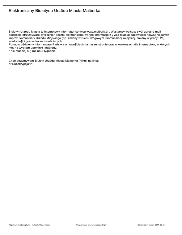 Elektroniczny Biuletynu Urzêdu Miasta Malborka Biuletyn Urzêdu Miasta to internetowy informator serwisu www.malbork.pl . Wystarczy wpisaæ swój adres e-mail i bêdziecie otrzymywaæ cyklicznie* poczt± elektroniczn± wa¿ne informacje z ¿ycia miasta: zapowiedzi najwa¿niejszych imprez, komunikaty Urzêdu Miejskiego (np. zmiany w ruchu drogowym i komunikacji miejskiej, zmiany w pracy UM), wiadomo¶ci gospodarcze i wiele innych. Ponadto bêdziemy informowaæ Pañstwa o nowo¶ciach na naszej stronie oraz o konkursach dla internautów, w których mo¿na wygraæ upominki i nagrody. * nie rzadziej ni¿ raz na 2 tygodnie Chcê otrzymywaæ Biulety Urzêdu Miasta Malborka (kliknij na link): >>Subskrypcja<< http://www.malbork.pl/um/ - Malbork, Urz±d Miasta Page created by www.kraszewski.pl Generated: 4 March, 2017, 03:42