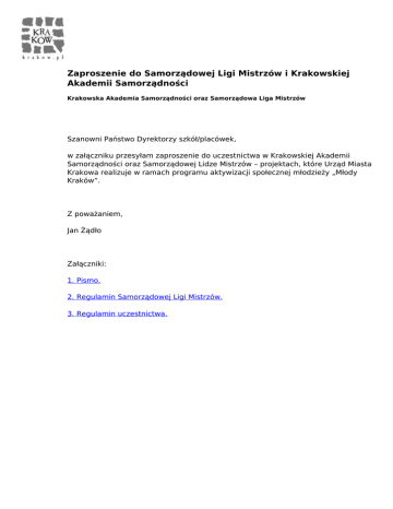 Zaproszenie do Samorządowej Ligi Mistrzów i Krakowskiej Akademii Samorządności Krakowska Akademia Samorządności oraz Samorządowa Liga Mistrzów Szanowni Państwo Dyrektorzy szkół/placówek, w załączniku przesyłam zaproszenie do uczestnictwa w Krakowskiej Akademii Samorządności oraz Samorządowej Lidze Mistrzów – projektach, które Urząd Miasta Krakowa realizuje w ramach programu aktywizacji społecznej młodzieży „Młody Kraków”. Z poważaniem, Jan Żądło Załączniki: 1. Pismo. 2. Regulamin Samorządowej Ligi Mistrzów. 3. Regulamin uczestnictwa. Powered by TCPDF (www.tcpdf.org)