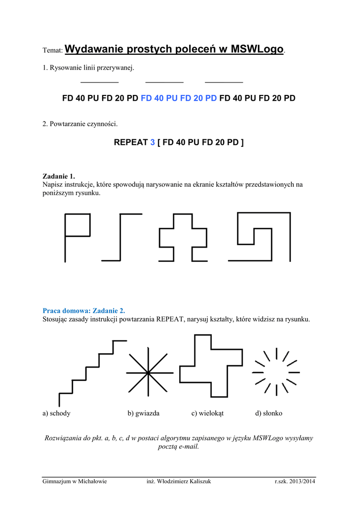 Temat: Wydawanie prostych poleceń w MSWLogo. 1. Rysowanie linii przerywanej. FD 40 PU FD 20 PD FD 40 PU FD 20 PD FD 40 PU FD 20 PD 2. Powtarzanie czynności. REPEAT 3 [ FD 40 PU FD 20 PD ] Zadanie 1. Napisz instrukcje, które spowodują narysowanie na ekranie kształtów przedstawionych na poniższym rysunku. Praca domowa: Zadanie 2. Stosując zasady instrukcji powtarzania REPEAT, narysuj kształty, które widzisz na rysunku. a) schody b) gwiazda c) wielokąt d) słonko Rozwiązania do pkt. a, b, c, d w postaci algorytmu zapisanego w języku MSWLogo wysyłamy pocztą e-mail. Gimnazjum w Michałowie inż. Włodzimierz Kaliszuk r.szk. 2013/2014