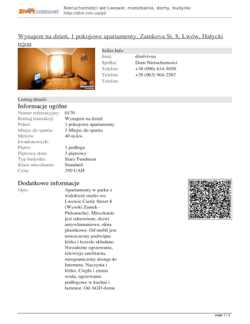 Nieruchomości we Lwowie: mieszkania, domy, budynki http://dim.lviv.ua/pl/ Wynajem na dzień, 1 pokojowe apartamenty, Zamkova St, 8, Lwów, Hałycki rejon Seller Info Imię: Spółka: Telefon: Telefon: Telefon: dimlvivua Dom Nieruchomości +38 (096) 614-5050 +38 (063) 964-2587 Listing details Informacje ogólne Numer referencyjny: Rodzaj transakcji: Pokoi: Miejsc do spania: Metrów kwadratowych: Piętro: Piętrowy dom: Typ budynku: Klasa mieszkania: Cena: 0170 Wynajem na dzień 1 pokojowe apartamenty 3 Miejsc do spania 40 m.kw. 1 podłoga 3 piętrowy Stary Funduszu Standard 350 UAH Dodatkowe informacje Opis: Apartamenty w parku z widokiem studio we Lwowie Castle Street 8 (Wysoki Zamek Pidzamche). Mieszkanie jest odnowione, drzwi antywłamaniowe, okna plastikowe. Od mebli jest nowoczesny podwójne łóżko i krzesło składane. Niezależne ogrzewanie, telewizja satelitarna, nieograniczony dostęp do Internetu. Naczynia i łóżko. Ciepła i zimna woda, ogrzewanie podłogowe w kuchni i łazience. Od AGD domu page 1 / 2 Nieruchomości we Lwowie: mieszkania, domy, budynki http://dim.lviv.ua/pl/ ma kuchenka gazowa, lodówka, mikrofalówka, pralka, żelazko, deska do prasowania, suszarka do włosów. Pierwsze piętro. Miejsca do trzech osób (2 + 1). Снять квартиру Львов без посредников Lokalizacja Kraj: Obwód: Miasto: Rejon: Ulice: Numer domu: Ukraina Obwód Lwowski Lwów Hałycki rejon Zamkova St 8 page 2 / 2 Powered by TCPDF (www.tcpdf.org)