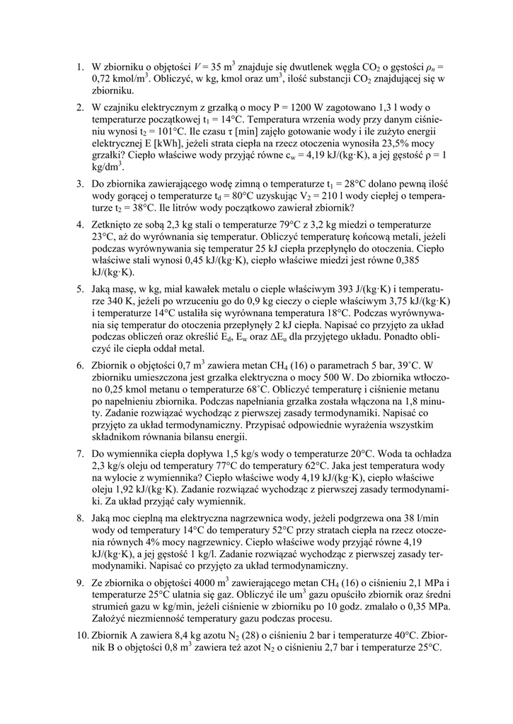 1. W zbiorniku o objętości V = 35 m3 znajduje się dwutlenek węgla CO2 o gęstości ρn = 0,72 kmol/m3. Obliczyć, w kg, kmol oraz um3, ilość substancji CO2 znajdującej się w zbiorniku. 2. W czajniku elektrycznym z grzałką o mocy P = 1200 W zagotowano 1,3 l wody o temperaturze początkowej t1 = 14°C. Temperatura wrzenia wody przy danym ciśnieniu wynosi t2 = 101°C. Ile czasu τ [min] zajęło gotowanie wody i ile zużyto energii elektrycznej E [kWh], jeżeli strata ciepła na rzecz otoczenia wynosiła 23,5% mocy grzałki? Ciepło właściwe wody przyjąć równe cw = 4,19 kJ/(kg·K), a jej gęstość ρ = 1 kg/dm3. 3. Do zbiornika zawierającego wodę zimną o temperaturze t1 = 28°C dolano pewną ilość wody gorącej o temperaturze td = 80°C uzyskując V2 = 210 l wody ciepłej o temperaturze t2 = 38°C. Ile litrów wody początkowo zawierał zbiornik? 4. Zetknięto ze sobą 2,3 kg stali o temperaturze 79°C z 3,2 kg miedzi o temperaturze 23°C, aż do wyrównania się temperatur. Obliczyć temperaturę końcową metali, jeżeli podczas wyrównywania się temperatur 25 kJ ciepła przepłynęło do otoczenia. Ciepło właściwe stali wynosi 0,45 kJ/(kg·K), ciepło właściwe miedzi jest równe 0,385 kJ/(kg·K). 5. Jaką masę, w kg, miał kawałek metalu o cieple właściwym 393 J/(kg·K) i temperaturze 340 K, jeżeli po wrzuceniu go do 0,9 kg cieczy o cieple właściwym 3,75 kJ/(kg·K) i temperaturze 14°C ustaliła się wyrównana temperatura 18°C. Podczas wyrównywania się temperatur do otoczenia przepłynęły 2 kJ ciepła. Napisać co przyjęto za układ podczas obliczeń oraz określić Ed, Ew oraz ΔEu dla przyjętego układu. Ponadto obliczyć ile ciepła oddał metal. 6. Zbiornik o objętości 0,7 m3 zawiera metan CH4 (16) o parametrach 5 bar, 39˚C. W zbiorniku umieszczona jest grzałka elektryczna o mocy 500 W. Do zbiornika wtłoczono 0,25 kmol metanu o temperaturze 68˚C. Obliczyć temperaturę i ciśnienie metanu po napełnieniu zbiornika. Podczas napełniania grzałka została włączona na 1,8 minuty. Zadanie rozwiązać wychodząc z pierwszej zasady termodynamiki. Napisać co przyjęto za układ termodynamiczny. Przypisać odpowiednie wyrażenia wszystkim składnikom równania bilansu energii. 7. Do wymiennika ciepła dopływa 1,5 kg/s wody o temperaturze 20°C. Woda ta ochładza 2,3 kg/s oleju od temperatury 77°C do temperatury 62°C. Jaka jest temperatura wody na wylocie z wymiennika? Ciepło właściwe wody 4,19 kJ/(kg·K), ciepło właściwe oleju 1,92 kJ/(kg·K). Zadanie rozwiązać wychodząc z pierwszej zasady termodynamiki. Za układ przyjąć cały wymiennik. 8. Jaką moc cieplną ma elektryczna nagrzewnica wody, jeżeli podgrzewa ona 38 l/min wody od temperatury 14°C do temperatury 52°C przy stratach ciepła na rzecz otoczenia równych 4% mocy nagrzewnicy. Ciepło właściwe wody przyjąć równe 4,19 kJ/(kg·K), a jej gęstość 1 kg/l. Zadanie rozwiązać wychodząc z pierwszej zasady termodynamiki. Napisać co przyjęto za układ termodynamiczny. 9. Ze zbiornika o objętości 4000 m3 zawierającego metan CH4 (16) o ciśnieniu 2,1 MPa i temperaturze 25°C ulatnia się gaz. Obliczyć ile um3 gazu opuściło zbiornik oraz średni strumień gazu w kg/min, jeżeli ciśnienie w zbiorniku po 10 godz. zmalało o 0,35 MPa. Założyć niezmienność temperatury gazu podczas procesu. 10. Zbiornik A zawiera 8,4 kg azotu N2 (28) o ciśnieniu 2 bar i temperaturze 40°C. Zbiornik B o objętości 0,8 m3 zawiera też azot N2 o ciśnieniu 2,7 bar i temperaturze 25°C. Zbiorniki połączono, gaz się wymieszał i osiągnął temperaturę 31°C. Obliczyć: (1) objętość zbiornika A, (2) ilość kilomoli azotu w zbiorniku B, (3) wyrównane ciśnienie w połączonych zbiornikach. (MR) = 8314 J/(kmol·K). 11. Azot N2 (28) zawarty w zbiorniku o objętości 2,5 m3 ma ciśnienie 4,1 bar i temperaturę 38°C. Do zbiornika doprowadzono dodatkowo 2 kmol azotu. Termometr umieszczony na zbiorniku wskazał temperaturę 42°C. Obliczyć: (a) początkową ilość kg azotu w zbiorniku, (b) ciśnienie końcowe azotu, (c) jaką objętość miałby azot, po dopełnieniu zbiornika, gdyby jego parametry wynosiły: 1 bar, 0°C. Uniwersalna stała gazowa jest równa 8314 J/(kmol·K). 12. Bezpośrednio po napełnieniu przez sprężarkę, parametry powietrza w zbiorniku o objętości V = 45 m3 wynosiły p1 = 30 bar i t1 = 65°C. Jaką wartość będzie miało ciśnienie w zbiorniku po ochłodzeniu się gazu do temperatury otoczenia t0 = 22°C? Ile ciepła przepłynie do otoczenia? O ile zmniejszy się energia wewnętrzna gazu? 13. Stan początkowy m = 2 kg wodoru H2 określony jest przez temperaturę t1 = 28°C i objętość V1 = 1,8 m3. Od tego stanu gaz ekspandował izotermicznie do ciśnienia p2 = 1,1 bar. Obliczyć pracę bezwzględną ekspansji w kJ. 14. Pewna ilość jednoatomowego gazu doskonałego ekspandowała izobarycznie przekazując do otoczenia 100 kJ pracy. Ile ciepła wymienił gaz z otoczeniem. Podać, czy gaz pochłonął, czy oddał ciepło? 15. Etylen C2H4 (28) ekspandował izentropowo od stanu określonego przez parametry: 3 bar, 130ºC, 0,1 m3 do stanu, w którym jego temperatura była równa 38 ºC. Obliczyć: pracę bezwzględną przemiany, przyrost energii wewnętrznej gazu oraz końcowe ciśnienie gazu. Przemianę przedstawić na wykresie p-V opisując początek i koniec przemiany, kierunek przemiany oraz pole pracy bezwzględnej przemiany. Wykonać przeliczenie jednostek. 16. Strumień powietrza m = 15 kg/min o ciśnieniu p1 = 2 MPa i temperaturze t1 = 300°C ekspanduje izentropowo w idealnej maszynie przepływowej do ciśnienia p2 = 0,3 MPa. Obliczyć moc techniczną maszyny w kW. 17. Roztwór helu He (4) i tlenu O2 (32) przy ciśnieniu 1,25 bar i temperaturze 310 K ma gęstość 0,55 kg/m3. Wyznaczyć skład molowy roztworu. 18. Obliczyć ciepło właściwe przy stałej objętości cv w kJ/(kg·K) roztworu gazów doskonałych składającego się z 3 kmoli