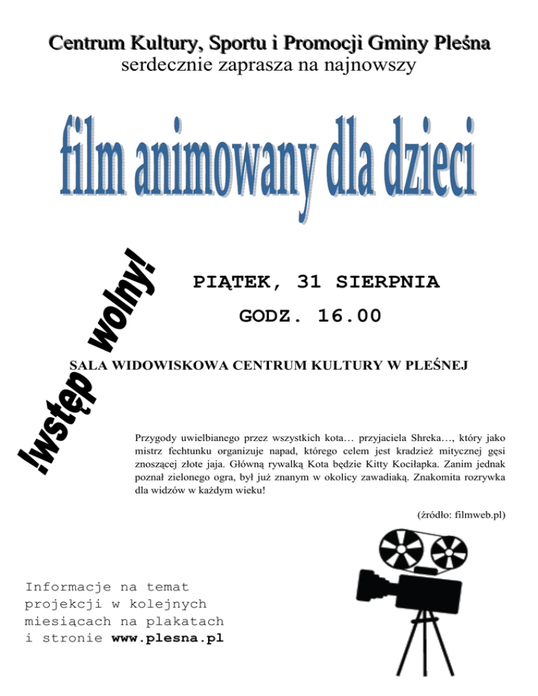 Centrum Kultury, Sportu i Promocji Gminy Pleśna serdecznie zaprasza na najnowszy PIĄTEK, 31 SIERPNIA GODZ. 16.00 SALA WIDOWISKOWA CENTRUM KULTURY W PLEŚNEJ Przygody uwielbianego przez wszystkich kota… przyjaciela Shreka…, który jako mistrz fechtunku organizuje napad, którego celem jest kradzież mitycznej gęsi znoszącej złote jaja. Główną rywalką Kota będzie Kitty Kociłapka. Zanim jednak poznał zielonego ogra, był już znanym w okolicy zawadiaką. Znakomita rozrywka dla widzów w każdym wieku! (źródło: filmweb.pl) Informacje na temat projekcji w kolejnych miesiącach na plakatach i stronie www.plesna.pl
