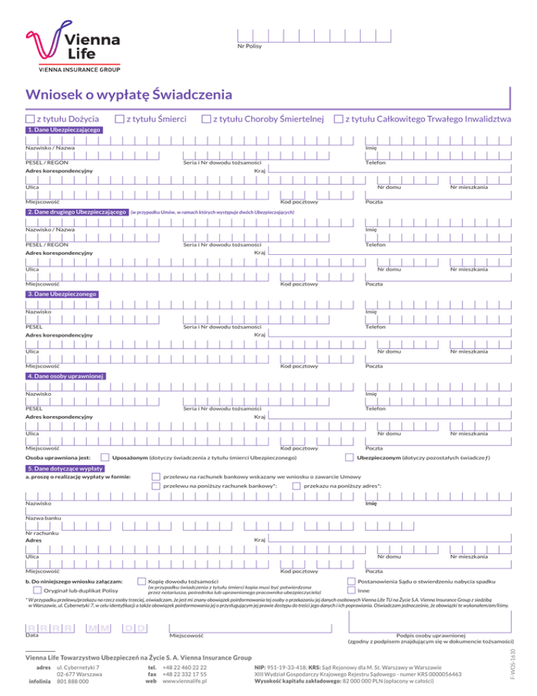 Nr Polisy Wniosek o wypłatę Świadczenia £ z tytułu Dożycia £ z tytułu Śmierci £ z tytułu Choroby Śmiertelnej £ z tytułu Całkowitego Trwałego Inwalidztwa 1. Dane Ubezpieczającego Nazwisko / Nazwa Imię PESEL / REGON Telefon Seria i Nr dowodu tożsamości Kraj Adres korespondencyjny Ulica Nr domu Miejscowość Kod pocztowy Nr mieszkania Poczta 2. Dane drugiego Ubezpieczającego (w przypadku Umów, w ramach których występuje dwóch Ubezpieczających) Nazwisko / Nazwa Imię PESEL / REGON Telefon Seria i Nr dowodu tożsamości Kraj Adres korespondencyjny Ulica Nr domu Miejscowość Kod pocztowy Nr mieszkania Poczta 3. Dane Ubezpieczonego Nazwisko Imię PESEL Telefon Seria i Nr dowodu tożsamości Kraj Adres korespondencyjny Ulica Nr domu Miejscowość Kod pocztowy Nr mieszkania Poczta 4. Dane osoby uprawnionej Nazwisko Imię PESEL Telefon Seria i Nr dowodu tożsamości Kraj Adres korespondencyjny Ulica Nr domu Miejscowość Osoba uprawniona jest: Kod pocztowy Uposażonym (dotyczy świadczenia z tytułu śmierci Ubezpieczonego) Nr mieszkania Poczta Ubezpieczonym (dotyczy pozostałych świadczeƒ) 5. Dane dotyczące wypłaty a. proszę o realizację wypłaty w formie: przelewu na rachunek bankowy wskazany we wniosku o zawarcie Umowy przelewu na poniższy rachunek bankowy*: przekazu na poniższy adres*: Nazwisko Imię Nazwa banku Nr rachunku Adres Kraj Ulica Nr domu Miejscowość b. Do niniejszego wniosku załączam: Oryginał lub duplikat Polisy Kod pocztowy Nr mieszkania Poczta Kopię dowodu tożsamości Postanowienia Sądu o stwierdzeniu nabycia spadku (w przypadku świadczenia z tytułu śmierci kopia musi być potwierdzona przez notariusza, pośrednika lub uprawnionego pracownika ubezpieczyciela) Inne * W przypadku przelewu/przekazu na rzecz osoby trzeciej, oświadczam, że jest mi znany obowiązek poinformowania tej osoby o przekazaniu jej danych osobowych Vienna Life TU na Życie S.A. Vienna Insurance Group z siedzibą w Warszawie, ul. Cybernetyki 7, w celu identyfikacji a także obowiązek poinformowania jej o przysługującym jej prawie dostępu do treści jego danych i ich poprawiania. Oświadczam jednocześnie, że obowiązki te wykonałem/am/liśmy. Miejscowość Podpis osoby uprawnionej (zgodny z podpisem znajdującym się w dokumencie tożsamości) Vienna Life Towarzystwo Ubezpieczeń na Życie S. A. Vienna Insurance Group adres infolinia ul. Cybernetyki 7 02-677 Warszawa 801 888 000 tel. fax web +48 22 460 22 22 +48 22 332 17 55 www.viennalife.pl NIP: 951-19-33-418; KRS: Sąd Rejonowy dla M. St. Warszawy w Warszawie XIII Wydział Gospodarczy Krajowego Rejestru Sądowego - numer KRS 0000056463 Wysokość kapitału zakładowego: 82 000 000 PLN (opłacony w całości) F-WOS-1610 Data