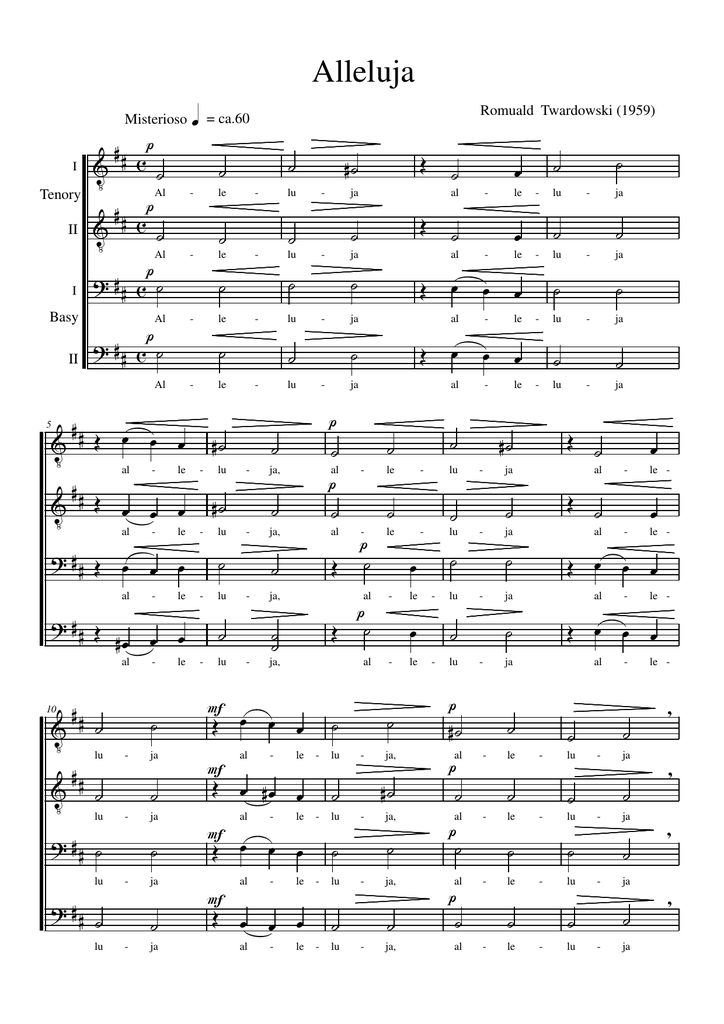Alleluja Misterioso I Tenory II ## p V c ˙ ## p V c ˙ Al Basy II p ? ## c ˙ - ˙ Al p ? ## c ˙ - Al - le le # V # Œ œ œ œ - ? ## Œ le V ## V ## ˙ lu ? ## ˙ lu lu - - - le #˙ lu #˙ lu - - ˙ lu - ˙ ˙ ˙ - lu F œ Œ p ˙ al œ œ - ˙ ja F Œ œ #œ œ ˙ F œ Œ œ œ - ja al - - ˙ al œ œ ja al F Œ œ - - le le le le Œ - le ˙ p Œ ˙ al - al - - - lu - ˙ lu - lu - ˙ lu - le œ œ œ al - le œ œ œ al - le - ˙ lu le le - - ˙ - lu - - lu p #˙ p ˙ - - lu ˙ - lu - ja - ˙ ja Œ œ œ œ al al ja al ja al - - ˙ le al ˙ le ˙ - lu - ˙ ˙ le œ - le - - œ - le - le - Œ œ œ œ ˙ - ˙ ˙ ja, al ja ˙ ja - ja, - ˙ Œ ˙ ˙ p ˙ lu ja ˙ p ˙ al - ˙ - ja - ja, lu Œ ˙ ˙ #˙ al - ˙ ˙ ˙ ˙ #˙ le ˙ - al œ - - ja, ˙ lu œ ˙ ˙ le - œ œ - ˙ ˙ le ja, - Œ p Œ ˙ al ja al ˙ ja p ˙ ˙ ja, Œ ja - ja, - ˙ ˙ al ˙ ˙ ja, ˙ - - lu - Œ ja ˙ le #˙ ja - lu - ? ## ˙ lu - ˙ ˙ lu le #œ œ œ al 10 - - ˙ - ˙ le ? ## Œ œ œ œ al lu ˙ ## Œ œ œ œ V al - ˙ 5 - ˙ ˙ le al Romuald Twardowski (1959) = ca.60 - Al I q lu - lu ˙ lu ˙ - ja - ˙ ˙ - - ja ˙ - ja ˙ - ja le - , , , , 2 con nuovo respiro 15 V ## f Œ ˙ f al œ lu f ? ## Œ œ œ œ - ˙ f ? ## ˙ . - al al - - V ## - ? ## ˙ lu le - - lu ˙ - lu - ˙ lu al f ˙. ja ˙ - - œ le œ f Œ œ œ œ ja ˙ al #˙ ja Œ ˙ ˙ Œ ˙ - ja al - ˙ - al ja - al - le le # V # al ∑ al - le - lu - œ le - ˙ lu œ ˙ le - lu - - ∑ œ œ œ œ - le - lu ? # # œ œ œ #œ œ œ œ al - le - lu - ja al - le - lu ? # # œ œ œ #œ œ œ œ al - le - lu - ja al - le - lu ˙ - - ja #˙ ja ˙ - ˙ - le ja le - lu - lu ˙ lu - - ja - ˙˙ ja ja - ˙ ja Œ œ œ œ ˙ Œ œ œ œ - ja - ˙ al - al q = 80 œ #œ œ al - le lu p 34 œ œ œ œ œ œ œ p 34 œ œ œ œ œ œ œ al - le - lu - ja le - le - Œ œ œ œ ∑ al - le - lu - ja le - - al ja p œ - al pochiss. più mosso ˙ al - le - lu al - le - lu - le - ∑ - #˙ ja ˙ - ja ˙ - ja rall. - al - al - 34 Œ ja - ˙ ja - f c ˙ lu - f c ˙ al - ˙ 34 f c ˙ f al c ˙˙ lu ˙ ˙ ˙ - Œ œ œ œ ˙ ˙ œ al Œ œ œ œ ja 25 ## Œ V ja Œ œ #œ œ ja ? ## ˙ lu le #˙ ˙ ˙ ˙ lu le f Œ ˙ al f Œ ˙ rall. 20 lu - œ œ al # ˙ V # le = 72 ˙ - ## Œ V ˙ - q - œ œ œ 3 œ œ œ œ 4 œ #œ œ œ œ le - lu - ja al - le - lu - ja al - le - lu œœ # œ œ 34 œ # œ œ œ œ # œ œ œ œ le - lu - ja al - le - lu - ja al - le - lu œ œ œ œ œ œ 34 œ œ œ œ œ # œ le - lu - ja al - le - lu - ja al - le - lu #œ œ œ œ œ 3 œ œ œ œ œ œ œ 4 le - lu - ja Biblioteka Chóru Męskiego "LIRA" al - le - lu - ja al - le - lu c - c - c - c - 3 30 V ## a tempo Ó c ˙ p #œ #œ œ œ œ œ >œ œ œ œ œ œ œ ja ## c V ˙ ja al - le - lu - ja al - le - lu - ja ? ## c w al - le - lu - ja Ó # œ V # œœ œ œ œ œ al - le - lu - ja lu ## œ œ œ #œ œ ˙ V al - le - lu - ja lu V ? ## ? ## le Ó p f œœ œ œœ œ œœ œ œ œ œ œ œœœ œ > >œ œ œ œ œ œ œ œ œ œ œ œ Ó - w w ja - >œœ ja al - le - lu le - lu - - al - le - lu - ja al - le - lu - ja al - le - lu - ja P œ œ œ œ œ œ œœ œ f> œœ #>œœ ja ja œ. >œ œ œ œ œ # œ œ œ # œ œ œ œ # œ. al - le - lu - ja, al - le - lu - ja al - le P f > > > œ œ œ œ œ œ œ œ œ œ œ œ œ œ > > > al - le - lu - ja al - le - lu - ja, al - le - lu - ja al - le f> P >œ œ œ œ # œ œ œ œ œ œ œ œ œœ œ œ œ œ œœ œ œ œ > al - le - lu - ja al - le - lu - ja al - le - lu - ja, al - le - lu - ja al - le - lu - ja f> > >œ P œ œ > >œ >œ œ œ œ œ œ œ œ œ œ - œ œ œ #œ Ó Ó ˙ >œœ al - le - lu - ja al - le - lu - ja al - le - lu - ja al - le - lu - ja al - le - lu - ja lu #>œœ ˙ al - le - lu - ja ja œ œœ œ œ œ œ al f œ œ œ œ al - le - lu - ja, al - le - lu - ja - œ œ ˙ al - le - lu - ja lu ## - al - le - lu - ja al - le - lu - ja 33 # # >œœ V œ al - le - lu - ja ˙ ja 36 al f œ #œ œ œ œ œ œ œ œ al - le - lu - ja ? ## c ˙ ? ## Ó w ja ? ## œ œ ∑ f œ œœœ œ al - le - lu - ja, al - le - lu - ja al - al - le al - le - lu - ja œ œ œ œ al - le - lu - ja >œœ P œ œ œ œ œœ œ œ œ >œœ al - le - lu - ja al - le - lu - ja P > œ œ œ œ œœ œ œ œ lu - œ > lu - ja al - le - lu - ja al - le - lu - ja le - lu - ja al - le - lu - ja al - le - lu - ja Biblioteka Chóru Męskiego "LIRA" ja P œ œ #œ œ œ œ œ œ œ œ œ œœ > al - le - lu - ja al - le - lu - ja al - le - lu - ja >œ >œ P œ œ œ œ œ œ œ œ 4 p f # # >œ œ œ œ >œ œ œ œ >œ œ œ œ >œ œ œ œ œœ # œœ œœ œœ œœ œœ œœ œœ œœ œœ V 40 al - le - lu - ja p ## V >œ œ œ œ pal - le - lu - ja ? # # >œ œ œ œ f #>œ œ œ œ >œ œ œ œ >œ œ œ œ œ œ œ # œ œ œ œ œ œ œ al - le - lu - ja al - le - lu - ja al - le - lu - ja fal - le - lu - ja al - le - lu - ja >œ œ œ œ >œ œ œ œ >œ œ œ œ œ # œ œ œ œ œ œ œ œ œ al - le - lu - ja al - le - lu - ja al - le - lu - ja al - le - lu - ja al - le - lu - ja f p ? ## œ œ œ œ œ œ œ œ œ œ œ œ œ œ œ œ œ œ œ œ œ œ œ œ œ œ > > > > al - le - lu - ja al - le - lu - ja al - le - lu - ja al - le - lu - ja al - le - lu - ja al - le - lu - ja al - le - lu - ja al - le - lu - ja al - le - lu - ja al - le - lu - ja al - le - lu - ja al - le - lu - ja p f # # >œ œ œ œ >œ œ œ œ >œ œ œ œ >œ œ œ œ œ . V # # p>œ œ œ œ V #œ œ œ œ > al - le - lu - ja al - le - lu - ja p ? # # >œ œ œ œ >œ œ œ œ f œ œ œ œ œ œ œ œ œœ .. > > al - le - lu - ja al - le - lu - ja al f >œ œ œ œ >œ œ œ œ . œ - - le - lu - ja p f ? ## œ œ œ œ œ œ. > œ œ œ >œ œ œ œ >œ œ œ œ > - œ œ œ œ œ J le - lu - ja - j œ œ œ œ œ al - le - lu - ja al - le - lu - ja al - le - lu - ja al - le - lu - ja al - le - lu - ja al - le - lu - ja al - le - lu - ja al - le - lu - ja al - le - lu - ja meno mosso p ## 3 œ œ œ œ œ œ œ V 4 ˙ 45 ## 3 p V 4 œ œ œ œ œ 