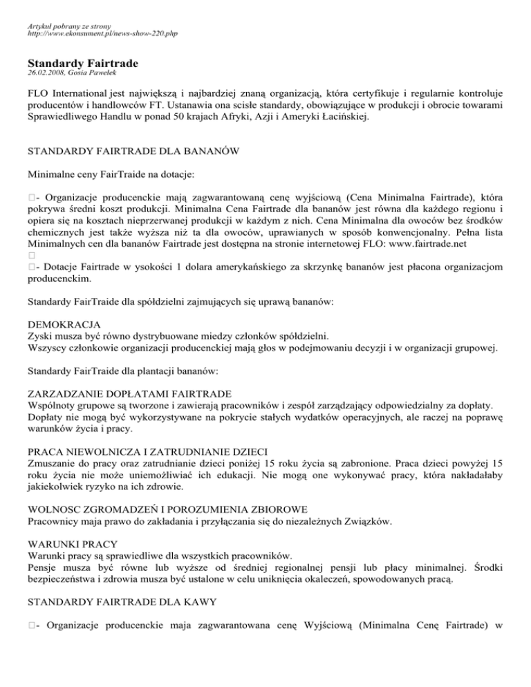 Artykuł pobrany ze strony http://www.ekonsument.pl/news-show-220.php Standardy Fairtrade 26.02.2008, Gosia Pawełek FLO International jest największą i najbardziej znaną organizacją, która certyfikuje i regularnie kontroluje producentów i handlowców FT. Ustanawia ona scisłe standardy, obowiązujące w produkcji i obrocie towarami Sprawiedliwego Handlu w ponad 50 krajach Afryki, Azji i Ameryki Łacińskiej. STANDARDY FAIRTRADE DLA BANANÓW Minimalne ceny FairTraide na dotacje: - Organizacje producenckie mają zagwarantowaną cenę wyjściową (Cena Minimalna Fairtrade), która pokrywa średni koszt produkcji. Minimalna Cena Fairtrade dla bananów jest równa dla każdego regionu i opiera się na kosztach nieprzerwanej produkcji w każdym z nich. Cena Minimalna dla owoców bez środków chemicznych jest także wyższa niż ta dla owoców, uprawianych w sposób konwencjonalny. Pełna lista Minimalnych cen dla bananów Fairtrade jest dostępna na stronie internetowej FLO: www.fairtrade.net - Dotacje Fairtrade w ysokości 1 dolara amerykańskiego za skrzynkę bananów jest płacona organizacjom producenckim. Standardy FairTraide dla spółdzielni zajmujących się uprawą bananów: DEMOKRACJA Zyski musza być równo dystrybuowane miedzy członków spółdzielni. Wszyscy członkowie organizacji producenckiej mają głos w podejmowaniu decyzji i w organizacji grupowej. Standardy FairTraide dla plantacji bananów: ZARZADZANIE DOPŁATAMI FAIRTRADE Wspólnoty grupowe są tworzone i zawierają pracowników i zespół zarządzający odpowiedzialny za dopłaty. Dopłaty nie mogą być wykorzystywane na pokrycie stałych wydatków operacyjnych, ale raczej na poprawę warunków życia i pracy. PRACA NIEWOLNICZA I ZATRUDNIANIE DZIECI Zmuszanie do pracy oraz zatrudnianie dzieci poniżej 15 roku życia są zabronione. Praca dzieci powyżej 15 roku życia nie może uniemożliwiać ich edukacji. Nie mogą one wykonywać pracy, która nakładałaby jakiekolwiek ryzyko na ich zdrowie. WOLNOSC ZGROMADZEŃ I POROZUMIENIA ZBIOROWE Pracownicy maja prawo do zakładania i przyłączania się do niezależnych Związków. WARUNKI PRACY Warunki pracy są sprawiedliwe dla wszystkich pracowników. Pensje musza być równe lub wyższe od średniej regionalnej pensji lub płacy minimalnej. Środki bezpieczeństwa i zdrowia musza być ustalone w celu uniknięcia okaleczeń, spowodowanych pracą. STANDARDY FAIRTRADE DLA KAWY - Organizacje producenckie maja zagwarantowana cenę Wyjściową (Minimalna Cenę Fairtrade) w wysokości 1.21 US$/Ib. Za czysta kawę gatunku Arabia z Afryki i Ameryki Centralnej i 1.19 US$/Ib. za czysta kawę gatunku Arabia z Azji i Ameryki Południowej. - Dopłaty Fair trade w wysokości 10 centów amerykańskich/Ib. (od pierwszego czerwca) są dodawane do ceny zakupu i są wykorzystywane przez spółdzielnie w inwestycjach społecznych i Gospodarczych w obszarze społeczności i na poziomie spółki. - Producenci są zorganizowani w organizacjach, których są właścicielami i którymi zarządzają. - Standardy środowiskowe ograniczają ubycie agrochemikaliów i wspomagają ciągłość. - Przed-eksportowe linie kredytowe SA dane organizacjom producenckim. Jeśli jest taka potrzeba, do 60% ceny zakupu powinno być uprzednio finansowane na rzecz organizacji producenckich. - Wymagane jest demokratyczne podejmowanie decyzji. Wszyscy maja równe prawo do głosowania. Organiczny Dyferencjał Fair trade dla całego asortymentu kawy organicznej takze wzrósł o 5 centów amerykańskich za funt, zmieniając sie z 15 na 20 centów. Wzrost Organicznego Dyferencjału odzwierciedla wyższe koszty produkcji organicznej stałej zarówno jak oferowanie dalszego bodźca dla środowiskowo stałego rozwoju. Te wzrosty zapewnia organizacjom producentów kawy dodatkowy dochód państwowy, aby kontynuować inwestycje w indywidualnych rolników, spółdzielnie i poziom społeczności. Decyzja została bardzo dobrze przyjęta przez sieci producentów. STANDARDY FAIRTRADE DLA BAWEŁNY - Producenci, to niewielkie rodzinne farmy, zorganizowane w Spółdzielnie (lub stowarzyszenia), których SA właścicielami i Zarządzają nimi w sposób demokratyczny. - Minimalna cena gwarantowana jest płacona bezpośrednio organizacjom producenckim. - Standardy środowiskowe ograniczają ubycie agrochemikaliów i wspomagają stabilność. - Przez eksportowe linie kredytowe są uruchamiane na rzecz spółdzielni na życzenie do 60% ceny zakupu. - Dotacje od 0.05 Do 0.06 US$/kilogram SA dodawane do ceny zakupu i wykorzystywane przez organizacje producenckie na inwestycje społeczne i gospodarcze, to jest na edukacje, opiekę zdrowotna, sprzęt potrzebny do obróbki surowca, pożyczki dla członków. - Zakazuje sie jakiegokolwiek rodzaju pracy przymusowej, włączając zatrudnianie dzieci. Produkty Bawełny Fairtrade można znaleźć we Francji, Wielkiej Brytanii, Austrii, Belgii, Kanadzie, Włoszech, Luksemburgu i Szwajcarii. W ciągu ostatnich dwóch lat, asortyment produktów znacznie sie zwiększył. Dziś, konsumenci mogą znaleźć produkty od ręczników, prześcieradeł i koszulek z krótkim rękawem, po patyczki do uszu i płatki kosmetyczne, produkowanych z Bawełny Fairtrade. Szacuje sie, że w roku 2006 ponad 1.5 miliona rzeczy wykonywanych z Certyfikowanej Bawełny Fairtrade było sprzedawanych na całym świecie. W roku 2007 i 2008 Norwegia, Dania, Szwecja, Finlandia, Austria i Niemcy będą wprowadzać na rynek produkty Bawełny Fairtrade. W związku z tą ekspansją, Fairtrade będzie kontynuował dostarczanie namacalnych korzyści rolnikom, uprawiającym bawełnę na niewielka skalę. Tym samym pozwoli się mieszkańcom wiosek na kontynuowanie dyskusji na temat jak zainwestują oni dotacje Fairtrade w przyszłości. Opracowano na podstawie Raportu rocznego FLO przetłumaczonego przez Grupę eFTe Warszawa Na podstawie: Grupa eFTe (http://www.efte.org), FLO-CERT GMBH (http://www.flo-cert.net), FLO (http://www.fairt