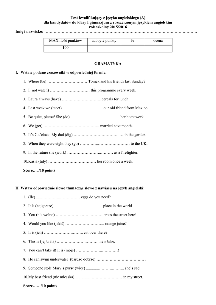 Test kwalifikujący z języka angielskiego (A) dla kandydatów do klasy I gimnazjum z rozszerzonym językiem angielskim rok szkolny 2015/2016 Imię i nazwisko: ……………………………………………………………………………………………………. MAX ilość punktów zdobyte punkty % 100 GRAMATYKA I. Wstaw podane czasowniki w odpowiedniej formie: 1. Where (be) ………………………… Tomek and his friends last Sunday? 2. I (not watch) ………………………… this programme every week. 3. Laura always (have) ………………………... cereals for lunch. 4. Last week we (meet) ………………………… our old friend from Mexico. 5. Be quiet, please! She (do) ………………………………. her homework. 6. We (get) …………………..……………….. married next month. 7. It’s 7 o’clock. My dad (dig) ……………………………..… in the garden. 8. When they were eight they (go) …………..…………………… to the UK. 9. In the future she (work) ……………………..……… as a firefighter. 10.Kasia (tidy) ……………………………… her room once a week. Score…../10 points II. Wstaw odpowiednie słowo tłumacząc słowo z nawiasu na język angielski: 1. (Ile) ......…………..…………… eggs do you need? 2. It is (najgorsze) ……………………..……….. place in the world. 3. You (nie wolno) ………………..…….……… cross the street here! 4. Would you like (jakiś) ………………………... orange juice? 5. Is it (ich) ………………….…….. cat over there? 6. This is (jej brata) ………………….……… new bike. 7. You can’t take it! It is (moje) ………………..…………! 8. He can swim underwater (bardzo dobrze) ……………………………… . 9. Someone stole Mary’s purse (więc) .............………..……... she’s sad. 10.My best friend (nie mieszka) ...............…………………… in my street. Score……/10 points ocena III. Wstaw w luki poprawne przyimki: after, at, next to, for, in, on, past, to. UWAGA! Niektóre z nich mogą być użyte więcej niż jeden raz! 1. There is a police station ………….………………… the newsagent’s. 2. They usually go to school ……………….. foot. 3. My friend has to look …………….…. his little brother. 4. What’s the time? It’s half …………….…….. ten. 5. Are you waiting ………….…….…. Tom? 6. He doesn’t like getting up early ..…………….. Saturdays. 7. I didn’t take my dog ….……………..….… a walk yesterday. 8. I’m going to Spain ………………...……. July. 9. We finish our lessons …………….…. quarter to three. 10.She doesn’t like listening …………….…. the radio. Score……/10 points SŁOWNICTWO I. Znajdź słowo niepasujące do pozostałych i podkreśl je: 1. uncle father son niece 2. Polish English Australia French 3. grandma aunt cousin daughter 4. History Wednesday Thursday Friday 5. magazines books newspapers reads 6. skiing snowboarding 7. apple banana pear potato 8. postman student teacher driver 9. bedroom kitchen bathroom floor 10.man woman baby children Score…../10 points swimming shopping II. Przetłumacz podane wyrażenie w nawiasie na język angielski tak, aby utworzyć poprawne zdania. Pamiętaj o zachowaniu odpowiedniej formy: 1. She likes playing (na skrzypcach) ………………………………………….. . 2. Have you got (jakieś) ………………..…. pets? 3. My friend, Ania can (mówić) ......…………………… German and Portuguese. 4. The autumn in England is usually awful! It (pada) ………………….……….. all the time. 5. I (scielę łóżko) ……………………………………………. every morning. 6. In this place you mustn’t (palić)………………………… . 7. We bought (wszystko) ……………………………….. for my birthday party. 8. This is the film (który) ………………………… I want to see. 9. Can we have three kilos of pears and a (puszka) ………………………… of Coke, please? 10. She can’t do her homework because it’s (trudna) ……………………………………….….. . Score…../10 points REAGOWANIE JĘZYKOWE I. Przeczytaj zdania i napisz jak mógłbyś/mogłabyś na nie odpowiedzieć. 1. Where are you from? ................................................................................................................................ 2. What time is it? ......................................................................................................................................... 3. How are you today? ……………………………………………………………………………….……. 4. Do you like swimming in the sea? ………………………………………………………….………….. 5. I’m a bit hungry. …………………………………………………………………………..……………. 6. Excuse me, how do I get to the bank? ……………………………………………….…………………. 7. Why are you late? ……………………………………………………………………..………………… 8. What are you doing? …………………………………..………………………………………………… 9. Do you like my new MP3 player?............................................................................................................... 10.Would you like something to eat? .............................................................................................................. Score……/10 points II. Dopasuj wyrażenia z kolumny A z wyrażeniami z kolumny B, tak aby powstały poprawne wyrażenia. A B A 1. How much does it cost? a. Quite well, thanks. 2. See you soon! b. You`re welcome. 3. What does she like doing? c