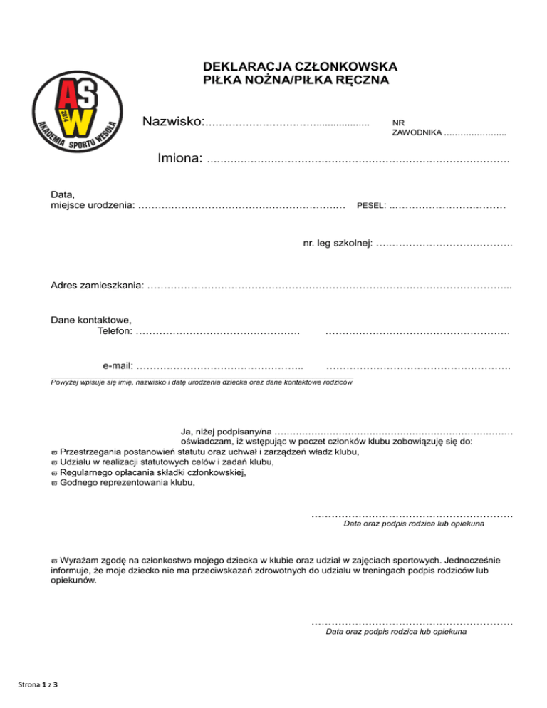 DEKLARACJA CZŁONKOWSKA PIŁKA NOŻNA/PIŁKA RĘCZNA Nazwisko:……………………………................... NR ZAWODNIKA ………………….. Imiona: ……………………………………………………………………………… Data, miejsce urodzenia: ……….………………………………………….… PESEL: ..…………………………… nr. leg szkolnej: ….………………………………. Adres zamieszkania: …………………………………………………………………….………………………... Dane kontaktowe, Telefon: …………………………………………. e-mail: ………………………………………….. ………………………………………………. ………………………………………………. __________________________________________________________________________ Powyżej wpisuje się imię, nazwisko i datę urodzenia dziecka oraz dane kontaktowe rodziców Ja, niżej podpisany/na …………………………………………………………………… oświadczam, iż wstępując w poczet członków klubu zobowiązuję się do: Przestrzegania postanowień statutu oraz uchwał i zarządzeń władz klubu, Udziału w realizacji statutowych celów i zadań klubu, Regularnego opłacania składki członkowskiej, Godnego reprezentowania klubu, …………………………………………………… Data oraz podpis rodzica lub opiekuna Wyrażam zgodę na członkostwo mojego dziecka w klubie oraz udział w zajęciach sportowych. Jednocześnie informuje, że moje dziecko nie ma przeciwskazań zdrowotnych do udziału w treningach podpis rodziców lub opiekunów. …………………………………………………… Data oraz podpis rodzica lub opiekuna Strona 1 z 3 ZGODA NA WYKORZYSTANIE WIZERUNKU DZIECKA bezpłatne rozpowszechnianie wizerunku mojego dziecka i przetwarzanie jego danych osobowych podczas imprez i zajęć sportowych organizowanych przez Akademię Sportu Wesoła oraz podczas wydarzeń, w których moje dziecko będzie reprezentowało barwy w/w klubu. …………………………………………………… Podpis rodzica lub opiekuna Wypełnia zarząd Zawodnik: ………………………………………………………………………………………………………….. Decyzją Zarządu klubu z dnia:…………………….…..wpisany do rejestru członków. …………………………………………………… Podpis członka zarządu Decyzją Zarządu klubu z dnia:…………………….….. skreślony z listy członków. …………………………………………………… Podpis członka zarządu REGULAMIN 1. Osoba wstępująca do klubu składa pisemną deklarację, wnosi opłatę wpisową – 50pln oraz zobowiązuje się do regularnego opłacania składki członkowskiej. 2. Składka członkowska w klubie powinna być wpłacona na konto do 10 każdego miesiąca za dany miesiąc (aktualna wysokość składki członkowskiej publikowana jest na www.sport-wesola.pl). 3. Składka jest pobierana od członków klubu przez 10 miesięcy w roku. 4. W ramach składki mogą Państwo korzystać ze wszystkich proponowanych przez klub zajęć, nie tylko w wybranej przez Państwa szkole. 5. Osoba nie opłacająca składki przez 2 miesiące, po wcześniejszym pisemnym zawiadomieniu zostaje skreślona z listy członków klubu. 6. Strona 2 z 3 W przypadku braku opłaty składki członkowskiej AKADEMIA SPORTU WESOŁA zastrzega sobie prawo do niedopuszczenia ucznia do zajęć. Niedopuszczenie do zajęć nie zwalnia z obowiązku uregulowania składki członkowskiej. 7. Ponowne wpisanie na listę członków związane jest koniecznością uregulowania należności składkowych za okres członkostwa oraz z wpłaceniem dodatkowej opłaty rejestracyjnej w wysokości 50 zł. 8. W wyjątkowych, losowych sytuacjach tj. choroba, trwających ponad miesiąc, można zwrócić się pisemnie do Zarządu klubu o zwolnienie z opłacania składki za ten okres. Nie powiadomienie władz klubu o zaistniałej sytuacji skutkuje koniecznością opłacenia składki. 9. W przypadku wyjątkowo trudnej sytuacji finansowej rodziny trenującego dziecka zarząd może czasowo obniżyć składkę osoby trenującej. 10. Dzieci mają kategorycznie zabronione krytykowania umiejętności sportowych swoich kolegów. Osoby dorosłe zobowiązują się do nie krytykowania dzieci podczas treningów i zawodów sportowych. 12. W przypadku zaobserwowanych nieprawidłowości w relacjach instruktor - dziecko (szczególnie w przypadkach stwierdzonej agresji werbalnej lub o innym nieodpowiednim zachowaniu – rodzic dziecka zobowiązany jest do zgłoszenia tego faktu niezwłocznie telefonicznie 602 805 177, 602 210 028 lub mailem na biuro@sport - wesola.pl). 13 Każdy zawodnik AKADEMII SPORTU WESOŁA musi posiadać i regularnie wykonywać badania lekarskie dopuszczające go do uprawiania sportu. 14 Każdy zawodnik AKADEMII SPORTU WESOŁA musi posiadać lub wykupić ubezpieczenie obejmujące wyczynowe uprawianie sportu. Orientacyjny koszt ubezpieczenie NNW PZU SPORT wynosi 30 PLN rocznie przy sumie ubezpieczenia 10 tysięcy złotych. 15 Każdy zawodnik musi posiadać odpowiednie obuwie sportowe. W przypadku treningu na boisku turfy lub plastikowe korki, w przypadku treningu na sali obuwie halowe. 16. Oświadczam, że zapoznałem się z powyższym regulaminem w Akademii Sportu Wesoła i akceptuję jego postanowienia. ............................................................. data i podpis członka klubu, Rodzica lub prawnego Opiekuna dziecka będącego członkiem klubu Strona 3 z 3