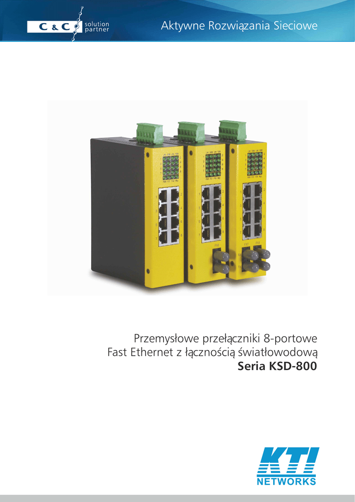 Aktywne Rozwiązania Sieciowe Przemysłowe przełączniki 8-portowe Fast Ethernet z łącznością światłowodową Seria KSD-800 Aktywne Rozwiązania Sieciowe Zalety: Przełącznik Fast Ethernet z 8 portami miedzianymi 10/100Mb/s oraz opcjonalnymi portami światłowodowymi Szeroki zakres temperatury pracy, pozwalający na pracę w środowisku o krytycznych warunkach temperaturowych - Obsługa montażu panelowego oraz montażu w szynie DIN - Dwa rodzaje zasilania, pozwalające na spełnienie wymagań w zależności od zastosowań - Szeroki zakres napięcia zasilania, pozwalający na elastyczność zastosowań - Przemysłowa emisja oraz wydajność odpornościowa Cechy kluczowe: 8 portów 10/100M z auto negocjacją oraz automatyczną konfiguracją MDI/MDI-X Port 7 oraz 8 mają możliwość transmisji zarówno w trybie miedzianym, jak i światłowodowym (w zależności od modelu) Obsługa komutacji „zapamiętaj i wyślij” z prędkością kablową Obsługa sterowania przepływu IEEE 802.3x dla pracy w trybie pełnodupleksowym Obsługa sterowania przepływu dla ciśnienia wstecznego w trybie półdupleksowym Funkcja Far End Fault dla portów światłowodowych Panelowy wspornik montażowy C03-4007-101 Aktywne Rozwiązania Sieciowe Parametry Norma IEEE 802.3 10Base-T, IEEE 802.3u 100Base-TX, 100Base-FX Porty sieciowe 8 RJ-45 10/100Mb/s auto negocjacja, auto porty MDI/MDI-X 2 porty 100Mb/s 100Base-FX (w zależności od modelu) (Port 7 oraz 8 umożliwiają łączność zarówno w trybie miedzianym jak i światłowodowym) Kable sieciowe 10Base-T: Kat. 3, 4, 5 lub wyższa dla maks.100m 100Base-TX: Kat. 5 lub wyższa dla maks. 100 m 100Base-FX: MMF 50/125µm 60/125µm, SMF 9/125µm Adresy MAC Tabela z 1K wpisów Diody LED Na jednostkę: zasilanie, zarządzanie Nart port 10/100M: Połączenie/aktywność, 100M, status dupleksu/konfliktu Na slot portu światłowodu: połączenie/aktywność Wyjście przekaźnikowe Alarm: awaria zasilania Interfejs: 2 styki zaciskowe Spec.: maks. 30VDC/1A lub maks. 120VAC/0.5A Wejście zasilania DC Listwa łączy śrubowych: 2 pary styków +/- wtyku DC: -D 6,3mm/+D 2,0mm Zakres napięcia roboczego: +7 ~ +30VDC Pobór mocy maks. 7,3W Obudowa Metalowa, bez wentylatora Wymiary 140 x 106 x 40 mm (szer. x gł. x wys.) Montaż w szynie DIN, ścienny Parametry środowiskowe Temperatura pracy: -20 °C ~ 70 °C Wilgotność względna: 5% ~ 95% nieskroplona Zatwierdzenie FCC klasa A, CE/EMC klasa A, norma bezpieczeństwa EN60950 Aktywne Rozwiązania Sieciowe Testy bezpieczeństwa środowiska EMI EMS: Test Norma Specyfikacje FCC/EMI Zas.FCC Cz. 15 Klasa A CE/EMC/EMI EN55022, CISPR 22 Klasa A CE/EMC/Harmonic EN 61000-3-2 < 75 W CE/EMC/VFF EN 61000-3-3 Klauzula 5 CE/EMC/EMS EN 55024 Wyładowania elektrostatycznego ESD IEC 61000-4-2 Styk: +/-8KV Powietrze: +/-16KV RS IEC 61000-4-3 Wytrzymałość: 10V/m EFT/BURST IEC 61000-4-4 +/-4KV Odporność udarowa IEC 61000-4-5 Moc: 4KV Sygnał: 0,5KV CS IEC 61000-4-6 Poziom 3 Odpowiedź pola magnetycznego IEC 61000-4-8 50Hz 40A/m Odpowiedź spadku napięcia IEC 61000-4-11 Przerwanie: C Spadki: B Bezpieczeństwo EN 60950, IEC 60950 Napięcie dielektryczne IEEE 802.3 TP, 1500VAC/60sek Rezystancja izolacji IEEE 802.3 TP, 500VDC/10Mohm Test na zimno IEC 68-2-1 Test Ad -20OC, 96 godz. Test suchy (ciepło) IEC 68-2-2 Test Bd +70OC 40%RH 96 godz. Test mokry (ciepło) IEC 68-2-3 +60OC 90%RH 96 godz. Test przechowywania IEC 68-2-48 -20OC 96 godz +85OC 40%RH 96 godz. Test odporności na wibrację IEC 68-2-34 Aktywne Rozwiązania Sieciowe Parametry światłowodu: Model FX & kabel Dłgugość fali Tx Moc Rx Czułość Maks. Moc Rx -1T FX8: ST MMF 1310nm -20 ~ -14 dBm -32dBm -8dBm -1C FX8: SC MMF 1310nm -20 ~ -14 dBm -31dBm 0dBm -1C1 FX8: SC MMF 1310nm -20 ~ -14 dBm -31dBm 0dBm -1SL2 FX8: SC MMF 1310nm -15 ~ -8 dBm -30dBm -7dBm -2T FX7: ST MMF FX8: ST MMF 1310nm 1310nm -20 ~ -14 dBm -20 ~ -14 dBm -32dBm -32dBm -8dBm -8dBm -2C FX7: SC MMF FX8: SC MMF 1310nm 1310nm -20 ~ -14 dBm -20 ~ -14 dBm -31dBm -31dBm 0dBm 0dBm -2C1 FX7: SC MMF FX8: SC MMF 1310nm 1310nm -20 ~ -14 dBm -20 ~ -14 dBm -31dBm -31dBm 0dBm 0dBm -2SL2 FX7: SC SMF FX8: SC SMF 1310nm 1310nm -15 ~ -8 dBm -15 ~ -8 dBm -30dBm -30dBm -7dBm -7dBm -C1SL2 FX7: SC MMF FX8: SC SMF 1310nm 1310nm -20 ~ -14 dBm -15 ~ -8 dBm -31dBm -30dBm 0dBm -7dBm Aktywne Rozwiązania Sieciowe Wymiar szyny DIN Wymiar panelu Informacje dotyczące zamówienia Model KSD-800-xxx Porty FX Dystans Temperatura robocza -1T FX8 ST MMF 2 km -20 ~ 70OC -1C FX8 SC MMF 2 km -20 ~ 70OC -1C1 FX8 SC MMF 2 km -20 ~ 70OC -1SL2 FX8 SC MMF 20 km -20 ~ 70OC -2T FX7 ST MMF FX8 ST MMF 2 km 2 km -20 ~ 70OC -2C FX7 SC MMF FX8 SC MMF 2 km 2 km -20 ~ 70OC -2C1 FX7 SC MMF FX8 SC MMF 2 km 2 km -20 ~ 70OC -2SL2 FX7 SC SMF FX8 SC SMF 20 km 20 km -20 ~ 70OC -C1SL2 FX7 SC MMF FX8 SC SMF 2 km 20 km -20 ~ 70OC C&C Partners Telecom Sp. z o.o. ul. 17 Stycznia 119, 121 64-100 Leszno tel. +48 65 525 55 01 fax +48 65 525 56 66 e-mail: [email protected] www.ccpartners.pl C&C Partners Telecom Sp. z o.o. ul. Polanki 67c 80-302 Gdańsk tel. +48 58 739 67 80 fax +48 58 739 67 89 e-mail: [email protected] C&C Partners Telecom Sp. z o.o. ul. Malinowa 8 40-692 Katowice tel. +48 32 201 78 90 fax +48 32 201 78 95 e-mail: [email protected] C&C Partners Telecom Sp. z o.o. Ursynów Business Park ul. Puławska 303 wejście B 02-785 Warszawa tel. +48 22 549 70 00 fax +48 22 549 70 10 e-mail: [email protected]