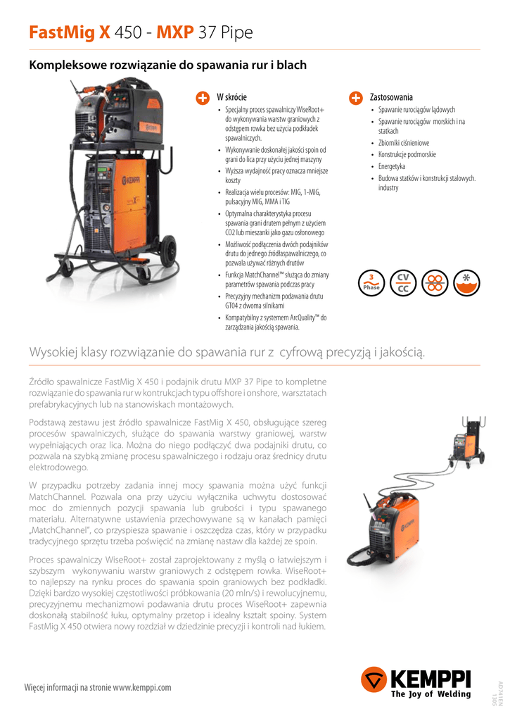 FastMig X 450 - MXP 37 Pipe Kompleksowe rozwiązanie do spawania rur i blach W skrócie • S pecjalny proces spawalniczy WiseRoot+ do wykonywania warstw graniowych z odstępem rowka bez użycia podkładek spawalniczych. • Wykonywanie doskonałej jakości spoin od grani do lica przy użyciu jednej maszyny • Wyższa wydajność pracy oznacza mniejsze koszty • Realizacja wielu procesów: MIG, 1-MIG, pulsacyjny MIG, MMA i TIG • Optymalna charakterystyka procesu spawania grani drutem pełnym z użyciem CO2 lub mieszanki jako gazu osłonowego • Możliwość podłączenia dwóch podajników drutu do jednego źródłaspawalniczego, co pozwala używać różnych drutów • Funkcja MatchChannel™ służąca do zmiany parametrów spawania podczas pracy • Precyzyjny mechanizm podawania drutu GT04 z dwoma silnikami • Kompatybilny z systemem ArcQuality™ do zarządzania jakością spawania. Zastosowania • S pawanie rurociągów lądowych • Spawanie rurociągów morskich i na statkach • Zbiorniki ciśnieniowe • Konstrukcje podmorskie • Energetyka • Budowa statków i konstrukcji stalowych. industry 3 Phase CV CC * Wysokiej klasy rozwiązanie do spawania rur z cyfrową precyzją i jakością. Źródło spawalnicze FastMig X 450 i podajnik drutu MXP 37 Pipe to kompletne rozwiązanie do spawania rur w kontrukcjach typu offshore i onshore, warsztatach prefabrykacyjnych lub na stanowiskach montażowych. Podstawą zestawu jest źródło spawalnicze FastMig X 450, obsługujące szereg procesów spawalniczych, służące do spawania warstwy graniowej, warstw wypełniających oraz lica. Można do niego podłączyć dwa podajniki drutu, co pozwala na szybką zmianę procesu spawalniczego i rodzaju oraz średnicy drutu elektrodowego. W przypadku potrzeby zadania innej mocy spawania można użyć funkcji MatchChannel. Pozwala ona przy użyciu wyłącznika uchwytu dostosować moc do zmiennych pozycji spawania lub grubości i typu spawanego materiału. Alternatywne ustawienia przechowywane są w kanałach pamięci „MatchChannel”, co przyspiesza spawanie i oszczędza czas, który w przypadku tradycyjnego sprzętu trzeba poświęcić na zmianę nastaw dla każdej ze spoin. Proces spawalniczy WiseRoot+ został zaprojektowany z myślą o łatwiejszym i szybszym wykonywaniu warstw graniowych z odstępem rowka. WiseRoot+ to najlepszy na rynku proces do spawania spoin graniowych bez podkładki. Dzięki bardzo wysokiej częstotliwości próbkowania (20 mln/s) i rewolucyjnemu, precyzyjnemu mechanizmowi podawania drutu proces WiseRoot+ zapewnia doskonałą stabilność łuku, optymalny przetop i idealny kształt spoiny. System FastMig X 450 otwiera nowy rozdział w dziedzinie precyzji i kontroli nad łukiem. AD741EN 1305 Więcej informacji na stronie www.kemppi.com FastMig X 450 - MXP 37 Pipe Szybkie i łatwe wykonywanie warstw graniowych z odstępem rowka bez użycia podkładek spawalniczych WiseRoot+ to specjalistyczny proces do spawania metodami MIG/MAG zmodyfikowanym łukiem zwarciowym stworzony specjalnie na potrzeby spawania grani na rurach i blachach. Fabrycznie instalowany we wszystkich podajnikach drutu MXP 37, proces WiseRoot+ wykorzystuje zaawansowaną technikę pomiaru napięcia, która umożliwia precyzyjne rejestrowanie informacji o parametrach w trakcie całego procesu spawania. Dane te wykorzystywane są do precyzyjnego sterowania charakterystyką łuku zwarciowego, by tworzyć ciągłą, bezodpryskową spoinę, którą można w łatwy sposób kontrolować, nawet w wymagających warunkach charakterystycznych dla spawania rur. WiseRoot+ nie jest kolejnym zmodyfikowanym procesem spawalniczym – to metoda umożliwiająca spawanie doskonałe. Bardzo wysoka częstotliwość próbkowania (20 mln/s) oraz precyzja i moc nowego, dwusilnikowego systemu podawania drutu umożliwiają wydajne wykonywanie najwyższej klasyspoin graniowych. Przy zakupie urządzenia FastMig X 450 można wybrać zestaw programów spawalniczych najlepiej odpowiadających bieżącym potrzebom. A gdy się zmienią, wystarczy zainstalować dodatkowe program do danego rodzaju drutu i gazu osłonowego. Większa wydajność Korzyści • Doskonała charakterystyka do spawania warstw graniowych • Duża tolerancja na zmienny odstęp między spawanymi elementami • Brak potrzeby stosowania podkładek spawalniczych • Pozwala na zmniejszenie objętości spoiny i zwiększenie prędkości spawania, co w praktyce oznacza mniejsze zużycie drutu i obniża koszty • Optymalny przetop i właściwy kształt ściegu niezależnie od pozycji spawania • Niższe koszty obróbki po spawaniu • Do ięciu razy większa szybkość spawania niż w przypadku metody TIG • Doskonałe efekty ze wszystkimi stalowymi drutami litymi,rdzeniowymi oraz CO2 jako gazem osłonowym • Łatwość obsługi i użytkowania. Pipe welding simulation tests showed that WiseRoot+ is superior rootwelding process compared to 1-MIG. Depending on the welding position, WiseRoot+ offers up to 3 times greater welding speeds. Wyższa jakość Najnowsze techniki sterowania łukiem umożliwiają właściwą kontrolę jakości procesów spawania grani. Proces WiseRoot+ pozwala zespołom spawaczy osiągać cele zarówno w zakresie efektywności pracy, jak i jakości. Większa użyteczność System spawalniczy FastMig X 450 do spawania rur łączy w sobie najnowsze rozwiązania technologiczne z dziedziny spawalnictwa ze specjalistycznym oprogramowaniem spawalniczym, dzięki czemu proces spawania jest szybszy i bardziej efektywny. Wise i Match to specjalistyczne oprogramowanie spawalnicze. Urządzenie FastMig X 450 jest standardowo wyposażone w proces WiseRoot+ i funkcję WiseFusion. Łączy on dwa unikatowe i innowacyjne rozwiązania do spawania rur i blach – proces WiseRoot+ i funkcję WiseFusion. WiseRoot+ to najwyższej klasy proces do wykonywania grani podczas spawania rur, a WiseFusion to funkcja zapewniająca niezmienną jakość spoiny we wszystkich po