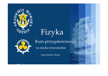 Fizyka Kurs przygotowawczy na studia inżynierskie mgr Kamila Haule Zderzenia Zasada zachowania pędu Pęd i druga zasada dynamiki Pęd cząstki (ciała) to wektor prędkości pomnożony przez masę. r r p = mv m kg ⋅ s Druga zasada dynamiki została pierwotnie sformułowana przez Newtona za pomocą pędu: Szybkość zmian pędu cząstki jest równa wypadkowej sile działających na cząstkę i ma kierunek tej siły. r r dp Fwyp = dt Zasada zachowania pędu Układ izolowany Układ zamknięty Układ, na który nie działają żadne siły zewnętrzne (czyli pochodzące od ciał spoza naszego układu), albo wypadkowa wszystkich sił zewnętrznych jest równa zeru. Żadne cząstki/ciała nie opuszczają układu, ani do niego nie przybywają. r Fwyp = 0 r r dp =0 ⇒ p = const . dt ZASADA ZACHOWANIA PĘDU Jeśli na ciało nie działają siły zewnętrzne lub ich wypadkowa jest równa zeru, to całkowity pęd układu nie ulega zmianie. r r p p = pk Zasada zachowania pędu r r p p = pk Uwaga: równanie wektorowe! p px = p kx p py = p ky p pz = p kz Przykład: Petarda umieszczona wewnątrz orzecha kokosowego o masie m, rozrywa go na trzy kawałki, które rozsypują się po podłodze. Przed wybuchem orzech spoczywał na podłodze, a po wybuchu ruch jego kawałków odbywa się bez tarcia. Na rysunku przedstawiono widok orzecha z góry, chwilę po wybuchu. Kawałek C o masie 0,3 m porusza się po wybuchu petardy z prędkością 5 m/s. a) Ile wynosi prędkość kawałka B o masie 0,2 m? b) Ile wynosi prędkość kawałka A? Kilka zadań Zadania 1. Znając swoją masę, jak szybko musiałbyś biec, aby mieć taki sam pęd, jak samochód o masie 1000 kg jadący z prędkością 10 km/h? 2. Stojący na deskorolce człowiek o masie 91 kg (łącznie z deskorolką) rzuca poziomo wprzód kamień o masie 68 g, nadając mu prędkość 4 m/s. Z jaką prędkością zaczyna się wówczas poruszać człowiek na deskorolce, jeśli deskorolka jeździ bez tarcia? Zadania 3. Człowiek o masie 75 kg jedzie wózkiem o masie 39 kg poruszającym się z prędkością 2,3 m/s. W pewnej chwili wyskakuje z wózka, przy czym składowa pozioma jego prędkości względem ziemi jest równa zeru. Jak zmienia się przy tym prędkość wózka? Zadania 4. Platforma kolejowa o ciężarze W może toczyć się bez tarcia po prostym torze poziomym. Na platformie znajduje się człowiek o ciężarze C. Początkowo człowiek stoi na platformie bez ruchu, a platforma toczy się w prawo z prędkością v0. Jak zmieni się prędkość platformy, gdy człowiek zacznie biec po niej w lewo z prędkością v1 względem platformy? Zadania 5. W końcowej fazie lotu pojazd rakietowy poruszający się z prędkością 7600 m/s składa się z dwóch połączonych ze sobą części: członu napędowego o masie 290 kg i kapsuły z ładunkiem o masie 150 kg. W trakcie rozłączania tych części zwolniona sprężyna odpycha je od siebie z prędkością względną 910 m/s. Ile wynosi prędkość: a) członu napędowego, b) kapsuły z ładunkiem po ich rozłączeniu? Załóż, że wszystkie prędkości, o których mowa w zadaniu są skierowane wzdłuż jednej prostej. c) Oblicz łączna energię kinetyczną obydwu części pojazdu przed i po ich odłączeniu od siebie. Zadania 6. Nieruchome naczynie wybucha i rozpada się na trzy części. Dwie z nich o jednakowych masach rozbiegają się w kierunkach wzajemnie prostopadłych z prędkościami i jednakowych wartościach. Trzecia część ma masę trzykrotnie większą od masy każdej z pozostałych. Wyznacz wartość i kierunek prędkości tej części zaraz po wybuchu. Zderzenia Zderzenia sprężyste i niesprężyste Zderzenia sprężyste Zderzenia niesprężyste Zderzenia całkowicie niesprężyste Kiedy w układzie zamkniętym i izolowanym całkowita energia kinetyczna jest zachowana. Kiedy w układzie zamkniętym i izolowanym całkowita energia kinetyczna nie jest zachowana czyli część początkowej energii kinetycznej jest zamieniana np. na energię cieplną lub akustyczną. Kiedy w wyniku zderzenia ciała przylegają do siebie i poruszają dalej jak jedno ciało o ich łącznej masie. ZASADA ZACHOWANIA PĘDU Jeżeli zderzenie zachodzi w układzie zamkniętym i izolowanym, to pędy zderzających się ciał mogą się zmieniać, lecz całkowity pęd układu nie może ulec zmianie, niezależnie od tego czy zderzenie jest sprężyste czy niesprężyste. Zderzenia sprężyste: centralne i niecentralne Zderzenia centralne Ciała zderzają się środkami mas, w wyniku czego po zderzeniu poruszają się wzdłuż tej samej prostej. Zderzenia niecentralne Ciała nie zderzają się środkami mas, w wyniku czego po zderzeniu poruszają się pod pewnymi kątami względem ich pierwotnych kierunków ruchu. Zderzenia sprężyste i niesprężyste Kilka zadań Zadania 7. Do chłopaka o masie 60 kg stojącego na lodowisku, po którym może się poruszać bez tarcia rzucono 15-kilogramową piłkę lekarską z prędkością 20 km/h. Chłopak złapał piłkę i zaczął się poruszać razem z nią po lodzie. Wyznacz prędkość chłopaka z piłką po zderzeniu. Zadania 8. Jak pokazano na rysunku, pocisk o masie 3,5 g uderza w klocek o masie 1,2 kg, przebija go, uderza w drugi klocek o masie 1,8 kg i grzęźnie w nim. Klocki pozostające początkowo w spoczynku na podłożu, po którym mogą się poruszać bez tarcia, uzyskują przy tym prędkości równe odpowiednio 0,63 m/s i 1,4 m/s. Pomiń masę materiały wybitego przez pocisk z pierwszego klocka i oblicz: a) prędkość pocisku tuż po wyjściu z pierwszego klocka, b) prędkość początkową pocisku. Zadania 9. Wagon towarowy o masie 3,18 · 104 kg zderza się ze znajdującym się początkowo w spoczynku wagonem osobowym. Po zderzeniu poruszają się one razem, a 27% początkowej energii kinetycznej zamienia się nieodwracalnie na inne rodzaje energii (termiczną, akustyczną i ruchu drgającego). Wyznacz masę wagonu osobowego. Zadania 10. Elektron doznaje zderz
