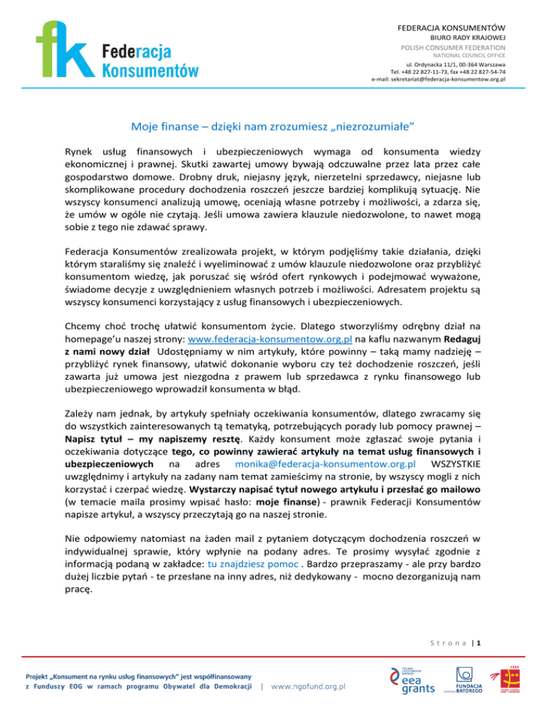 FEDERACJA KONSUMENTÓW BIURO RADY KRAJOWEJ POLISH CONSUMER FEDERATION NATIONAL COUNCIL OFFICE ul. Ordynacka 11/1, 00-364 Warszawa Tel. +48 22 827-11-73, fax +48 22 827-54-74 e-mail: [email protected] Moje finanse – dzięki nam zrozumiesz „niezrozumiałe” Rynek usług finansowych i ubezpieczeniowych wymaga od konsumenta wiedzy ekonomicznej i prawnej. Skutki zawartej umowy bywają odczuwalne przez lata przez całe gospodarstwo domowe. Drobny druk, niejasny język, nierzetelni sprzedawcy, niejasne lub skomplikowane procedury dochodzenia roszczeń jeszcze bardziej komplikują sytuację. Nie wszyscy konsumenci analizują umowę, oceniają własne potrzeby i możliwości, a zdarza się, że umów w ogóle nie czytają. Jeśli umowa zawiera klauzule niedozwolone, to nawet mogą sobie z tego nie zdawać sprawy. Federacja Konsumentów zrealizowała projekt, w którym podjęliśmy takie działania, dzięki którym staraliśmy się znaleźć i wyeliminować z umów klauzule niedozwolone oraz przybliżyć konsumentom wiedzę, jak poruszać się wśród ofert rynkowych i podejmować wyważone, świadome decyzje z uwzględnieniem własnych potrzeb i możliwości. Adresatem projektu są wszyscy konsumenci korzystający z usług finansowych i ubezpieczeniowych. Chcemy choć trochę ułatwić konsumentom życie. Dlatego stworzyliśmy odrębny dział na homepage’u naszej strony: www.federacja-konsumentow.org.pl na kaflu nazwanym Redaguj z nami nowy dział Udostępniamy w nim artykuły, które powinny – taką mamy nadzieję – przybliżyć rynek finansowy, ułatwić dokonanie wyboru czy też dochodzenie roszczeń, jeśli zawarta już umowa jest niezgodna z prawem lub sprzedawca z rynku finansowego lub ubezpieczeniowego wprowadził konsumenta w błąd. Zależy nam jednak, by artykuły spełniały oczekiwania konsumentów, dlatego zwracamy się do wszystkich zainteresowanych tą tematyką, potrzebujących porady lub pomocy prawnej – Napisz tytuł – my napiszemy resztę. Każdy konsument może zgłaszać swoje pytania i oczekiwania dotyczące tego, co powinny zawierać artykuły na temat usług finansowych i ubezpieczeniowych na adres [email protected] WSZYSTKIE uwzględnimy i artykuły na zadany nam temat zamieścimy na stronie, by wszyscy mogli z nich korzystać i czerpać wiedzę. Wystarczy napisać tytuł nowego artykułu i przesłać go mailowo (w temacie maila prosimy wpisać hasło: moje finanse) - prawnik Federacji Konsumentów napisze artykuł, a wszyscy przeczytają go na naszej stronie. Nie odpowiemy natomiast na żaden mail z pytaniem dotyczącym dochodzenia roszczeń w indywidualnej sprawie, który wpłynie na podany adres. Te prosimy wysyłać zgodnie z informacją podaną w zakładce: tu znajdziesz pomoc . Bardzo przepraszamy - ale przy bardzo dużej liczbie pytań - te przesłane na inny adres, niż dedykowany - mocno dezorganizują nam pracę. S t r o n a |1 S t r o n a |2