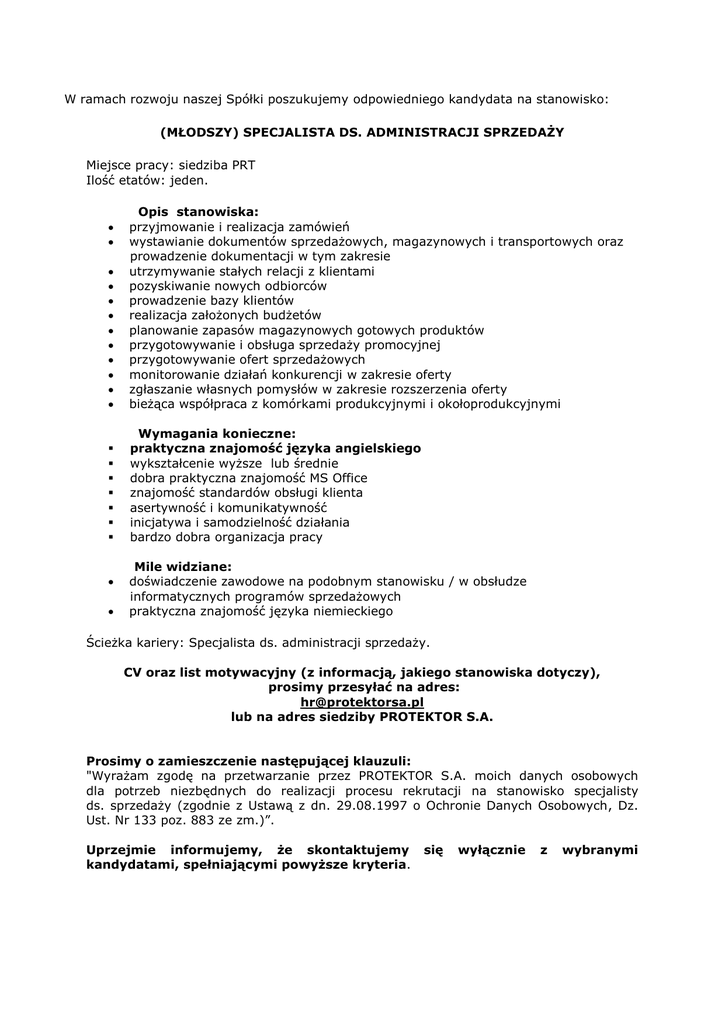 W ramach rozwoju naszej Spółki poszukujemy odpowiedniego kandydata na stanowisko: (MŁODSZY) SPECJALISTA DS. ADMINISTRACJI SPRZEDAŻY Miejsce pracy: siedziba PRT Ilość etatów: jeden. Opis stanowiska: przyjmowanie i realizacja zamówień wystawianie dokumentów sprzedażowych, magazynowych i transportowych oraz prowadzenie dokumentacji w tym zakresie utrzymywanie stałych relacji z klientami pozyskiwanie nowych odbiorców prowadzenie bazy klientów realizacja założonych budżetów planowanie zapasów magazynowych gotowych produktów przygotowywanie i obsługa sprzedaży promocyjnej przygotowywanie ofert sprzedażowych monitorowanie działań konkurencji w zakresie oferty zgłaszanie własnych pomysłów w zakresie rozszerzenia oferty bieżąca współpraca z komórkami produkcyjnymi i okołoprodukcyjnymi Wymagania konieczne: praktyczna znajomość języka angielskiego wykształcenie wyższe lub średnie dobra praktyczna znajomość MS Office znajomość standardów obsługi klienta asertywność i komunikatywność inicjatywa i samodzielność działania bardzo dobra organizacja pracy Mile widziane: doświadczenie zawodowe na podobnym stanowisku / w obsłudze informatycznych programów sprzedażowych praktyczna znajomość języka niemieckiego Ścieżka kariery: Specjalista ds. administracji sprzedaży. CV oraz list motywacyjny (z informacją, jakiego stanowiska dotyczy), prosimy przesyłać na adres: [email protected] lub na adres siedziby PROTEKTOR S.A. Prosimy o zamieszczenie następującej klauzuli: "Wyrażam zgodę na przetwarzanie przez PROTEKTOR S.A. moich danych osobowych dla potrzeb niezbędnych do realizacji procesu rekrutacji na stanowisko specjalisty ds. sprzedaży (zgodnie z Ustawą z dn. 29.08.1997 o Ochronie Danych Osobowych, Dz. Ust. Nr 133 poz. 883 ze zm.)”. Uprzejmie informujemy, że skontaktujemy kandydatami, spełniającymi powyższe kryteria. się wyłącznie z wybranymi