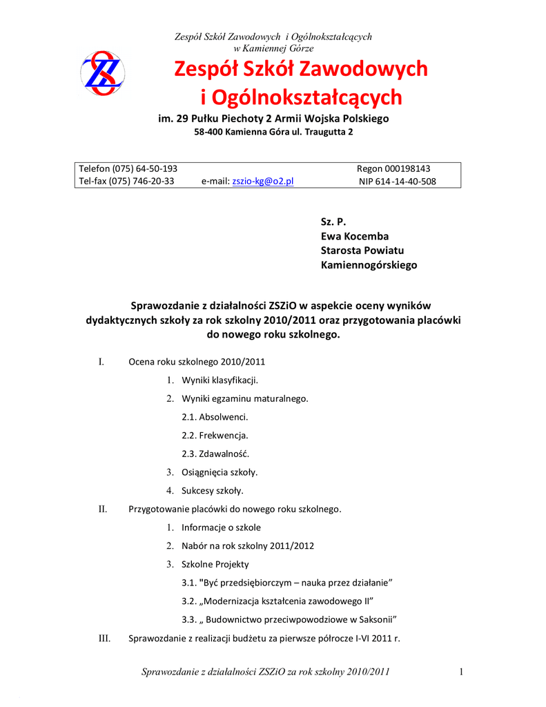 Zespół Szkół Zawodowych i Ogólnokształcących w Kamiennej Górze Zespół Szkół Zawodowych i Ogólnokształcących im. 29 Pułku Piechoty 2 Armii Wojska Polskiego 58-400 Kamienna Góra ul. Traugutta 2 Telefon (075) 64-50-193 Tel-fax (075) 746-20-33 Regon 000198143 NIP 614 -14-40-508 e-mail: [email protected] Sz. P. Ewa Kocemba Starosta Powiatu Kamiennogórskiego Sprawozdanie z działalności ZSZiO w aspekcie oceny wyników dydaktycznych szkoły za rok szkolny 2010/2011 oraz przygotowania placówki do nowego roku szkolnego. I. Ocena roku szkolnego 2010/2011 1. Wyniki klasyfikacji. 2. Wyniki egzaminu maturalnego. 2.1. Absolwenci. 2.2. Frekwencja. 2.3. Zdawalność. 3. Osiągnięcia szkoły. 4. Sukcesy szkoły. II. Przygotowanie placówki do nowego roku szkolnego. 1. Informacje o szkole 2. Nabór na rok szkolny 2011/2012 3. Szkolne Projekty 3.1. "Być przedsiębiorczym – nauka przez działanie” 3.2. „Modernizacja kształcenia zawodowego II” 3.3. „ Budownictwo przeciwpowodziowe w Saksonii” III. Sprawozdanie z realizacji budżetu za pierwsze półrocze I-VI 2011 r. Sprawozdanie z działalności ZSZiO za rok szkolny 2010/2011 1 Zespół Szkół Zawodowych i Ogólnokształcących w Kamiennej Górze Ad.I.1 WYNIKI KLASYFIKACJI WYNIKI KLASYFIKACJI W SZKOŁACH DZIENNYCH KLASYFIKACJA KOŃCOWA - KLASY MATURALNE Dnia 19.04.2011 Rada Pedagogiczna podjęła uchwałę w sprawie klasyfikowania i ukończenia szkoły przez uczniów 4 klas technikum i 1 klasy liceum profilowanego. W dniu klasyfikacji: 132 uczniów Promowanych: 132 uczniów KLASYFIKACJA KOŃCOWA – KLASY ZASADNICZEJ SZKOŁY ZAWODOWEJ Dnia 7.06.2011 r. Rada Pedagogiczna podjęła uchwałę w sprawie klasyfikowania i ukończenia szkoły przez uczniów 6 klas kończących Zasadniczą Szkołę Zawodową. W dniu klasyfikacji: 129 uczniów Promowanych: 128 uczniów Niepromowanych: 1 uczeń. KLASYFIKACJA ROCZNA – KLASY PROMOCYJNE: TECHNIKUM, LICEUM PROFILOWANE, ZASADNICZA SZKOŁA ZAWODOWA. Dnia 17.06.2011 r. Rada Pedagogiczna promowała i klasyfikowała uczniów klas promocyjnych: Technikum 15 oddziałów W dniu klasyfikacji: 393 uczniów Promowanych: 347 uczniów Niepromowanych: 18 uczniów Wyznaczono: 29 egzaminów poprawkowych i 1 egzamin klasyfikacyjny. Liceum Profilowane 2 oddziały W dniu klasyfikacji: 56 uczniów Promowanych: 46 uczniów Niepromowanych: 4 uczniów Wyznaczono: 6 egzaminów poprawkowych. Sprawozdanie z działalności ZSZiO za rok szkolny 2010/2011 2 Zespół Szkół Zawodowych i Ogólnokształcących w Kamiennej Górze Zasadnicza Szkoła Zawodowa 9 oddziałów W dniu klasyfikacji: 206 uczniów Promowanych: 195 uczniów Nie promowanych: 8 uczniów Wyznaczono: 3 egzaminy poprawkowe. WYNIKI KLASYFIKACJI W SZKOŁACH DLA DOROSŁYCH W roku szkolnym 2010/11 funkcjonowały w ZSZiO 2 oddziały stacjonarnego Uzupełniającego Liceum Ogólnokształcącego dla Dorosłych. Na początku roku szkolnego Uzupełniające Liceum Ogólnokształcące dla Dorosłych liczyło ogółem 47 słuchaczy: 26 – w klasie I i 21 – w klasie II. W wyniku klasyfikacji po pierwszym semestrze liczba słuchaczy spadła do 32 (kl. I – 14; kl. II – 18), przy czym 20 słuchaczy zrezygnowało z nauki jeszcze przed klasyfikacją. Średnia frekwencja w I semestrze ukształtowała się na poziomie 62,20% (kl. I – 49,70%; kl. II – 74,70%). W wyniku klasyfikacji po drugim semestrze 11 słuchaczy uzyskało promocję na semestr III i tyleż samo słuchaczy klasy drugiej ukończyło szkołę. 4 słuchom wyznaczono egzamin poprawkowy z przedmiotów: język polski ( 3 osoby), wiedza o społeczeństwie ( 1 osoba). Średnia frekwencja w II semestrze ukształtowała się na poziomie 86,80% (kl. I – 89,28%; kl. II – 84,30%). Sprawozdanie z działalności ZSZiO za rok szkolny 2010/2011 3 Zespół Szkół Zawodowych i Ogólnokształcących w Kamiennej Górze Ad.I.2 WYNIKI EGZAMINU MATURALNEGO 2.I. ABSOLWENCI W roku szkolnym 2010/11 przystąpienie do egzaminu maturalnego w ZSZiO w Kamiennej Górze zadeklarowało 182 absolwentów. Spośród tej liczby 51 stanowili absolwenci lat ubiegłych, 131 – absolwenci roku bieżącego, co stanowiło 91,6% ogólnej liczby absolwentów klas maturalnych. 12 absolwentów (8,4%) nie wyraziło woli przystąpienia do egzaminu maturalnego w 2011 roku, z czego 5 to absolwenci Uzupełniającego Liceum Ogólnokształcącego dla Dorosłych, 5 – absolwenci technikum kształcącego w zawodzie kucharz i 2 – absolwenci Liceum Profilowanego. Tegoroczni abiturienci (roku bieżącego) byli absolwentami trzech typów szkół: Technikum, Liceum Profilowanego i Uzupełniającego Liceum Ogólnokształcącego dla Dorosłych. Tabela 1. Deklaracje absolwentów lp. w tym 1. 2. 3. nie liczba zadeklarowało zadeklarowało absolw. liczba % liczba % typ szkoły Technikum 102 97 95,1 5 4,9 technik hotelarstwa 27 27 100,0 0 0,0 technik ekonomista 21 21 100,0 0 0,0 kucharz 23 18 78,3 5 21,7 technik budownictwa 31 31 100,0 0 0,0 30 28 93,3 2 6,7 11 6 54,5 5 45,5 143 131 91,6 12 8,4 Liceum Profilowane Uzupełniające Liceum Ogólnokształcące dla Dorosłych Ogółem Sprawozdanie z działalności ZSZiO za rok szkolny 2010/2011 4 Zespół Szkół Zawodowych i Ogólnokształcących w Kamiennej Górze 2.2. FREKWENCJA Do egzaminu maturalnego przystąpiło ogółem 130 absolwentów roku bieżącego (99,2%). Jest to liczba absolwentów, którzy przystąpili chociaż do jednego z zadeklarowanych egzaminów obowiązkowych. 1 absolwent (0,8%), mimo deklaracji, do żadnego z egzaminów nie przystąpił. W rozbiciu na poszczególne typy szkół frekwencja na egzaminie maturalnym przedstawia się następująco: Tabela 2. Frekwencja lp. w tym 1. 2. 3. zadeklarowało typ szkoły przystapiło nie przystąpiło liczba % liczba % 97 97 100,0 0 0,0 technik hotelarstwa 27 27 100,0 0 0,0 technik ekonomista 21 21 100,0 0 0,0 kucharz 18 18 100,0 0 0,0 technik budownictwa 31 31 100,0 0 0,0 28 27 96,4 1 3,6 6 6 100,0 0 0,0 131 130 99,2 1 0,8 Technikum Liceum Pro