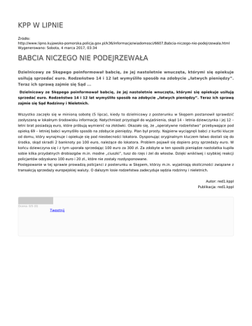 KPP W LIPNIE Źródło: http://www.lipno.kujawsko-pomorska.policja.gov.pl/k36/informacje/wiadomosci/6607,Babcia-niczego-nie-podejrzewala.html Wygenerowano: Sobota, 4 marca 2017, 03:34 BABCIA NICZEGO NIE PODEJRZEWAŁA Dzielnicowy ze Skępego poinformował babcię, że jej nastoletnie wnuczęta, którymi się opiekuje usiłują sprzedać euro. Rodzeństwo 14 i 12 lat wymyśliło sposób na zdobycie „łatwych pieniędzy”. Teraz ich sprawą zajmie się Sąd ... Dzielnicowy ze Skępego poinformował babcię, że jej nastoletnie wnuczęta, którymi się opiekuje usiłują sprzedać euro. Rodzeństwo 14 i 12 lat wymyśliło sposób na zdobycie „łatwych pieniędzy”. Teraz ich sprawą zajmie się Sąd Rodzinny i Nieletnich. Wszystko zaczęło się w minioną sobotę (5 lipca), kiedy to dzielnicowy z posterunku w Skępem postanowił sprawdzić zasłyszaną w lokalnym środowisku informację. Natychmiast przystąpił do wyjaśnienia, skąd 14 – letnia dziewczynka i jej 12 – letni brat posiadają euro, które próbują wymienić na złotówki. Okazało się, że „operatywne rodzeństwo” przebywające pod opieką 69 – letniej babci wymyśliło sposób na zdobycie pieniędzy. Plan był prosty. Najpierw wyciągnęli babci z kurtki klucze od domu, który wynajmuje i opiekuje się pod nieobecności lokatora. Dysponując oryginalnym kluczem łatwo dostali się do środka, skąd skradli 2 banknoty po 100 euro, należące do lokatora. Problem pojawił się dopiero przy sprzedaży euro. W końcu dziewczyna się i z tym uporała sprzedając 100 euro za 300 zł. Za zdobyte w ten sposób pieniądze nastolatka kupiła sobie kilka przydatnych drobiazgów m.in. modne „ciuszki”, tusz do rzęs i żel do włosów. Dzięki wnikliwej i szybkiej reakcji policjantów odzyskano 100 euro i 20 zł., które nie zostały rozdysponowane. Postępowanie w tej sprawie prowadzą policjanci z posterunku w Skępem, którzy m.in. wyjaśniają okoliczności związane z transakcją sprzedaży europejskiej waluty. O dalszym losie rodzeństwa zadecyduje sędzia rodzinny i nieletnich. Autor: red1.kppl Publikacja: red1.kppl Ocena: 0/5 (0) Tweetnij