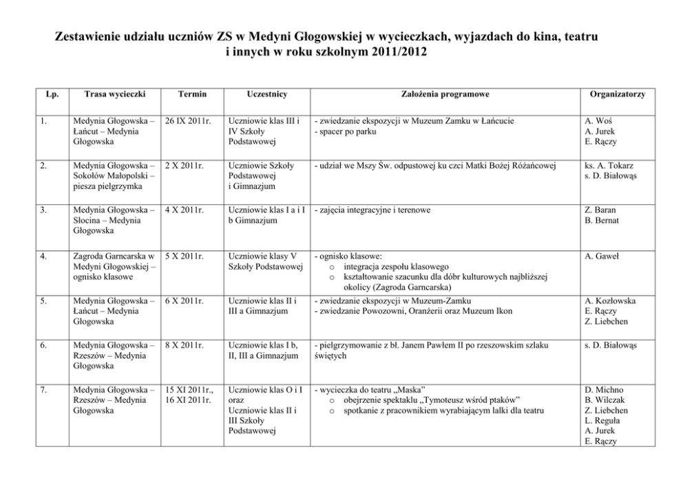 Zestawienie udziału uczniów ZS w Medyni Głogowskiej w wycieczkach, wyjazdach do kina, teatru i innych w roku szkolnym 2011/2012 Lp. Trasa wycieczki Termin Uczestnicy ZałoŜenia programowe Organizatorzy 1. Medynia Głogowska – Łańcut – Medynia Głogowska 26 IX 2011r. Uczniowie klas III i IV Szkoły Podstawowej - zwiedzanie ekspozycji w Muzeum Zamku w Łańcucie - spacer po parku A. Woś A. Jurek E. Rączy 2. Medynia Głogowska – Sokołów Małopolski – piesza pielgrzymka 2 X 2011r. Uczniowie Szkoły Podstawowej i Gimnazjum - udział we Mszy Św. odpustowej ku czci Matki BoŜej RóŜańcowej ks. A. Tokarz s. D. Białowąs 3. Medynia Głogowska – Słocina – Medynia Głogowska 4 X 2011r. Uczniowie klas I a i I b Gimnazjum - zajęcia integracyjne i terenowe Z. Baran B. Bernat 4. Zagroda Garncarska w Medyni Głogowskiej – ognisko klasowe 5 X 2011r. Uczniowie klasy V Szkoły Podstawowej - ognisko klasowe: o integracja zespołu klasowego o kształtowanie szacunku dla dóbr kulturowych najbliŜszej okolicy (Zagroda Garncarska) A. Gaweł 5. Medynia Głogowska – Łańcut – Medynia Głogowska 6 X 2011r. Uczniowie klas II i III a Gimnazjum - zwiedzanie ekspozycji w Muzeum-Zamku - zwiedzanie Powozowni, OranŜerii oraz Muzeum Ikon A. Kozłowska E. Rączy Z. Liebchen 6. Medynia Głogowska – Rzeszów – Medynia Głogowska 8 X 2011r. Uczniowie klas I b, II, III a Gimnazjum - pielgrzymowanie z bł. Janem Pawłem II po rzeszowskim szlaku świętych s. D. Białowąs 7. Medynia Głogowska – Rzeszów – Medynia Głogowska 15 XI 2011r., 16 XI 2011r. Uczniowie klas O i I oraz Uczniowie klas II i III Szkoły Podstawowej - wycieczka do teatru „Maska” o obejrzenie spektaklu „Tymoteusz wśród ptaków” o spotkanie z pracownikiem wyrabiającym lalki dla teatru D. Michno B. Wilczak Z. Liebchen L. Reguła A. Jurek E. Rączy 8. Medynia Głogowska – Rzeszów – Medynia Głogowska 16 IV 2012r. Uczniowie klas O, I, II Szkoły Podstawowej - wyjazd do kina „Helios” o obejrzenie filmu pt. „Piraci” D. Michno B. Wilczak L. Reguła 9. Medynia Głogowska – Łańcut – Medynia Głogowska 10 V 2012r. Uczniowie klas III a i III b Gimnazjum - X Targi Edukacyjne Szkół Ponadgimnazjalnych w MDK w Łańcucie Z. Liebchen 10. Medynia Głogowska – Kalwaria Pacławska – Bolestraszyce 17 V 2012r. Uczniowie klasy II Szkoły Podstawowej - pielgrzymka dziękczynna za dar I Komunii Świętej - zwiedzanie ogrodu botanicznego s. D. Białowąs L. Reguła ks. A. Tokarz 11. Medynia Głogowska – Władysławowo – Gdańsk – Gdynia – Sopot – Medynia Głogowska Medynia Głogowska 20 V 2012r. – 26 V 2012r. Uczniowie klas I – III Gimnazjum - poznawanie środowiska wybrzeŜa Bałtyku – ukształtowania terenu - zwiedzanie zabytków związanych z drugą wojną światową - prowadzenie zajęć profilaktycznych Z. Baran B. Bernat L. Reguła E. Wandas 25 V 2012r. Uczniowie klasy I Szkoły Podstawowej - wycieczka do Galerii Rzeźby pani Władysławy Prucnal o obejrzenie eksponatów B. Wilczak 13. Medynia Głogowska – Bieszczady – Słowacja – Medynia Głogowska 14 VI 2012r. – 15 VI 2012r. Uczniowie klas V i VI Szkoły Podstawowej - poznawanie środowiska przyrodniczego, tradycji i zabytków Bieszczad - zwiedzanie parku krajobrazowego Vihorlot oraz WyŜyny Laboreckiej na Słowacji A. Gaweł Z. Liebchen M. Jaźwa E. Kiwała 14. Medynia Głogowska – Trzcinnica – Kamieniec – Bórka – Myczkowce – Ustrzyki Dolne – Solina – Medynia Głogowska 19 VI 2012r. – 20 VI 2012r. Uczniowie klas III i IV - poznawanie atrakcji turystycznych Bieszczadów o Karpacka Troja w Trzcinnicy o zamek kamieniec o Muzeum Przemysłu Naftowego w Bóbrce o Muzeum Przyrodnicze w Ustrzykach Dolnych o Skansen w Sanoku A. Woś A. Jurek 12.