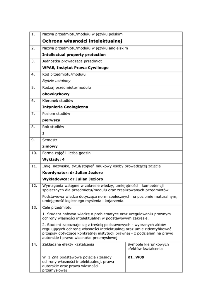 1. Nazwa przedmiotu/modułu w języku polskim Ochrona własności intelektualnej 2. Nazwa przedmiotu/modułu w języku angielskim Intellectual property protection 3. Jednostka prowadząca przedmiot WPAE, Instytut Prawa Cywilnego 4. Kod przedmiotu/modułu Będzie ustalony 5. Rodzaj przedmiotu/modułu obowiązkowy 6. Kierunek studiów Inżynieria Geologiczna 7. Poziom studiów pierwszy 8. Rok studiów I 9. Semestr zimowy 10. Forma zajęć i liczba godzin Wykłady: 4 11. Imię, nazwisko, tytuł/stopień naukowy osoby prowadzącej zajęcia Koordynator: dr Julian Jezioro Wykładowca: dr Julian Jezioro 12. Wymagania wstępne w zakresie wiedzy, umiejętności i kompetencji społecznych dla przedmiotu/modułu oraz zrealizowanych przedmiotów Podstawowa wiedza dotycząca norm społecznych na poziomie maturalnym, umiejętność logicznego myślenia i kojarzenia. 13. Cele przedmiotu 1. Student nabywa wiedzę o problematyce oraz uregulowaniu prawnym ochrony własności intelektualnej w podstawowym zakresie. 2. Student zapoznaje się z treścią podstawowych - wybranych aktów regulujących ochronę własności intelektualnej oraz umie zidentyfikować przepisy dotyczące konkretnej instytucji prawnej - z podziałem na prawo autorskie i prawo własności przemysłowej. 14. Zakładane efekty kształcenia Symbole kierunkowych efektów kształcenia W_1 Zna podstawowe pojęcia i zasady ochrony własności intelektualnej, prawa autorskie oraz prawa własności przemysłowej K1_W09 15. U_1 Potrafi wyszukiwać i wykorzystywać publikacje źródłowe, w tym internetowe oraz potrafi poprawnie wnioskować na podstawie danych z różnych źródeł K1_U10, K1_U11 K_1 Jest zdolny do obiektywnej oceny wykonanej pracy Treści programowe K1_K07 Wykłady: I. Zagadnienia ogólne Pojęcie i wewnętrzna systematyka własności intelektualnej. Geneza i źródła prawa polskiego i regulacji międzynarodowych, prawo własności intelektualnej w UE (1 godz.) II. Zagadnienia szczegółowe: 1. Prawo autorskie: Przedmiot prawa autorskiego – utwory, przedmioty praw pokrewnych oraz bazy danych w ogólności. Podmioty i treść praw autorskich i pokrewnych. Skutki naruszenia praw autorskich (1,5 godz.). 2. Prawo własności przemysłowej: Projekty wynalazcze oraz oznaczenia pochodzenia towarów i usług w ogólności. Podmioty uprawnione i treść praw do przedmiotów własności przemysłowej. Rola Urzędu Patentowego RP. Skutki naruszenia praw do przedmiotów własności przemysłowej (1,5 godz.). 16. Zalecana literatura Literatura podstawowa: J. Jezioro, Prawo własności intelektualnej, w: Podstawy prawa cywilnego pod redakcją E. Gniewka, Warszawa 2011. Literatura uzupełniająca: 17. J. Barta, R. Markiewicz, Prawo autorskie, Warszawa 2013. P. L. Conde, J. M. Iruretagoyena, W. Jaślan, J. M. Plazas, Prawo własności intelektualnej w Unii Europejskiej, Warszawa 2003 A. Szewc, G. Jyż, Prawo własności przemysłowej, Warszawa 2010. Forma zaliczenia poszczególnych komponentów przedmiotu/modułu, sposób sprawdzenia osiągnięcia zamierzonych efektów kształcenia: Wykłady: Sprawdzian teoretyczny - test zamknięty, W_1, U_1, K_1 18. Język wykładowy polski 19. Obciążenie pracą studenta: Forma aktywności studenta Średnia liczba godzin na zrealizowanie aktywności Godziny zajęć (wg planu studiów) z nauczycielem: - wykład: 4 4 Praca własna studenta np.: - czytanie wskazanej literatury: 20 20 Suma godzin 24 Liczba punktów ECTS 1