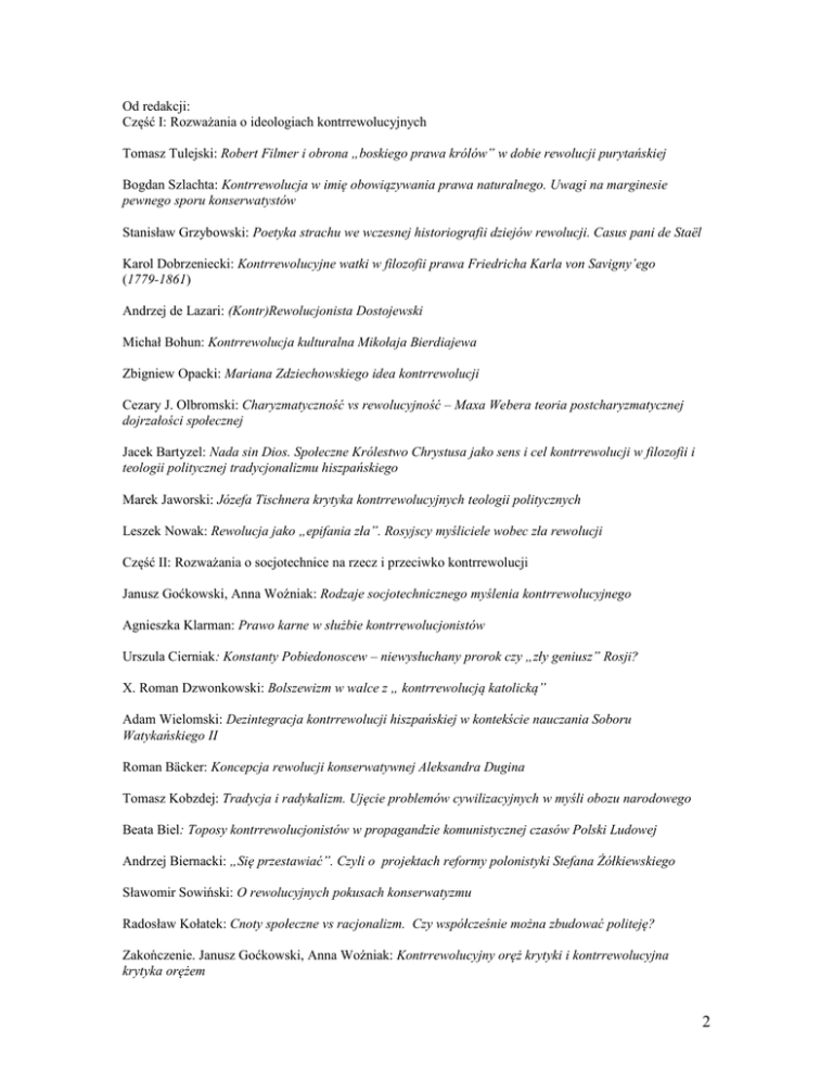 Od redakcji: Część I: Rozważania o ideologiach kontrrewolucyjnych Tomasz Tulejski: Robert Filmer i obrona „boskiego prawa królów” w dobie rewolucji purytańskiej Bogdan Szlachta: Kontrrewolucja w imię obowiązywania prawa naturalnego. Uwagi na marginesie pewnego sporu konserwatystów Stanisław Grzybowski: Poetyka strachu we wczesnej historiografii dziejów rewolucji. Casus pani de Staël Karol Dobrzeniecki: Kontrrewolucyjne watki w filozofii prawa Friedricha Karla von Savigny’ego (1779-1861) Andrzej de Lazari: (Kontr)Rewolucjonista Dostojewski Michał Bohun: Kontrrewolucja kulturalna Mikołaja Bierdiajewa Zbigniew Opacki: Mariana Zdziechowskiego idea kontrrewolucji Cezary J. Olbromski: Charyzmatyczność vs rewolucyjność – Maxa Webera teoria postcharyzmatycznej dojrzałości społecznej Jacek Bartyzel: Nada sin Dios. Społeczne Królestwo Chrystusa jako sens i cel kontrrewolucji w filozofii i teologii politycznej tradycjonalizmu hiszpańskiego Marek Jaworski: Józefa Tischnera krytyka kontrrewolucyjnych teologii politycznych Leszek Nowak: Rewolucja jako „epifania zła”. Rosyjscy myśliciele wobec zła rewolucji Część II: Rozważania o socjotechnice na rzecz i przeciwko kontrrewolucji Janusz Goćkowski, Anna Woźniak: Rodzaje socjotechnicznego myślenia kontrrewolucyjnego Agnieszka Klarman: Prawo karne w służbie kontrrewolucjonistów Urszula Cierniak: Konstanty Pobiedonoscew – niewysłuchany prorok czy „zły geniusz” Rosji? X. Roman Dzwonkowski: Bolszewizm w walce z „ kontrrewolucją katolicką” Adam Wielomski: Dezintegracja kontrrewolucji hiszpańskiej w kontekście nauczania Soboru Watykańskiego II Roman Bäcker: Koncepcja rewolucji konserwatywnej Aleksandra Dugina Tomasz Kobzdej: Tradycja i radykalizm. Ujęcie problemów cywilizacyjnych w myśli obozu narodowego Beata Biel: Toposy kontrrewolucjonistów w propagandzie komunistycznej czasów Polski Ludowej Andrzej Biernacki: „Się przestawiać”. Czyli o projektach reformy polonistyki Stefana Żółkiewskiego Sławomir Sowiński: O rewolucyjnych pokusach konserwatyzmu Radosław Kołatek: Cnoty społeczne vs racjonalizm. Czy współcześnie można zbudować politeję? Zakończenie. Janusz Goćkowski, Anna Woźniak: Kontrrewolucyjny oręż krytyki i kontrrewolucyjna krytyka orężem 2