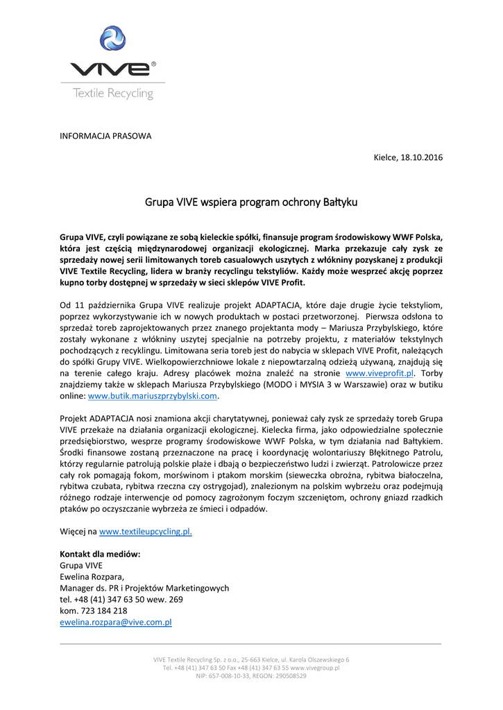 INFORMACJA PRASOWA Kielce, 18.10.2016 Grupa VIVE wspiera program ochrony Bałtyku Grupa VIVE, czyli powiązane ze sobą kieleckie spółki, finansuje program środowiskowy WWF Polska, która jest częścią międzynarodowej organizacji ekologicznej. Marka przekazuje cały zysk ze sprzedaży nowej serii limitowanych toreb casualowych uszytych z włókniny pozyskanej z produkcji VIVE Textile Recycling, lidera w branży recyclingu tekstyliów. Każdy może wesprzeć akcję poprzez kupno torby dostępnej w sprzedaży w sieci sklepów VIVE Profit. Od 11 października Grupa VIVE realizuje projekt ADAPTACJA, które daje drugie życie tekstyliom, poprzez wykorzystywanie ich w nowych produktach w postaci przetworzonej. Pierwsza odsłona to sprzedaż toreb zaprojektowanych przez znanego projektanta mody – Mariusza Przybylskiego, które zostały wykonane z włókniny uszytej specjalnie na potrzeby projektu, z materiałów tekstylnych pochodzących z recyklingu. Limitowana seria toreb jest do nabycia w sklepach VIVE Profit, należących do spółki Grupy VIVE. Wielkopowierzchniowe lokale z niepowtarzalną odzieżą używaną, znajdują się na terenie całego kraju. Adresy placówek można znaleźć na stronie www.viveprofit.pl. Torby znajdziemy także w sklepach Mariusza Przybylskiego (MODO i MYSIA 3 w Warszawie) oraz w butiku online: www.butik.mariuszprzybylski.com. Projekt ADAPTACJA nosi znamiona akcji charytatywnej, ponieważ cały zysk ze sprzedaży toreb Grupa VIVE przekaże na działania organizacji ekologicznej. Kielecka firma, jako odpowiedzialne społecznie przedsiębiorstwo, wesprze programy środowiskowe WWF Polska, w tym działania nad Bałtykiem. Środki finansowe zostaną przeznaczone na pracę i koordynację wolontariuszy Błękitnego Patrolu, którzy regularnie patrolują polskie plaże i dbają o bezpieczeństwo ludzi i zwierząt. Patrolowicze przez cały rok pomagają fokom, morświnom i ptakom morskim (sieweczka obrożna, rybitwa białoczelna, rybitwa czubata, rybitwa rzeczna czy ostrygojad), znalezionym na polskim wybrzeżu oraz podejmują różnego rodzaje interwencje od pomocy zagrożonym foczym szczeniętom, ochrony gniazd rzadkich ptaków po oczyszczanie wybrzeża ze śmieci i odpadów. Więcej na www.textileupcycling.pl. Kontakt dla mediów: Grupa VIVE Ewelina Rozpara, Manager ds. PR i Projektów Marketingowych tel. +48 (41) 347 63 50 wew. 269 kom. 723 184 218 [email protected] VIVE Textile Recycling Sp. z o.o., 25-663 Kielce, ul. Karola Olszewskiego 6 Tel. +48 (41) 347 63 50 Fax +48 (41) 347 63 55 www.vivegroup.pl NIP: 657-008-10-33, REGON: 290508529 Magdalena Chłopek Specjalista ds. komunikacji wewnętrznej i PR tel. 723 172 524 [email protected] Grupa VIVE Dziewięć powiązanych ze sobą spółek, z których główna – VIVE Textile Recycling, została założona w 1992 roku i od wielu lat jest liderem w branży recyclingu tekstyliów. Grupa VIVE nieustannie rozwija działalność w kolejnych obszarach, takich jak transport i logistyka, optymalizacja kosztów ponoszonych przez przedsiębiorstwa, czy innowacyjne metody recyklingu. W skład grupy wchodzą: VIVE Textile Recycling, VIVE Transport, VIVE Profit Center, VIVE Properties, VIVE Biznes, VIVE Innovation, VIVE Retail Services, Dimatex i Eco-Collections. Jednocześnie, jako przedsiębiorca odpowiedzialny społecznie, VIVE Group wspiera działalność Klubu Sportowego VIVE Handball Kielce oraz Fundacji VIVE Serce Dzieciom. VIVE Textile Recycling Główna spółka wchodząca w skład VIVE Group, lider w dziedzinie recyklingu tekstyliów w Polsce i Europie. Firma posiada najnowocześniejsze w Polsce, w pełni skomputeryzowane linie do sortowania odzieży, które umożliwiają przerób ponad 300 ton surowca na dobę, z zachowaniem najwyższych standardów jakościowych ISO 9001 i 14001. Każdego dnia ponad 800-osobowa załoga w systemie 3 zmianowym sortuje i pakuje gotowe produkty z 700 różnych grup asortymentowych. Tak przygotowane produkty trafiają do ponad 60 krajów na świecie oraz do sieci sklepów detalicznych VIVE Profit na terenie kraju. Firma produkuje również czyściwo przemysłowe wykorzystywane przez przedsiębiorstwa z wielu branż. Spółka stawia sobie za cel stuprocentowe wykorzystanie odzieży używanej, segregowanej każdego dnia w ilości setek ton. VIVE Profit Center Spółka wchodząca w skład VIVE Group, zajmująca się rozwojem i zarządzaniem sieci wielkopowierzchniowych sklepów z niepowtarzalną odzieżą – VIVE Profit. Obecnie spółka posiada kilkadziesiąt sklepów detalicznych w Polsce centralnej ,południowej i wschodniej, stale rozbudowując sieć w całym kraju. Duża powierzchnia każdego sklepu daje klientom ogromny wybór i pozwala na dokonywanie zakupów w komfortowych warunkach, a oferowany towar w zależności od rodzaju, eksponowany jest na wieszakach, półkach lub w koszach. Każdy ze sklepów sieci oferuje klientom ponad 100 000 sztuk markowej odzieży w cyklu 7 dniowym. Po tygodniu następuje całkowita wymiana asortymentu. VIVE Textile Recycling Sp. z o.o., 25-663 Kielce, ul. Karola Olszewskiego 6 Tel. +48 (41) 347 63 50 Fax +48 (41) 347 63 55 www.vivegroup.pl NIP: 657-008-10-33, REGON: 290508529