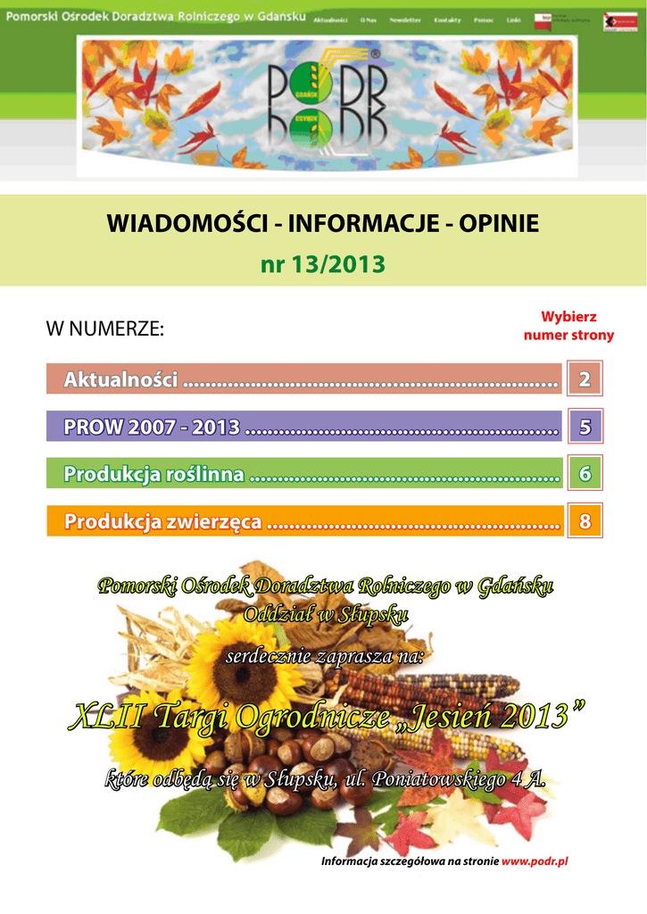 WIADOMOŚCI - INFORMACJE - OPINIE nr 13/2013 Wybierz numer strony W NUMERZE: Aktualności .................................................................. 2 PROW 2007 - 2013 ....................................................... 5 Produkcja roślinna ....................................................... 6 Produkcja zwierzęca .................................................... 8 Pomorski Ośrodek Doradztwa Rolniczego w Gdańsku Oddział w Słupsku serdecznie zaprasza na: XLII Targi Ogrodnicze „Jesień 2013” które odbędą się w Słupsku, ul. Poniatowskiego 4 A. Informacja szczegółowa na stronie www.podr.pl Aktualności Zapraszamy na seminarium 2 Aktualności Pomoc dla pszczelarzy Agencja Rynku Rolnego zaprasza do składania projektów w ramach mechanizmu „Wsparcie rynku produktów pszczelich” w sezonie 2013/2014. Podmiotami uprawnionymi do składania projektów w ramach ww. mechanizmu mogą być, w zależności od realizowanego działania: •związki pszczelarskie, •stowarzyszenia pszczelarzy, •zrzeszenia pszczelarzy •spółdzielnie pszczelarskie, •grupy producenckie pszczelarzy, •jednostki badawczo-rozwojowe zajmujące się problematyką pszczelarską. W sezonie 2013/2014 refundacji podlegać będą koszty poniesione na realizację następujących działań: •przeprowadzenie szkoleń •zakup sprzętu pszczelarskiego •zakup środków warrozobójczych •zakup lawet do przewozu uli •zakup urządzeń laboratoryjnych •wykonanie analiz jakości miodu •zakup matek, pakietów, odkładów pszczelich, •wdrażanie programów badawczych •produkcja filmu edukacyjno – instruktażowego dotyczącego stosowania leków warrozobójczych. Projekt należy dostarczyć osobiście lub listem poleconym do Kancelarii Ogólnej Agencji Rynku Rolnego w Warszawie, ul. Nowy Świat 6/12, w nieprzekraczalnym terminie do 31 października 2013 r. Szczegółowe informacje można uzyskać: •w Biurze Produktów Zwierzęcych Agencji Rynku Rolnego, 00-400 Warszawa, ul. Nowy Świat 6/12, tel. (22) 661-71-99, 661-73-16, •w Oddziałach Terenowych ARR, •na stronie internetowej www.arr.gov.pl ARiMR poręcza spłaty kredytów studenckich ARiMR udziela poręczeń spłaty kredytów studenckich zaciąganych przez studentów mieszkających na obszarach wiejskich. Poręczenia udzielane są do wysokości od 80% do 100% kwoty kredytu (w zależności od dochodu w rodzinie). Kredyt studencki z poręczeniem ARiMR można uzyskać wyłącznie w bankach, które zawarły z Agencją stosowne porozumienie. Obecnie są to: Bank Polskiej Spółdzielczości S.A. oraz SGB-Bank S.A. Poręczenie jest udzielane bezpłatnie. Wnioski o kredyt studenci mogą składać do 15 listopada każdego roku. Więcej informacji na www.arimr.gov.pl 3 Zmiany w zasiłku macierzyńskim KRUS Aktualności Od 1 września 2013 r. zasiłek macierzyński przysługuje ubezpieczonemu (rolnikowi, domownikowi) z mocy ustawy (obowiązkowo) z tytułu: 1. urodzenia dziecka, 2. przyjęcia dziecka w wieku do 7 roku życia na wychowanie, a w przypadku dziecka, wobec którego podjęto decyzję o odroczeniu obowiązku szkolnego – do 10. roku życia, jeżeli w tym czasie został złożony wniosek o przysposobienie, 3. przyjęcia dziecka w wieku do 7 roku życia na wychowanie w ramach rodziny zastępczej, z wyjątkiem rodziny zastępczej zawodowej, a w przypadku dziecka, wobec którego podjęto decyzję o odroczeniu obowiązku szkolnego – do 10. roku życia - w wysokości czterokrotnej emerytury podstawowej. Jeżeli ubezpieczeniu podlegają oboje rodzice, zasiłek macierzyński przysługuje im łącznie. W przypadku rolników ubezpieczonych w KRUS na wniosek (dobrowolnie) zasiłek ten przysługuje, jeśli okres podlegania temu ubezpieczeniu wynosi co najmniej rok bezpośrednio przed wystąpieniem zdarzenia uzasadniającego nabycie prawa do tego świadczenia (tj. np. przed porodem). Do wymaganego rocznego okresu ubezpieczenia nie wlicza się okresów podlegania innemu ubezpieczeniu społecznemu, nawet gdy zainteresowany nie nabył prawa do analogicznego świadczenia z tego ubezpieczenia. Jeżeli matka dziecka nabyła prawo do zasiłku macierzyńskiego z systemu powszechnego (ZUS), ojcu dziecka (rolnikowi, domownikowi) spełniającemu warunek ubezpieczenia w dniu urodzenia dziecka (lub w dacie złożenia stosownego wniosku do Sądu – w przypadku przyjęcia dziecka na wychowanie) przysługuje zasiłek macierzyński niezależnie od uzyskanego zasiłku macierzyńskiego przez matkę dziecka z tytułu zatrudnienia. Wysokość składki na ubezpieczenie społeczne rolników w IV kwartale 2013 r. Ustalone zostały następujące wysokości składek w IV kw. 2013 r.: - podstawowa miesięczna składka na ubezpieczenie emerytalno-rentowe - 83 zł. - miesięczna składka na ubezpieczenie wypadkowe, chorobowe i macierzyńskie - 42,00 zł za każdą osobę podlegająca temu ubezpieczeniu. Osoby objęte wymienionym ubezpieczeniem na wniosek w ograniczonym zakresie opłacają 1/3 pełnej składki, tj. 14 zł. Osoby ubezpieczone w gospodarstwie rolnym o powierzchni od 50 ha przeliczeniowych użytków rolnych wzwyż opłacają dodatkową miesięczna składkę na ubezpieczenie emerytalno-rentowe, która w IV kw. br. wynosi: • 12% emerytury podstawowej, tj. 100,00 zł dla gospodarstw rolnych od 50 do 100 ha przeliczeniowych, • 24% emerytury podstawowej, tj. 199,00 zł dla gospodarstw rolnych pow. 100 ha do 150 ha przeliczeniowych, • 36% emerytury podstawowej, tj. 299,00 zł dla gospodarstw rolnych pow. 150 ha do 300 ha przeliczeniowych, • 48% emerytury podstawowej, tj. 399,00 zł dla gospodarstw rolnych pow. 300 ha przeliczniowych. Ustawowy termin uregulowania należnych składek za IV kwartał upływa 31 października 2013 r. Powrót do spisu treści 4 Uwaga! PROW 2007-2013 Rolnicy ekologiczni, realizujący zobowiązanie rolnośrodowiskowe, objęte PROW 2007-2013 W związku z cofnięciem upoważnienia jednostce certyfikującej Bioekspert Sp. z o.o