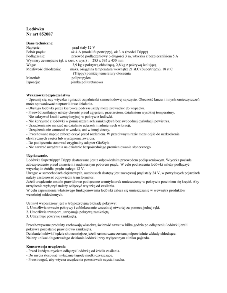 Lodówka Nr art 852087 Dane techniczne: Napięcie: prąd stały 12 V Pobór prądu: ok 4 A (model Supertrippy), ok 3 A (model Trippy) Podłączenie: przewód podłączeniowy o długości 3 m, wtyczka z bezpiecznikiem 5 A Wymiary zewnętrzne (gł. x szer. x wys.) : 285 x 395 x 450 mm Waga: 3,9 kg z pokrywą chłodzącą, 2,8 kg z pokrywą izolującą Możliwość chłodzenia: maks. osiągalna temperatura wewnątrz 21 st.C (Supertrippy), 18 st.C (Trippy) pomiżej temeratury otoczenia Materiał: polipropylen Izpoacja: pianka poliuretanowa Wskazówki bezpieczeństwa - Upewnij się, czy wtyczka i gniazdo zapalniczki samochodowej są czyste. Obecność kurzu i innych zanieczyszczeń może spowodować nieprawidłowe działanie. - Obsługa lodówki przez kierowcę podczas jazdy może prowadzić do wypadku. - Przewód zasilający należy chronić przed zgjęciem, przetarciem, działaniem wysokiej temperatury. - Nie zakrywać kratki wentylacyjnej w pokrywie lodówki. - Nie korzystać z lodówki w pomieszczeniach zamkniętych bez swobodnej cyrkulacji powietrza. - Urządzenia nie narażać na działanie uderzeń i nadmiernych wibracji. - Urządzenia nie zanurzać w wodzie, ani w innej cieczy. - Przechowane napoje zabezpieczyć przed rozlaniem. W przeciwnym razie może dojść do uszkodzenia elektrycznych części lub wystąpienia zwarcia. - Do podłączenia stosować oryginalny adapter GioStyle. - Nie narażać urządzenia na działanie bezpośredniego promieniowania słonecznego. Użytkowanie. Lodówka Supertrippy/ Trippy dostarczana jest z odpowiednim przewodem podłączeniowym. Wtyczka posiada zabezpieczenie przed zwarciem i nadmiernym poborem prądu. W celu podłączenia lodówki należy podłączyć wtyczkę do źródła prądu stałego 12 V. Uwaga: w samochodach ciężarowych, autobusach dostęny jest zazwyczaj prąd stały 24 V, w powyższych pojazdach należy zastosować odpowiedni transformator. Jeżeli urządzenie zostało prawidłowo podłączone wemtylatorek umieszczony w pokrywie powiniem się kręcić. Aby urządzenie wyłączyć należy odłączyć wtyczkę od zasilania. W celu zapewnienia właściwego funkcjonowania lodówki zaleca się umieszczanie w wewnątrz produktów wcześniej schłodzonych. Uchwyt wyposażony jest w trójpozycyjną blokadę pokrywy: 1. Umożliwia otwacie pokrywy i zablokowanie wcześniej otwartej za pomocą jednej ręki. 2. Umożliwia transport , utrzymuje pokrywę zamkniętą. 3. Utrzymuje pokrywę zamkniętą. Przechowywane produkty zachowają właściwą świeżość nawet w kilka godzin po odłączeniu lodówki jeżeli pokrywa pozostanie prawidłowo zamknięta. Działanie lodówki będzie skuteczniejsze jeżeli zastosowane zostaną odpowiednie wkłady chłodzące. Należy unikać długotrwałego działania lodówki przy wyłączonym silniku pojazdu. Konserwacja urządzenia - Przed każdym myciem odłączyć lodówkę od źródła zasilania. - Do mycia stosować wyłącznie łagode środki czyszczące. - Przestrzegać, aby wtycza urządzenia pozostawała czysta i sucha. Nieprawidłiowe funkcjonowanie Lodówka nie działa prawidłowo jeżeli wentylatorek nie obraca się. W powyższej sytuacji należy urządzenie odłączyć od zasilania i sprawdzić: - czy wtyczka została prawidłowo umieszczona w gnieździe zapalniczki samochodowej, - czy gniazdo zapalniczki samochodowej jest dobre, - czy gniazdo zapalniczki i wtyczka są czyste - czy wtyczka lub przewód podłączeniowy nie zostały uszkodzone. Lodówka nie chłodzi odpowiednio lub nie chłodzi całkowicie: - upewnić się czy kratka wentylacyjna nie została zasłonięta. - sprawdzić, czy wentylatorek obraca się prawidłowo, -sprawdzić, czy lodówka nie została pozostawiona w ciepłym pomieszczeniu lub w miejscy nasłonecznionym, - sprawdzić, czy w lodówce nie zostały umieszczone zbyt gorące potrawy. Akcesoria (dostępne oddzielnie) Adapter Power 220 V AC- 12 V DC Możliwość zasilania urządzeń z podłączeniem 12 V z gniazda napięcia zmiennego 220 V. Dane techniczne: Napięcie wejściowe: 220 V, 50/60 Hz Napięcie wyjciowe: 13 V DC Moc wyjściowa: 5A Waga: 0,5 kg.