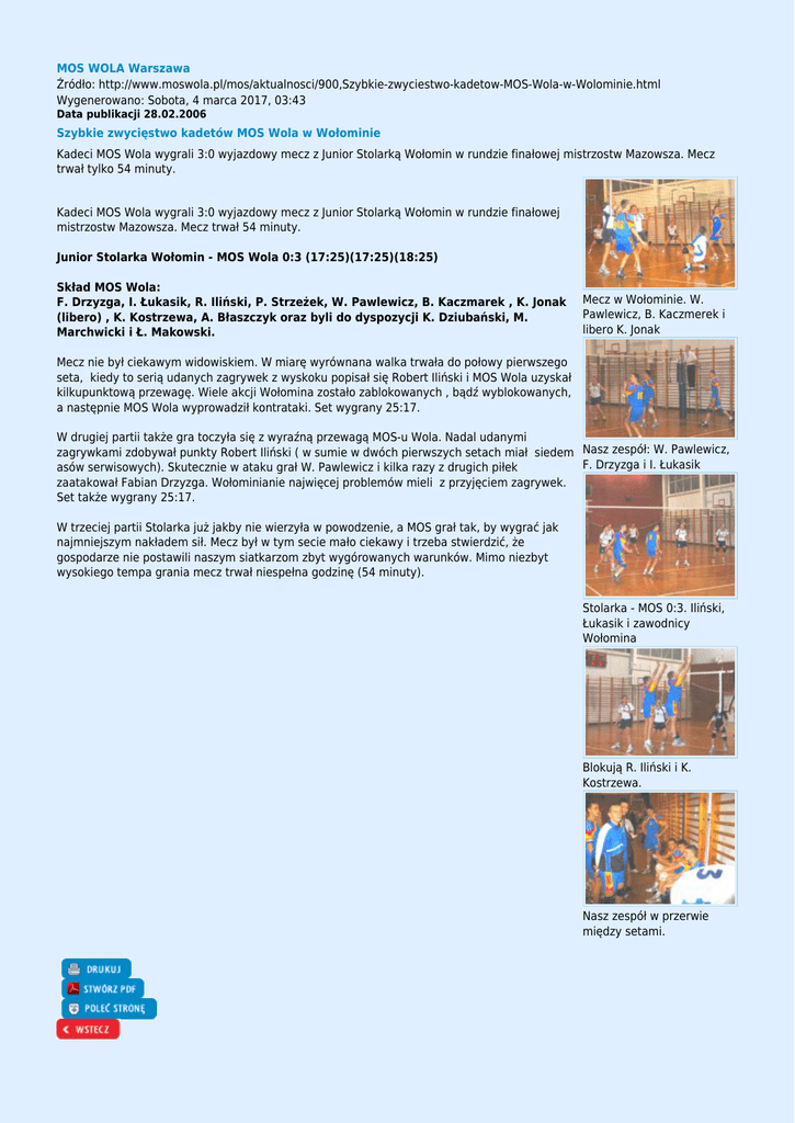 MOS WOLA Warszawa Źródło: http://www.moswola.pl/mos/aktualnosci/900,Szybkie-zwyciestwo-kadetow-MOS-Wola-w-Wolominie.html Wygenerowano: Sobota, 4 marca 2017, 03:43 Data publikacji 28.02.2006 Szybkie zwycięstwo kadetów MOS Wola w Wołominie Kadeci MOS Wola wygrali 3:0 wyjazdowy mecz z Junior Stolarką Wołomin w rundzie finałowej mistrzostw Mazowsza. Mecz trwał tylko 54 minuty. Kadeci MOS Wola wygrali 3:0 wyjazdowy mecz z Junior Stolarką Wołomin w rundzie finałowej mistrzostw Mazowsza. Mecz trwał 54 minuty. Junior Stolarka Wołomin - MOS Wola 0:3 (17:25)(17:25)(18:25) Skład MOS Wola: F. Drzyzga, I. Łukasik, R. Iliński, P. Strzeżek, W. Pawlewicz, B. Kaczmarek , K. Jonak (libero) , K. Kostrzewa, A. Błaszczyk oraz byli do dyspozycji K. Dziubański, M. Marchwicki i Ł. Makowski. Mecz w Wołominie. W. Pawlewicz, B. Kaczmerek i libero K. Jonak Mecz nie był ciekawym widowiskiem. W miarę wyrównana walka trwała do połowy pierwszego seta, kiedy to serią udanych zagrywek z wyskoku popisał się Robert Iliński i MOS Wola uzyskał kilkupunktową przewagę. Wiele akcji Wołomina zostało zablokowanych , bądź wyblokowanych, a następnie MOS Wola wyprowadził kontrataki. Set wygrany 25:17. W drugiej partii także gra toczyła się z wyraźną przewagą MOS-u Wola. Nadal udanymi zagrywkami zdobywał punkty Robert Iliński ( w sumie w dwóch pierwszych setach miał siedem Nasz zespół: W. Pawlewicz, F. Drzyzga i I. Łukasik asów serwisowych). Skutecznie w ataku grał W. Pawlewicz i kilka razy z drugich piłek zaatakował Fabian Drzyzga. Wołominianie najwięcej problemów mieli z przyjęciem zagrywek. Set także wygrany 25:17. W trzeciej partii Stolarka już jakby nie wierzyła w powodzenie, a MOS grał tak, by wygrać jak najmniejszym nakładem sił. Mecz był w tym secie mało ciekawy i trzeba stwierdzić, że gospodarze nie postawili naszym siatkarzom zbyt wygórowanych warunków. Mimo niezbyt wysokiego tempa grania mecz trwał niespełna godzinę (54 minuty). Stolarka - MOS 0:3. Iliński, Łukasik i zawodnicy Wołomina Blokują R. Iliński i K. Kostrzewa. Nasz zespół w przerwie między setami. Komentarz (0) dodaj komentarz Brak komentarzy dodaj komentarz