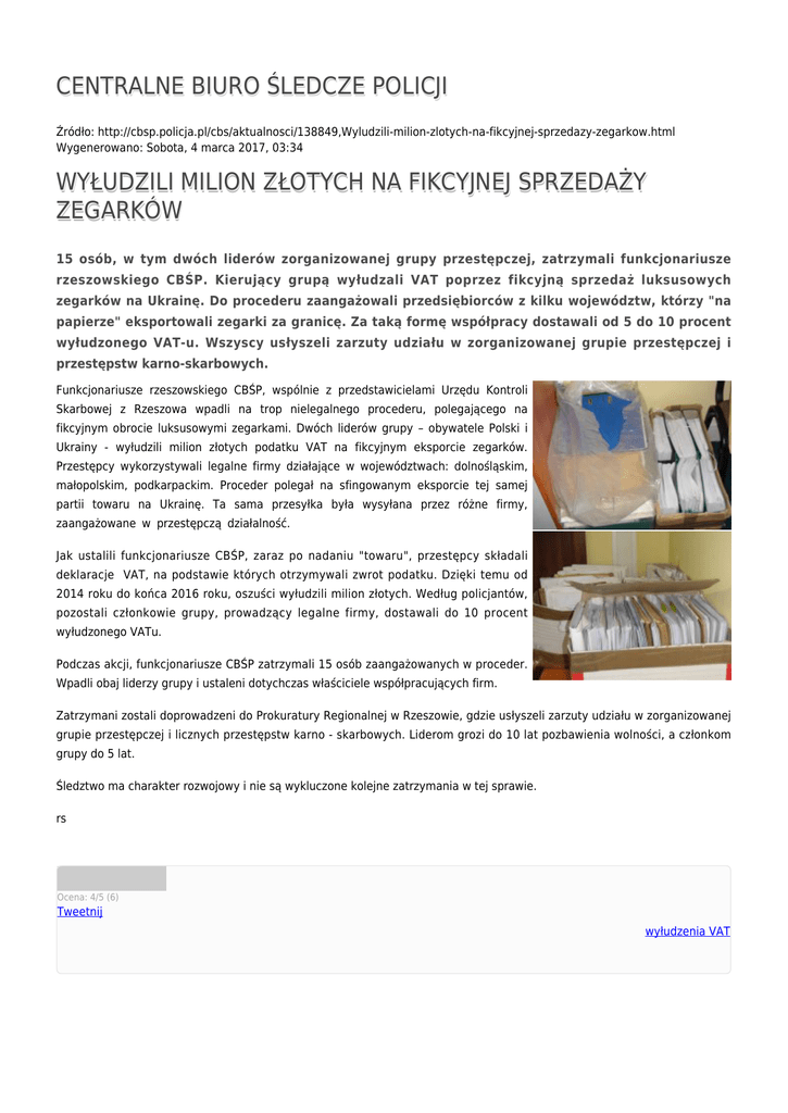 CENTRALNE BIURO ŚLEDCZE POLICJI Źródło: http://cbsp.policja.pl/cbs/aktualnosci/138849,Wyludzili-milion-zlotych-na-fikcyjnej-sprzedazy-zegarkow.html Wygenerowano: Sobota, 4 marca 2017, 03:34 WYŁUDZILI MILION ZŁOTYCH NA FIKCYJNEJ SPRZEDAŻY ZEGARKÓW 15 osób, w tym dwóch liderów zorganizowanej grupy przestępczej, zatrzymali funkcjonariusze rzeszowskiego CBŚP. Kierujący grupą wyłudzali VAT poprzez fikcyjną sprzedaż luksusowych zegarków na Ukrainę. Do procederu zaangażowali przedsiębiorców z kilku województw, którzy "na papierze" eksportowali zegarki za granicę. Za taką formę współpracy dostawali od 5 do 10 procent wyłudzonego VAT-u. Wszyscy usłyszeli zarzuty udziału w zorganizowanej grupie przestępczej i przestępstw karno-skarbowych. Funkcjonariusze rzeszowskiego CBŚP, wspólnie z przedstawicielami Urzędu Kontroli Skarbowej z Rzeszowa wpadli na trop nielegalnego procederu, polegającego na fikcyjnym obrocie luksusowymi zegarkami. Dwóch liderów grupy – obywatele Polski i Ukrainy - wyłudzili milion złotych podatku VAT na fikcyjnym eksporcie zegarków. Przestępcy wykorzystywali legalne firmy działające w województwach: dolnośląskim, małopolskim, podkarpackim. Proceder polegał na sfingowanym eksporcie tej samej partii towaru na Ukrainę. Ta sama przesyłka była wysyłana przez różne firmy, zaangażowane w przestępczą działalność. Jak ustalili funkcjonariusze CBŚP, zaraz po nadaniu "towaru", przestępcy składali deklaracje VAT, na podstawie których otrzymywali zwrot podatku. Dzięki temu od 2014 roku do końca 2016 roku, oszuści wyłudzili milion złotych. Według policjantów, pozostali członkowie grupy, prowadzący legalne firmy, dostawali do 10 procent wyłudzonego VATu. Podczas akcji, funkcjonariusze CBŚP zatrzymali 15 osób zaangażowanych w proceder. Wpadli obaj liderzy grupy i ustaleni dotychczas właściciele współpracujących firm. Zatrzymani zostali doprowadzeni do Prokuratury Regionalnej w Rzeszowie, gdzie usłyszeli zarzuty udziału w zorganizowanej grupie przestępczej i licznych przestępstw karno - skarbowych. Liderom grozi do 10 lat pozbawienia wolności, a członkom grupy do 5 lat. Śledztwo ma charakter rozwojowy i nie są wykluczone kolejne zatrzymania w tej sprawie. rs Ocena: 4/5 (6) Tweetnij wyłudzenia VAT