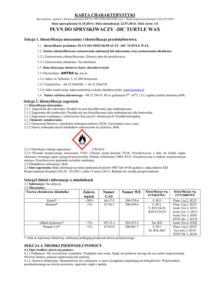 KARTA CHARAKTERYSTYKI Sporządzona zgodnie z Rozporządzeniem WE Nr 1907/2006 (REACH) oraz z Rozporządzeniem Komisji (UE) 453/2010 Data sporządzenia:31.10.2011r. Data aktualizacji: 22.07.2013r. Ilość stron: 1/5 PŁYN DO SPRYSKIWACZY -20C TURTLE WAX Sekcja 1. Identyfikacja mieszaniny i identyfikacja przedsiębiorstwa. 1.1 Identyfikator produktu: PŁYN DO SPRYSKIWACZY -20C TURTLE WAX 1.2 Istotne zidentyfikowane zastosowania substancji lub mieszaniny oraz zastosowania odradzane: 1.2.1 Zastosowania zidentyfikowane: Zimowy płyn do spryskiwaczy 1.2.2 Zastosowania odradzane: Nie określono 1.3 Dane dotyczące dostawcy karty charakterystyki: 1.3.1Dystrybutor: AMTRA Sp. z o. o. 1.3.2 Adres: ul. Schonów 3, 41-200 Sosnowiec 1.3.3 Telefon/Fax: +48 32 2944100 / + 48 32 2944139 1.3.4 Adres email osoby odpowiedzialnej za kartę charakterystyki: [email protected] 1.4 Numer telefonu alarmowego: +48 32 294 41 30 (w godzinach 800- 1600), 112 ( ogólny telefon alarmowy)998, Sekcja 2. Identyfikacja zagrożeń. 2.1 Klasyfikacja mieszaniny: 2.1.1. Zagrożenia dla człowieka: Produkt nie jest klasyfikowany jako niebezpieczny. 2.1.2 Zagrożenie dla środowiska: Produkt nie jest klasyfikowany jako niebezpieczny dla środowiska 2.1.3 Zagrożenia wynikające z właściwości fizycznych i chemicznych: Produkt łatwopalny 2.2. Elementy oznakowania: 2.2.1 Oznaczenie literowe i określenie niebezpieczeństwa: H226- Łatwopalna ciecz i pary 2.2.2 Nazwy niebezpiecznych składników umieszczone na etykiecie: Brak UWAGA 2.2.3 Określenie rodzaju zagrożenia: 2.2.4 Warunki bezpiecznego stosowania: P102- Chronić przed dziećmi, P210- Przechowywać z dala od źródeł ciepła/ iskrzenia/ otwartego ognia/ gorących powierzchni. Palenie wzbronione. P403+P233- Przechowywać w dobrze wentylowanym miejscu. Przechowywać pojemnik szczelnie zamknięty. 2.2.4Dodatkowe informacje: Brak 2.3 Inne zagrożenia: Brak informacji na temat spełniania kryteriów PBT lub vPvB zgodnie z załącznikiem XIII Rozporządzenia Komisji (UE) Nr 253/2011 z dnia 15 marca 2011r. Badania nie zostały przeprowadzone. Sekcja3.Skład i informacje o składnikach 3.1 Substancje: Nie dotyczy 3.2 Mieszaniny: Zakres stężeń Numer CAS Numer WE Klasyfikacja wg 67/548/EWG Klasyfikacja wg 1272/2008/WE Etanol* Metanol* ≤30% <3% 64-17-5 67-56-1 200-578-6 200-659-6 F, R11 F, R11, T, R23/24/25, R39/23/24/25 Glikol etylenowy* Propan-2-ol* <1% <1% 107-21-1 67-63-0 203-473-3 200-661-7 Xn, R22 F, R11 Xi, R36, R67 Flam. Liq.2, H225 Flam. Liq.2, H225 Acute Tox.3, H331 Acute Tox. 3, H311 Acute Tox.3, H301 STOT SE. 1, H370 Acute Tox.4, H302 Flam. Liq.2, H225 Eye Irrit.2, H319 STOT SE 3, H336 Nazwa chemiczna składnika *- brak nr rejestracji właściwej, substancje podlegają przepisom okresu przejściowego SEKCJA 4. ŚRODKI PIERWSZEJ POMOCY 4.1 Opis środków pierwszej pomocy: 4.1.1 Połknięcie: Nie wywoływać wymiotów. Wypłukać usta wodą. Nigdy nie podawać niczego do ust osobie nieprzytomnej. Wezwać lekarza, pokazać opakowanie lub etykietę. 4.1.2. Zatrucie inhalacyjne: Skonsultować się z lekarzem, w razie wystąpienia niepokojących dolegliwości. Wyprowadzić poszkodowanego na świeże powietrze, zapewnić ciepło i spokój. KARTA CHARAKTERYSTYKI Sporządzona zgodnie z Rozporządzeniem WE Nr 1907/2006 (REACH) oraz z Rozporządzeniem Komisji (UE) 453/2010 Data sporządzenia:31.10.2011r. Data aktualizacji: 22.07.2013r. Ilość stron: 2/5 PŁYN DO SPRYSKIWACZY -20C TURTLE WAX 4.1.3. Skażenie skóry: Zdjąć skażoną odzież. Narażone partie skóry zmyć dokładnie wodą z mydłem. Skonsultować się z lekarzem w przypadku wystąpienia niepokojących objawów. 4.1.4.Skażenie oczu: Chronić niepodrażnione oko, wyjąć szkła kontaktowe. Zanieczyszczone oczy przepłukać dokładnie wodą przez kilka minut. Unikać silnego strumienia wody – ryzyko uszkodzenia rogówki. Skonsultować się z lekarzem okulistą w przypadku wystąpienia niepokojących objawów. 4.2 Najważniejsze ostre i opóźnione objawy oraz skutki narażenia: 4.2.1 Skażenie oczu: Może wystąpić podrażnienie, zaczerwienienie oraz łzawienie 4.2.2 Połknięcie: Mogą pojawić się mdłości, wymioty, ból głowy, zaburzenia równowagi i koordynacji, senność 4.4.3 Skóra: Może wystąpić zaczerwienienie, wysuszenie i pękanie skóry 4.3 Wskazania dotyczące wszelkiej natychmiastowej pomocy lekarskiej i szczególnego postępowania z poszkodowanym: Podjąć leczenie objawowe. Decyzję o sposobie postępowanie ratunkowego podejmuje lekarz po dokładnej ocenie stanu poszkodowanego. SEKCJA 5. POSTĘPOWANIE W PRZYPADKU POŻARU 5.1 Środki gaśnicze: 5.1.1 Odpowiednie środki gaśnicze: Stosować proszek gaśniczy, CO2, woda-prądy rozproszone, pianę odporną na alkohol 5.1.2 Niewłaściwe środki gaśnicze: Woda- zwarty strumień wody 5.2 Szczególne zagrożenia związane z mieszaniną: Podczas spalania mogą tworzyć się toksyczne spaliny zawierające tlenki węgla. Unikać wdychania produktów spalania, mogą stwarzać zagrożenie dla zdrowia. 5.3 Informacje dla straży pożarnej: Łatwopalna ciecz i pary. Pary produktu mogą tworzyć z powietrzem mieszaniny wybuchowe. Pary produktu są cięższe od powietrza, gromadzą się przy powierzchni ziemi, w dolnych partiach pomieszczeń i w zagłębieniach terenu. Środki ochrony ogólnej typowe w przypadku pożaru. Nie należy przebywać w zagrożonej ogniem strefie bez odpowiedniego ubrania odpornego na chemikalia i aparatu do oddychania z niezależnym obiegiem powietrza. Zagrożone pożarem zbiorniki usunąć jeśli to możliwe i nie wiąże się z nadmiernym ryzykiem lub chłodzić rozpyloną wodą z odpowiedniej odległości. SEKCJA 6. POSTĘPOWANIE W PRZYPADKU NIEZAMIERZONEGO UWOLIENIA DO ŚRODOWISKA 6.1 Indywidualne środki ostrożności, wyposażenie ochronne i procedury w sytuacjach awaryjnych: 6.1.1 Dla osób niezależących do personelu likwidującego skutki awarii: Ograniczyć dostęp osób postronnych do obszaru awarii do czasu u