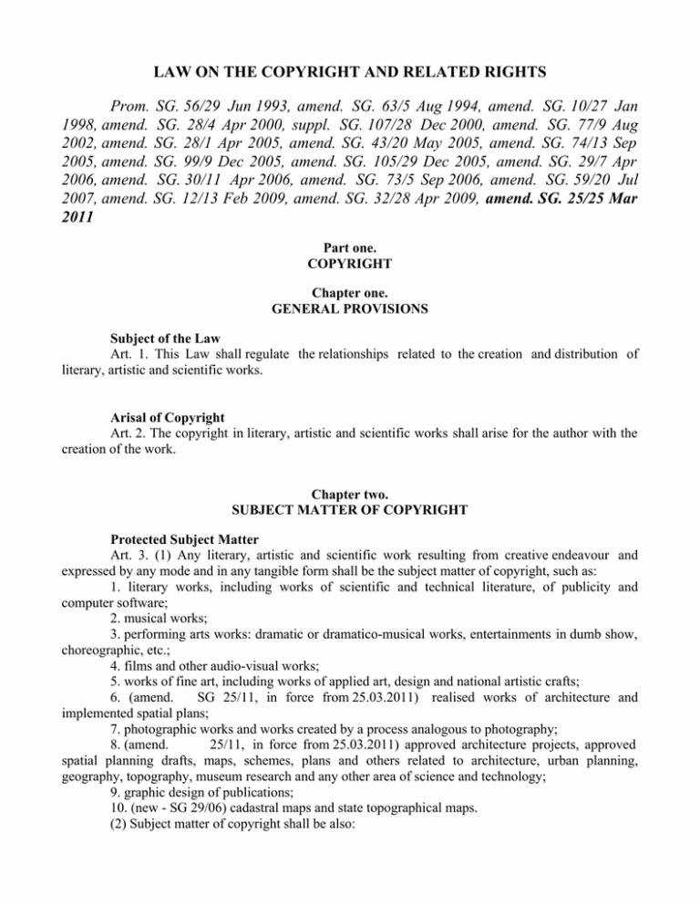 LAW ON THE COPYRIGHT AND RELATED RIGHTS Prom. SG. 56/29 Jun 1993, amend. SG. 63/5 Aug 1994, amend. SG. 10/27 Jan 1998, amend. SG. 28/4 Apr 2000, suppl. SG. 107/28 Dec 2000, amend. SG. 77/9 Aug 2002, amend. SG. 28/1 Apr 2005, amend. SG. 43/20 May 2005, amend. SG. 74/13 Sep 2005, amend. SG. 99/9 Dec 2005, amend. SG. 105/29 Dec 2005, amend. SG. 29/7 Apr 2006, amend. SG. 30/11 Apr 2006, amend. SG. 73/5 Sep 2006, amend. SG. 59/20 Jul 2007, amend. SG. 12/13 Feb 2009, amend. SG. 32/28 Apr 2009, amend. SG. 25/25 Mar 2011 Part one. COPYRIGHT Chapter one. GENERAL PROVISIONS Subject of the Law Art. 1. This Law shall regulate the relationships related to the creation and distribution of literary, artistic and scientific works. Arisal of Copyright Art. 2. The copyright in literary, artistic and scientific works shall arise for the author with the creation of the work. Chapter two. SUBJECT MATTER OF COPYRIGHT Protected Subject Matter Art. 3. (1) Any literary, artistic and scientific work resulting from creative endeavour and expressed by any mode and in any tangible form shall be the subject matter of copyright, such as: 1. literary works, including works of scientific and technical literature, of publicity and computer software; 2. musical works; 3. performing arts works: dramatic or dramatico-musical works, entertainments in dumb show, choreographic, etc.; 4. films and other audio-visual works; 5. works of fine art, including works of applied art, design and national artistic crafts; 6. (amend. – SG 25/11, in force from 25.03.2011) realised works of architecture and implemented spatial plans; 7. photographic works and works created by a process analogous to photography; 8. (amend. –SG 25/11, in force from 25.03.2011) approved architecture projects, approved spatial planning drafts, maps, schemes, plans and others related to architecture, urban planning, geography, topography, museum research and any other area of science and technology; 9. graphic design of publications; 10. (new - SG 29/06) cadastral maps and state topographical maps. (2) Subject matter of copyright shall be also: 1. translations and adaptations of existing works and works of folklore; 2. arrangements of musical works and works of folklore; 3. periodicals, encyclopaedia, collections, anthologies, bibliographies, databases and other similar subject matter including two or more works or products. (3) Subject matter of copyright may also be parts of the works referred to in para 1 and 2, preliminary sketches, plans, etc. Exceptions Art. 4. Shall not be considered subject matter of copyright: 1. normative and individual acts of state government bodies and official translations thereof; 2. ideas and concepts; 3. works of folklore; 4. news, facts, information and data. Chapter three. OWNERS OF COPYRIGHT Authors and Other Owners of Copyright Art. 5. Author shall be the natural person whose creative endeavours have resulted in the creation of a literary, artistic or scientific work. Other natural or legal persons may be owners of copyright only in the cases provided by this Law. Presumption of Authorship Art. 6. (1) (prev. text of Art. 06, amend. and suppl. - SG 99/05, in force from 10.01.2006) Until proved otherwise author of the work shall be considered to be the person whose name or other identifying mark is indicated on the original, copies or specimen of the work and/or on their packing in the usual manner. (2) (new - SG 99/05, in force from 10.01.2006) Para 1 shall be also applied respectively to the owners of copyright in the cases referred to in Art. 10, first sentence, Art. 11, para 1, first sentence and Art. 14. Authorship of Works Made Available to the Public under Pseudonym or Anonymously Art. 7. (1) The work may be made available to the public under pseudonym or anonymously. (2) Until revealing the identity of the author his copyright shall be exercised by the natural or legal person that has made the work available to the public for the first time with the author's consent. (3) The provision of paragraph 2 shall not apply if the pseudonym leaves no doubt as to the identity of the author. Joint Authorship Art. 8. (1) Copyright in a work created by two or more persons shall belong to them jointly irrespective of whether the work constitutes one indivisible entity or consists of separate parts each having individual significance. (2) The consent of all authors shall be required for every single use or adaptation of the work. In case of lack of agreement between the joint authors the issue shall be resolved by the court. (3) If authorisation has been granted to use a work in a given manner, or a court ruling has been rendered to that effect, none of the joint authors shall be entitled without reasonable grounds to object to its further use in the said manner. (4) The compensation due to the authors for the use of their work, shall be distributed between them in shares by mutual agreement. At lack of agreement, it shall be considered that each of the joint authors has equal share. In case of disputes, the individual shares shall be determined by the court according to the contribution of each of the authors. (5) Provided that a work created by joint authors consists of components each having individual significance, each of the joint authors may authorize the individual use of his own component unless the joint authors have agreed otherwise and if this does not hinder the use of the work as a whole. Copyright in Translations and Adaptations Art. 9. Copyright in translation or adaptation shall belong to the person who has made it without prejudice to the rights of the author of the original work. This shall not deprive other persons of the right to make their own translation or adaptation of the same work. Copyright in Periodicals and Encyclopaedias Art. 10. (suppl. - SG 28/00, in force from 05.05.2000) Copyright in periodicals and encyclopaedias shall belong to the natural or legal person responsible for the creation and publi