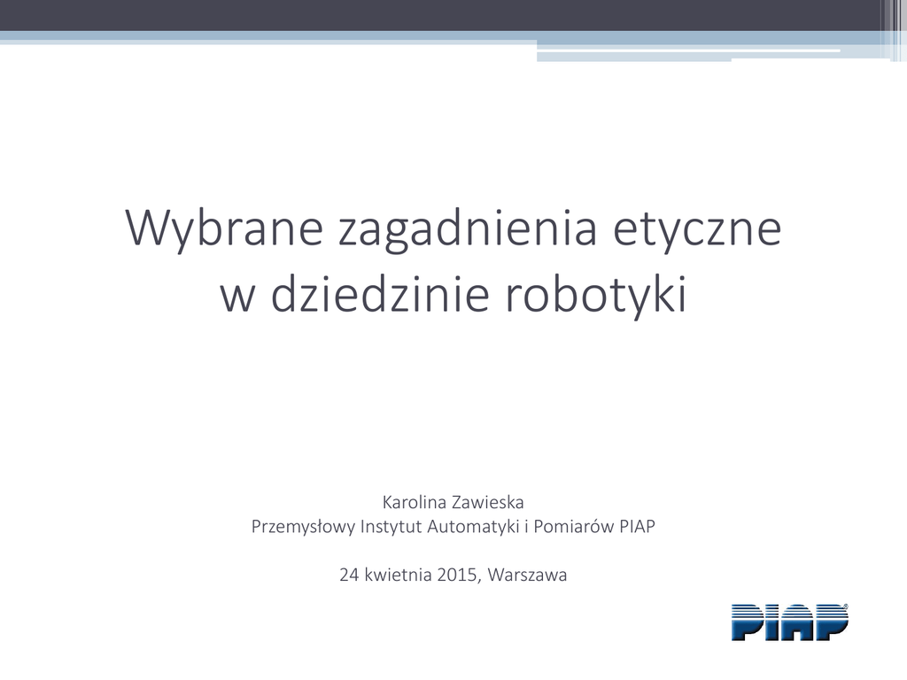 Wybrane zagadnienia etyczne w dziedzinie robotyki Karolina Zawieska Przemysłowy Instytut Automatyki i Pomiarów PIAP 24 kwietnia 2015, Warszawa Etyka: zbiór norm i zasad postępowania • Nauka o moralności ▫ nauka o wartościach moralnych: dobro i zło ▫ zbiór norm i zasad postępowania • Prawo naturalne vs. prawo stanowione • Skodyfikowane zbiory zasad postępowania ▫ ▫ ▫ ▫ ▫ ▫ Kodeks Hammurabiego 10 Przykazań Przysięga Hipokratesa Powszechna Deklaracja Praw Człowieka Ustawa o ochronie zwierząt … „ADAM I EWA”, TYCJAN 1550 Zasady etyczne robotów? • Prawa Asimova (1942): ▫ Robot nie może skrzywdzić człowieka, ani przez zaniechanie działania dopuścić, aby człowiek doznał krzywdy; • Roboty: ▫ autonomiczne ▫ inteligentne ▫ imitujące człowieka ▫ Robot musi być posłuszny rozkazom człowieka, chyba że stoją one w sprzeczności z Pierwszym Prawem; ▫ Robot musi chronić sam siebie, jeśli tylko nie stoi to w sprzeczności z Pierwszym lub Drugim Prawem. • Koreańska Karta Etyki Robotów? Engineered Arts Ltd - SociBot Zasady etyczne ludzi • Kodeks EURON (2004) – zalecenia: 1. Safety: robot musi być sterowany przez człowieka 2. Security: zapobiegaj niewłaściwemu lub nielegalnemu użyciu robota 3. Privacy: chroń dane przechowywane przez robota 4. Traceability: monitoruj działania robota 5. Identifiability: nadaj unikalny identyfikator każdemu robotowi • Odpowiedzialność za działania robotów (autonomicznych): ▫ ▫ ▫ ▫ ▫ Konstruktor Użytkownik Producent Właściciel Robot? MAARS Campa, R., „Kodeksy etyczne robotów: zagadnienie kontroli sprawowanej przez człowieka”, PAR 3/2011, s. 66-70 Systemy etyczne robotów podejście TOP-DOWN podejście BOTTOM-UP • Robot-narzędzie • Robot-agent • Robot działa według z góry określonych zasad • Robot uczy się zasad postępowania • Zasady uniwersalne • Zasady partykularne • Zdefiniowany ciąg poleceń • Sieci neuronowe • Ryzyko: arbitralność • Ryzyko: brak zasad Kluczowe zagadnienie: stopień autonomii Dylemat etyczny: autonomia robotów Roboty do zastosowań wojskowych Roboty do zastosowań cywilnych • Odpowiedzialność za decyzje dot. życia człowieka • Celowe działania oraz błędy • Odpowiedzialność za decyzje dot. zdrowia i życia człowieka ROBEAR UK TARANIS GOOGLE CAR Ryzyko dot. autonomii robotów • Nieprzewidywalność • Brak odpowiedzialnego (ang. accountability gap) • Zrównanie odpowiedzialności maszyn i ludzi • Uzależnienie od technologii Dylemat etyczny: antropomorfizacja robotów • Czy można porównać człowieka do maszyny? • Czy budowanie robotów imitujących człowieka to oszustwo? • Które zadania i role człowieka powinny zostać powierzone robotom? • Na ile roboty powinny wspomagać człowieka, a na ile go zastępować? INSPECTOR konsola sterująca PAL ROBOTICS - REEM-C Ryzyko dot. nadmiernej antropomorfizacji • Mylna interpretacja - te same określenia mają inne znaczenia w odniesieniu do ludzi i robotów (np. inteligencja, emocje) • Nadmierne oczekiwania użytkowników • Uprzedmiotowienie człowieka GEMINOID-F Podsumowanie • Robot jest narzędziem człowieka – „antropomorficzny” nie oznacza „ludzki” • Wartości i zasady etyczne wpisane są w każdy etap procesu tworzenia i użytkowania robotów • Zasady etyczne obowiązują ludzi, nie roboty