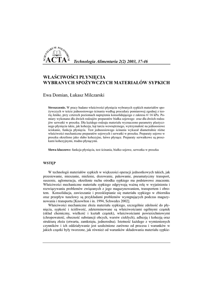TI SCIEN RUM NO UM POLO AR ACTA Technologia Alimentaria 2(2) 2003, 37-46 WŁAŚCIWOŚCI PŁYNIĘCIA WYBRANYCH SPOŻYWCZYCH MATERIAŁÓW SYPKICH Ewa Domian, Łukasz Milczarski Streszczenie. W pracy badano właściwości płynięcia wybranych sypkich materiałów spożywczych w teście jednoosiowego ścinania według procedury pomiarowej zgodnej z teorią Jenike, przy czterech poziomach naprężenia konsolidującego z zakresu 6÷16 kPa. Pomiary wykonano dla dwóch rodzajów preparatów białka sojowego oraz dla dwóch rodzajów serwatki w proszku. Dla każdego rodzaju materiału wyznaczono parametry plastycznego płynięcia takie, jak kohezja, kąt tarcia wewnętrznego, wytrzymałość na jednoosiowe ściskanie, funkcja płynięcia. Test jednoosiowego ścinania wykazał diametralnie różne właściwości mechaniczne preparatów sojowych i serwatki w proszku. Preparaty sojowe w proszku określono jako słabo kohezyjne, łatwo płynące. Preparaty serwatkowe są proszkami kohezyjnymi, trudno płynącymi. Słowa kluczowe: funkcja płynięcia, test ścinania, białko sojowe, serwatka w proszku WSTĘP W technologii materiałów sypkich w większości operacji jednostkowych takich, jak przesiewanie, mieszanie, mielenie, dozowanie, pakowanie, pneumatyczny transport, suszenie, aglomeracja, określenie ruchu ośrodka sypkiego ma podstawowe znaczenie. Właściwości mechaniczne materiału sypkiego odgrywają ważną rolę w wyjaśnieniu i rozwiązywaniu problemów związanych z jego magazynowaniem, transportem i obrotem. Konsolidacja, zawieszanie i przesklepianie się materiału sypkiego w zbiorniku oraz przepływ tunelowy są przykładami problemów występujących podczas magazynowania i transportu [Knowlton i in. 1994, Schwedes 2002]. Właściwości mechaniczne złoża materiału sypkiego, szczególnie zdolność do płynięcia, sypkość i ściśliwość, zdeterminowane są właściwościami ogólnymi cząstek (skład chemiczny, wielkość i kształt cząstek), właściwościami powierzchniowymi (chropowatość, obecność substancji obcych, warstw ciekłych), adhezją i kohezją oraz strukturą złoża (otwarta, zamknięta, jednorodna). Istotność każdego z wymienionych czynników i ich oddziaływanie jest uzależnione zarówno od procesu i warunków w jakich cząstki były tworzone, jak również od warunków składowania materiału sypkie- 38 E. Domian, Ł. Milczarski go, szczególnie z uwzględnieniem ciśnienia statycznego złoża i czasu oraz wilgotności i temperatury [Peleg 1985, Schubert 1987 a]. Najistotniejszą z właściwości mechanicznych materiałów sypkich jest ich zdolność do płynięcia. Ogólnie płynięcie materiałów sypkich można określić jako ruch cząstek czy ziaren względem sąsiednich lub wzdłuż stykającej się z nimi powierzchni [Peleg 1985]. Mechanizm płynięcia materiału sypkiego jest całkiem odmienny od płynięcia cieczy. Charakterystyczne dla materiałów sypkich jest to, że mogą w stanie spoczynku przenosić naprężenia ścinające. Statyczny kąt tarcia wewnętrznego materiałów sypkich jest większy od zera, co powoduje formowanie usypisk, czego nie obserwuje się dla cieczy. Naprężenia ścinające w „płynącym” materiale sypkim mogą być traktowane jako niezależne od szybkości ścinania, zależą natomiast od ciśnienia występującego wewnątrz materiału. W cieczach jest odwrotnie, naprężenia ścinające są zależne od szybkości ścinania, nie zależą natomiast od wartości ciśnienia w cieczy. Ponadto, wiele materiałów sypkich, zwłaszcza proszków i pyłów, zasadniczo zmienia swoją podatność na płynięcie w wyniku wywarcia na nie nacisku. Następuje wtedy tzw. skonsolidowanie materiału, w wyniku którego materiał zyskuje znaczną wytrzymałość na deformację. Przy tej samej konsolidacji różne materiały wykazują inną wytrzymałość. Wpływa to na charakter ich przepływu – bardziej wytrzymały materiał trudniej wypływa, niż materiał o mniejszej wytrzymałości. Konsolidacja materiałów podczas składowania może doprowadzić do zakłóceń wypływu ze zbiornika, a w skrajnym wypadku do całkowitego zatrzymania przepływu. Występowaniu wyżej wymienionych zjawisk zapobiega takie zaprojektowanie zbiornika, aby zagwarantowany był przepływ materiału zapewniający łatwe i równomierne opróżnianie. Geometria zbiornika (wielkość, nachylenie ścian, średnica otworu wylotowego) zapewniająca przepływ hydrauliczny musi uwzględniać właściwości mechaniczne materiału sypkiego [Kobielak 1990, Schwedes 2002]. Metodą najbardziej przydatną do określenia właściwości płynięcia materiałów sypkich są badania bezpośredniego ścinania. Wielkości uzyskane z testów ścinania, według teorii płynięcia proszków Jenike [1964], pozwalają określić parametry plastycznego płynięcia materiałów sypkich z wystarczającą do praktycznego zastosowania dokładnością i przewidzieć charakter płynięcia badanego materiału sypkiego. Parametry plastycznego płynięcia określają warunki w jakich materiał sypki przestaje zachowywać się jak ciało stałe i staje się podobny do cieczy [Schwedes 1996, Teunou i in. 1999]. Parametry plastycznego płynięcia materiałów skonsolidowanych takie, jak kohezja C, kinetyczny kąt tarcia wewnętrznego ϕ, efektywny kąt tarcia wewnętrznego ϕE, wytrzymałość na jednoosiowe ściskanie σC, wyznacza się na podstawie krzywej uplastycznienia YL (YL – Yield Locus). Krzywa ta, przedstawiająca zależność τ = f(σ), jest miejscem geometrycznym wartości naprężeń normalnych σ i ścinających τ powodujących płynięcie materiału uprzednio skonsolidowanego do określonej gęstości nasypowej działaniem konsolidującego naprężenia normalnego σE (rys. 1). Dla materiałów idealnie sypkich (bezkohezyjnych C = 0) położenie linii uplastycznienia YL, a więc wartość naprężeń ścinających τ przy których następuje płynięcie materiału, za