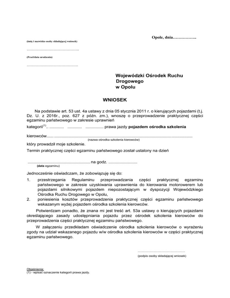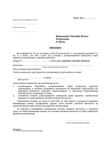 Opole, dnia…………….. (imię i nazwisko osoby składającej wniosek) ………………………………….. (Pcsel/data urodzenia) …………………………………. Wojewódzki Ośrodek Ruchu Drogowego w Opolu WNIOSEK Na podstawie art. 53 ust. 4a ustawy z dnia 05 stycznia 2011 r. o kierujących pojazdami (t.j. Dz. U. z 2016r., poz. 627 z późn. zm.), wnoszę o przeprowadzenie praktycznej części egzaminu państwowego w zakresie uprawnień kategorii(1).. ............ ............ ............... prawa jazdy pojazdem ośrodka szkolenia kierowców...... ................................................................................................. .................. (nazwa ośrodka szkolenia kierowców) który prowadził moje szkolenie. Termin praktycznej części egzaminu państwowego został ustalony na dzień .................................................... na godz. ........................ (data egzaminu) Jednocześnie oświadczam, że zobowiązuję się do: 1. 2. przestrzegania Regulaminu przeprowadzania części praktycznej egzaminu państwowego w zakresie uzyskiwania uprawnienia do kierowania motorowerem lub pojazdami silnikowymi pojazdem niepozostającym w dyspozycji Wojewódzkiego Ośrodka Ruchu Drogowego w Opolu, poniesienia kosztów przeprowadzenia praktycznej części egzaminu państwowego wskazanym wyżej pojazdem ośrodka szkolenia kierowców. Potwierdzam ponadto, że znana mi jest treść art. 53a ustawy o kierujących pojazdami określającego zasady udostępniania pojazdu przez ośrodek szkolenia kierowców do przeprowadzenia części praktycznej egzaminu państwowego. W załączeniu przedkładam oświadczenie ośrodka szkolenia kierowców o wyrażeniu zgody na udział wskazanego pojazdu w/w ośrodka szkolenia kierowców w części praktycznej egzaminu państwowego. ………………………………………. (podpis osoby składającej wniosek) Objaśnienia: (1) - wpisać oznaczenie kategorii prawa jazdy.