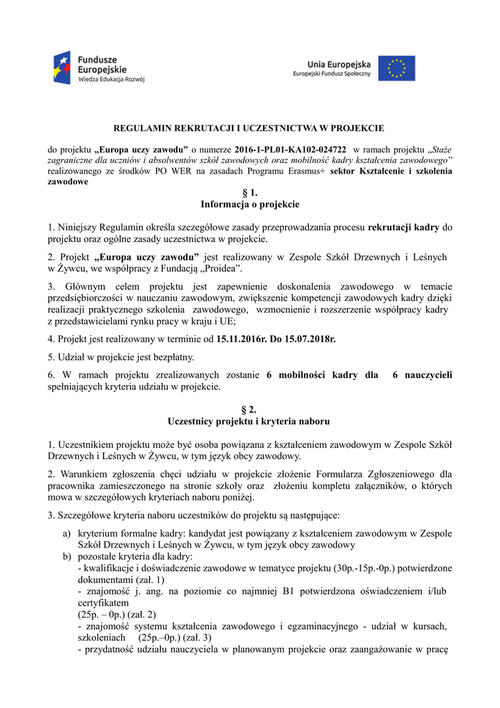 REGULAMIN REKRUTACJI I UCZESTNICTWA W PROJEKCIE do projektu „Europa uczy zawodu” o numerze 2016-1-PL01-KA102-024722 w ramach projektu „Staże zagraniczne dla uczniów i absolwentów szkół zawodowych oraz mobilność kadry kształcenia zawodowego” realizowanego ze środków PO WER na zasadach Programu Erasmus+ sektor Kształcenie i szkolenia zawodowe § 1. Informacja o projekcie 1. Niniejszy Regulamin określa szczegółowe zasady przeprowadzania procesu rekrutacji kadry do projektu oraz ogólne zasady uczestnictwa w projekcie. 2. Projekt „Europa uczy zawodu” jest realizowany w Zespole Szkół Drzewnych i Leśnych w Żywcu, we współpracy z Fundacją „Proidea”. 3. Głównym celem projektu jest zapewnienie doskonalenia zawodowego w temacie przedsiębiorczości w nauczaniu zawodowym, zwiększenie kompetencji zawodowych kadry dzięki realizacji praktycznego szkolenia zawodowego, wzmocnienie i rozszerzenie współpracy kadry z przedstawicielami rynku pracy w kraju i UE; 4. Projekt jest realizowany w terminie od 15.11.2016r. Do 15.07.2018r. 5. Udział w projekcie jest bezpłatny. 6. W ramach projektu zrealizowanych zostanie 6 mobilności kadry dla spełniających kryteria udziału w projekcie. 6 nauczycieli § 2. Uczestnicy projektu i kryteria naboru 1. Uczestnikiem projektu może być osoba powiązana z kształceniem zawodowym w Zespole Szkół Drzewnych i Leśnych w Żywcu, w tym język obcy zawodowy. 2. Warunkiem zgłoszenia chęci udziału w projekcie złożenie Formularza Zgłoszeniowego dla pracownika zamieszczonego na stronie szkoły oraz złożeniu kompletu załączników, o których mowa w szczegółowych kryteriach naboru poniżej. 3. Szczegółowe kryteria naboru uczestników do projektu są następujące: a) kryterium formalne kadry: kandydat jest powiązany z kształceniem zawodowym w Zespole Szkół Drzewnych i Leśnych w Żywcu, w tym język obcy zawodowy b) pozostałe kryteria dla kadry: - kwalifikacje i doświadczenie zawodowe w tematyce projektu (30p.-15p.-0p.) potwierdzone dokumentami (zał. 1) - znajomość j. ang. na poziomie co najmniej B1 potwierdzona oświadczeniem i/lub certyfikatem (25p. – 0p.) (zał. 2) - znajomość systemu kształcenia zawodowego i egzaminacyjnego - udział w kursach, szkoleniach (25p.–0p.) (zał. 3) - przydatność udziału nauczyciela w planowanym projekcie oraz zaangażowanie w pracę placówki ocenione przez Dyrekcję Szkoły na podstawie akt pracowniczych i/lub rozmów z kandydatami (20p.–10p.–0p.). 4. Każde kryterium jest punktowane. Łącznie do zdobycia jest 100 punktów. Suma zdobytych punktów decyduje o miejscu kandydata na liście. W przypadku równej ilości punktów decyduje kolejność zgłoszeń. § 3. Przebieg rekrutacji 1. Zaplanowano przeprowadzenie rekrutacji do udziału w projekcie, w trakcie której wyłoniona zostanie 1 grupa uczestników wraz z listą rezerwową. 2. Rekrutacja do projektu trwa od 7 listopada do 2 grudnia 2016r. Informacje o rekrutacji rozpowszechnione będą przez szkolnego koordynatora i innych nauczycieli zaangażowanych w realizację projektu. Ważne terminy: a) termin przekazania Formularza zgłoszeniowego do koordynatora projektu do 15 listopada 2016r. b) termin dostarczenia załączników do 24 listopada 2016r. c) ostateczne ogłoszenie wyników rekrutacji odbędzie się do 2 grudnia 2016r. 3. Rekrutację przeprowadza Komisja Rekrutacyjna w składzie: • • • Dyrektor Zespołu Szkół Drzewnych i Leśnych w Żywcu Nauczyciel zawodu Koordynator projektu 4. Komisja Rekrutacyjna, zgodnie z przyznanymi punktami w poszczególnych kategoriach, sporządza listę osób zakwalifikowanych do projektu oraz listę osób rezerwową. Lista osób (główna i rezerwowa) zamieszczona zostanie na stronie internetowej szkoły www.zsdil.pl, w gablotach szkolnych/na tablicy ogłoszeń. 5. Kandydatom do udziału w projekcie przysługuje prawo odwołania się od decyzji Komisji Rekrutacyjnej do Dyrektora Zespołu Szkół Drzewnych i Leśnych w Żywcu, w formie pisemnej, w terminie do 7 dni od dnia ogłoszenia wyników rekrutacji. Rozpatrzenie odwołania następuje w terminie do 7 dni od dnia złożenia odwołania i ma charakter ostateczny. 6. W przypadku zdarzenia losowego uniemożliwiającego udział w przygotowaniach i wyjeździe, prawo do tego wyjazdu uzyska osoba z listy rezerwowej z zachowaniem ustalonej na niej kolejności. 7. W zajęciach przygotowawczych do wyjazdu aktywnie uczestniczą również osoby z listy rezerwowej. § 4. Zakres wsparcia 1. W ramach projektu każdy uczestnik objęty zostanie następującymi formami wsparcia: a) przygotowanie w kraju: językowe, kulturowe i zw. z dziedziną mobilności i zapobieganie ryzyku b) tygodniowe szkolenia zawodowe w Portugalii, Esposende (przedsiębiorczość w nauczaniu zawodowym) 2. Przygotowanie w kraju: językowe,kulturowe i zw. z dziedziną mobilności i zapobieganie ryzyku : ➢ ➢ ➢ ➢ 20 godzin zajęć z języka angielskiego zawodowego, 10 godzin zajęć z języka portugalskiego, 5 godzin zajęć z przygotowania kulturowego, 5 godzin zajęć zw. z dziedziną mobilności i zapobieganie ryzyku. Zajęcia odbywać się będą przed wyjazdem, zgodnie z wspólnie ustalonym harmonogramem spotkań. 3. Planowane terminy wyjazdów: 04 – 10.02.2018 PORTUGALIA, ESPOSENDE PRZEDSIĘBIORCZOŚĆ W NAUCZANIU ZAWODOWYM 6 OS. 4. Praktyczne szkolenia zawodowe odbędą się w EUROMOB, PORTUGALIA, ESPOSENDE. Szczegółowy program praktyk zostanie przedstawiony uczestnikom przed wyjazdem każdej z grup. 5. W ramach projektu każdemu z uczestników zostaną zapewnione: • podróż do kraju odbywania praktyk i powrót do Polski • zakwaterowanie i wyżywienie podczas pobytu za granicą • ubezpieczenie: następstwa nieszczęśliwych wypadków (NNW) oraz koszty leczenia za granicą (KL) 6. Szkolenie ma charakter nieodpłatny, nie ponosi się kosztów związanych z ubezpieczeniem, przejazdem, zakwaterowaniem i wyżywieniem podczas pobytu za granic