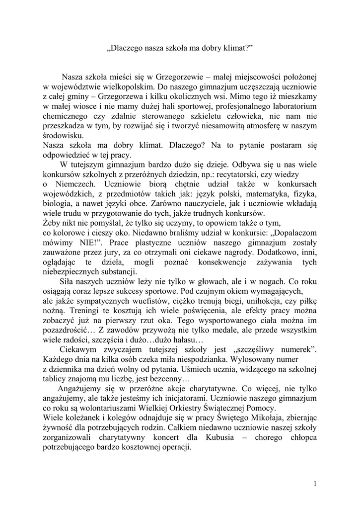 „Dlaczego nasza szkoła ma dobry klimat?” Nasza szkoła mieści się w Grzegorzewie – małej miejscowości położonej w województwie wielkopolskim. Do naszego gimnazjum uczęszczają uczniowie z całej gminy – Grzegorzewa i kilku okolicznych wsi. Mimo tego iż mieszkamy w małej wiosce i nie mamy dużej hali sportowej, profesjonalnego laboratorium chemicznego czy zdalnie sterowanego szkieletu człowieka, nic nam nie przeszkadza w tym, by rozwijać się i tworzyć niesamowitą atmosferę w naszym środowisku. Nasza szkoła ma dobry klimat. Dlaczego? Na to pytanie postaram się odpowiedzieć w tej pracy. W tutejszym gimnazjum bardzo dużo się dzieje. Odbywa się u nas wiele konkursów szkolnych z przeróżnych dziedzin, np.: recytatorski, czy wiedzy o Niemczech. Uczniowie biorą chętnie udział także w konkursach wojewódzkich, z przedmiotów takich jak: język polski, matematyka, fizyka, biologia, a nawet języki obce. Zarówno nauczyciele, jak i uczniowie wkładają wiele trudu w przygotowanie do tych, jakże trudnych konkursów. Żeby nikt nie pomyślał, że tylko się uczymy, to opowiem także o tym, co kolorowe i cieszy oko. Niedawno braliśmy udział w konkursie: „Dopalaczom mówimy NIE!”. Prace plastyczne uczniów naszego gimnazjum zostały zauważone przez jury, za co otrzymali oni ciekawe nagrody. Dodatkowo, inni, oglądając te dzieła, mogli poznać konsekwencje zażywania tych niebezpiecznych substancji. Siła naszych uczniów leży nie tylko w głowach, ale i w nogach. Co roku osiągają coraz lepsze sukcesy sportowe. Pod czujnym okiem wymagających, ale jakże sympatycznych wuefistów, ciężko trenują biegi, unihokeja, czy piłkę nożną. Treningi te kosztują ich wiele poświęcenia, ale efekty pracy można zobaczyć już na pierwszy rzut oka. Tego wysportowanego ciała można im pozazdrościć… Z zawodów przywożą nie tylko medale, ale przede wszystkim wiele radości, szczęścia i dużo…dużo hałasu… Ciekawym zwyczajem tutejszej szkoły jest „szczęśliwy numerek”. Każdego dnia na kilka osób czeka miła niespodzianka. Wylosowany numer z dziennika ma dzień wolny od pytania. Uśmiech ucznia, widzącego na szkolnej tablicy znajomą mu liczbę, jest bezcenny… Angażujemy się w przeróżne akcje charytatywne. Co więcej, nie tylko angażujemy, ale także jesteśmy ich inicjatorami. Uczniowie naszego gimnazjum co roku są wolontariuszami Wielkiej Orkiestry Świątecznej Pomocy. Wiele koleżanek i kolegów odnajduje się w pracy Świętego Mikołaja, zbierając żywność dla potrzebujących rodzin. Całkiem niedawno uczniowie naszej szkoły zorganizowali charytatywny koncert dla Kubusia – chorego chłopca potrzebującego bardzo kosztownej operacji. 1 To było dla nas szczególne wydarzenie. Pokazało nam, o ile piękniej jest dawać, aniżeli brać. Na dobry klimat naszej szkoły w dużej mierze mają wpływ organizowane wycieczki. Dzięki nim poznajemy nie tylko świat, ale i siebie nawzajem. To właśnie one tworzą najpiękniejsze wspomnienia… Nasi uczniowie kochają tańczyć, dlatego tak chętnie uczestniczą w dyskotekach szkolnych. Są one wspaniałą okazją do tego, by oderwać się od natłoku codziennych obowiązków i następnego dnia przywiesić na korytarzu kartkę z napisem: „Wszystkie numerki są dziś szczęśliwe !”. Nikt by nie pomyślał, że w szkole można nauczyć się robić meble. My mamy taką okazję. Bierzemy udział w projekcie edukacyjnym, który daje nam szansę robienia tego, co nie tylko nas w dużym stopniu rozwija, ale przede wszystkim daje nam ogrom radości. Niesamowite jest to, jak poprzez wspólne spotkania i pracę w grupie przywiązaliśmy się do siebie i pogłębiliśmy nasze relacje. W szkole możemy rozwijać drzemiące w nas talenty, jednocześnie ofiarowując innym cząstkę siebie. Doskonałą ku temu okazją są przedstawienia teatralne wystawiane na przeróżne okazje. Dają nam one mnóstwo satysfakcji, zadowolenia z siebie i oczywiście pochwał, a do tego tworzą cudowną atmosferę. Uczniowie naszego gimnazjum nie są sztywniakami i mają duże poczucie humoru. Ostatnio odwiedził nas magik. Jego pokaz dał nam dużo frajdy i śmiechu. Pozwolił choć na moment wrócić do przedszkolnych lat i poczuć się małymi dziećmi… Nasza szkoła ma dobry klimat. Nie byłoby go, gdyby nie wspaniali ludzie – nauczyciele i uczniowie. Za tę niezwykłą atmosferę są odpowiedzialne nie tylko nasze mądre głowy, ale i cudowne serca. Jak wszędzie bywają także i te gorsze chwile, ale spokojnie, i w takich sytuacjach sobie radzimy… Klimat panujący w naszym gimnazjum pozwala nam czuć się dobrze i bezpiecznie. 2